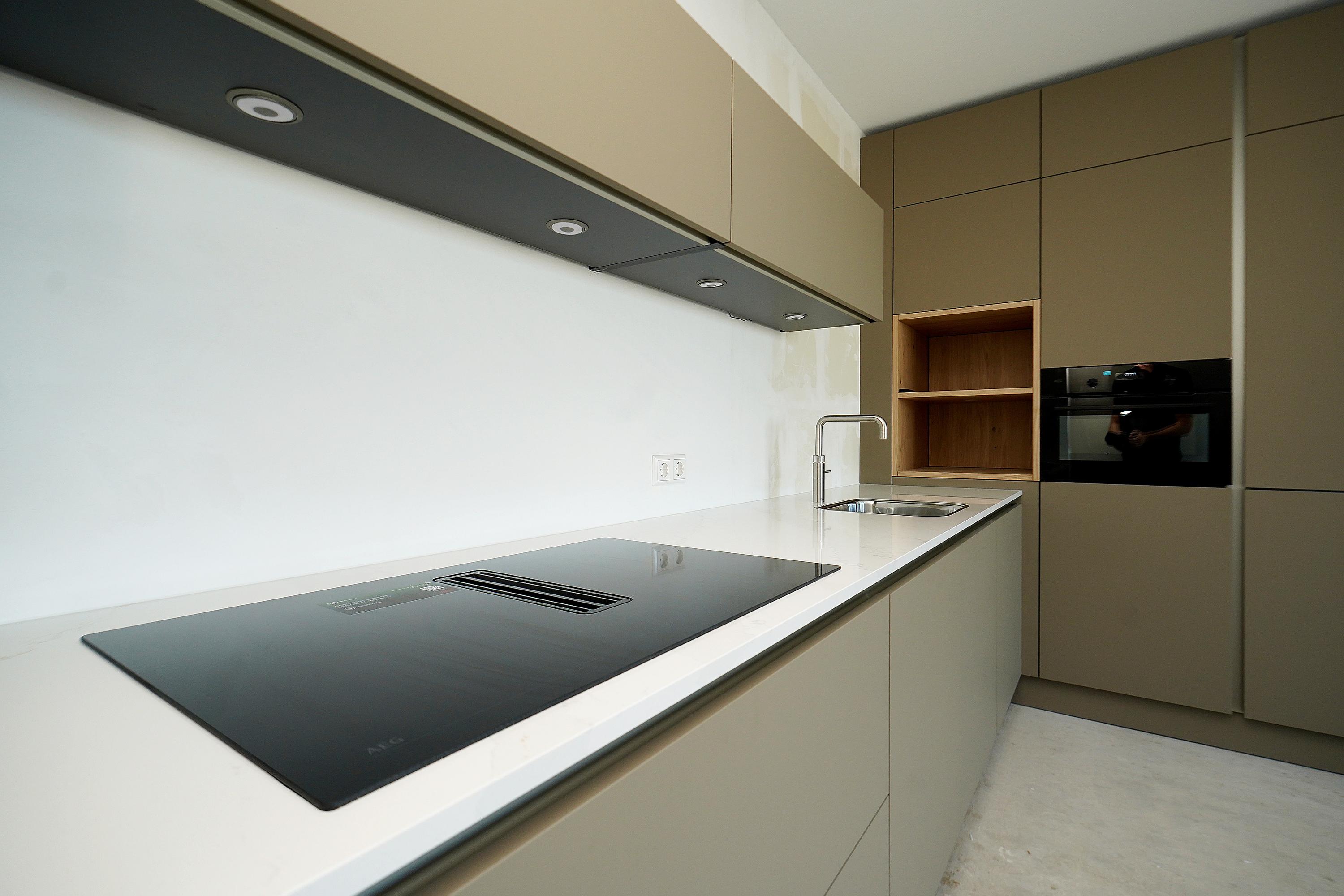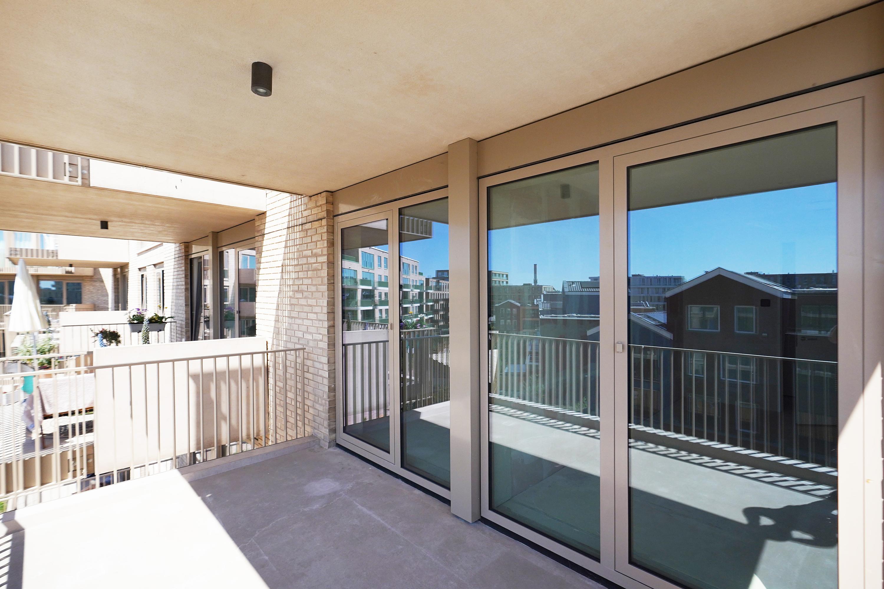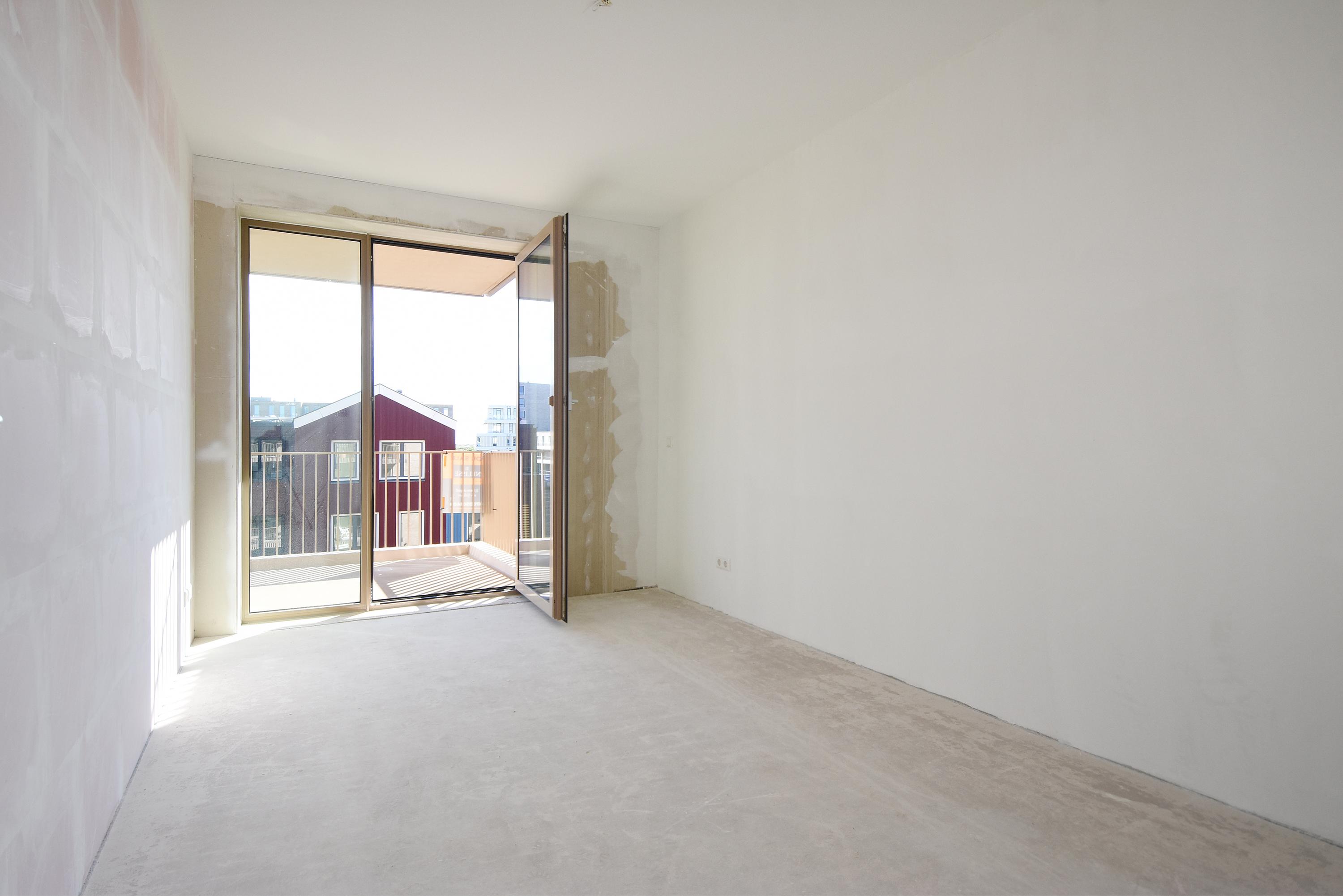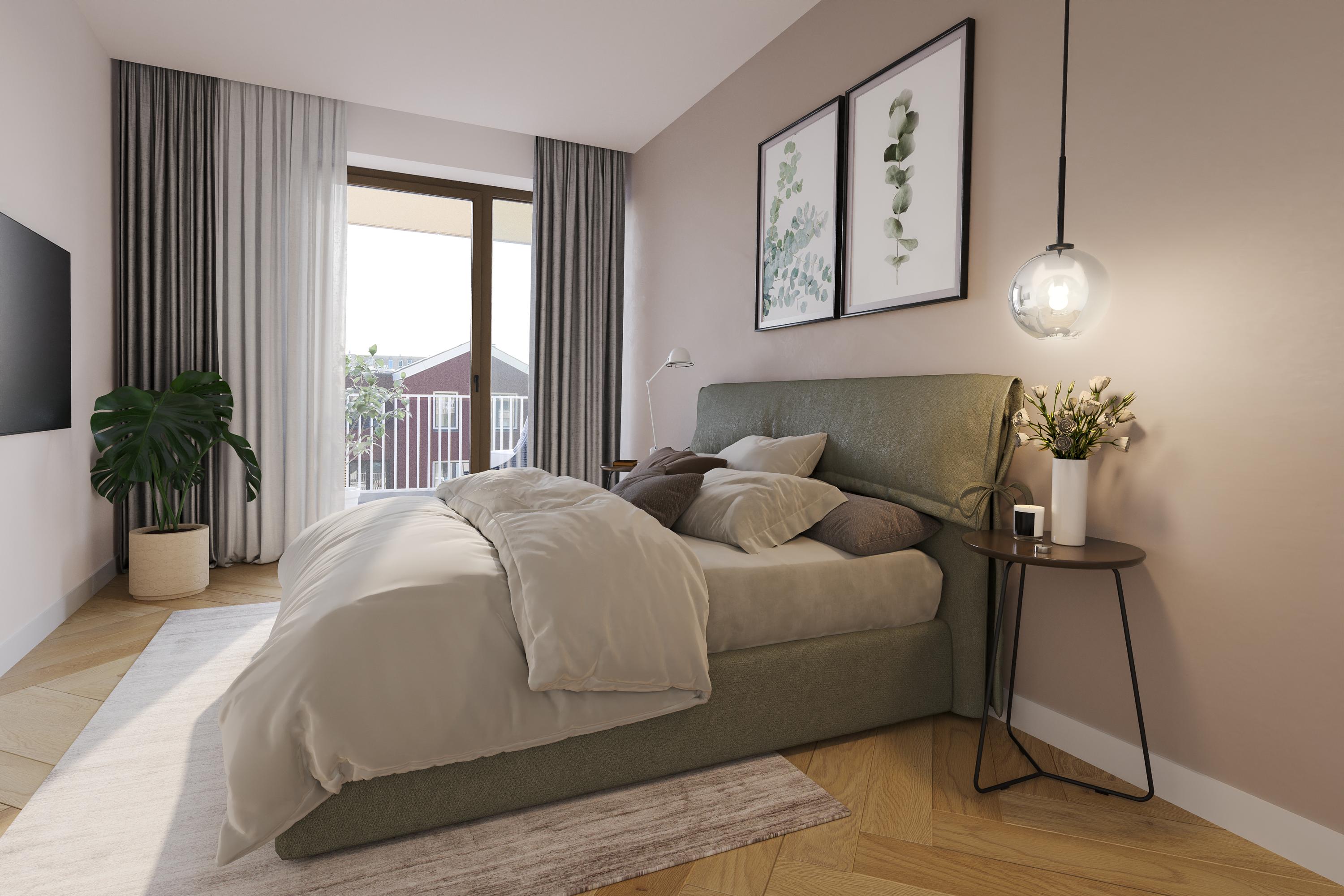 The open NEXT-125 kitchen, with a corner setup, is equipped with a composite countertop and built-in appliances: induction cooktop with integrated ventilation, dishwasher, fridge/freezer combination, Quooker, and combi oven. At the rear of the apartment, there are 2 bedrooms, both of which provide access to the spacious sun-drenched balcony on the south, overlooking the shared courtyard.
