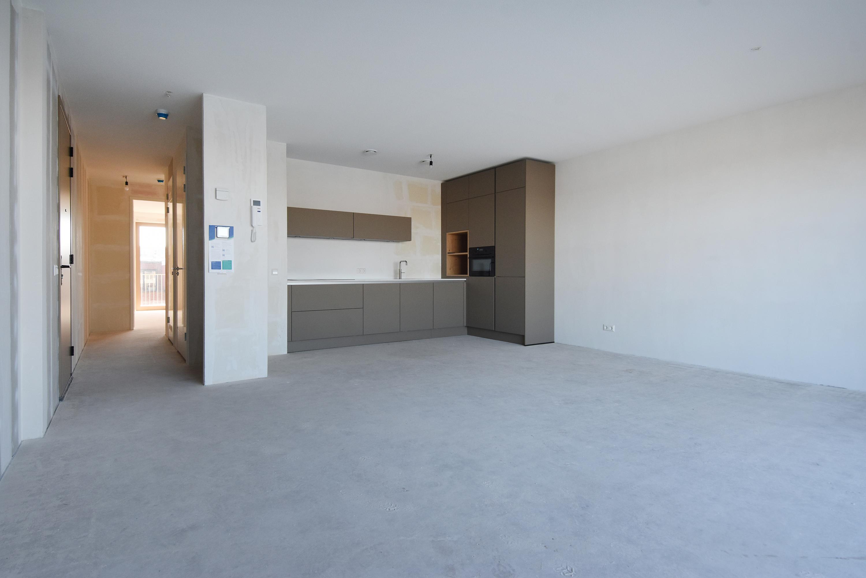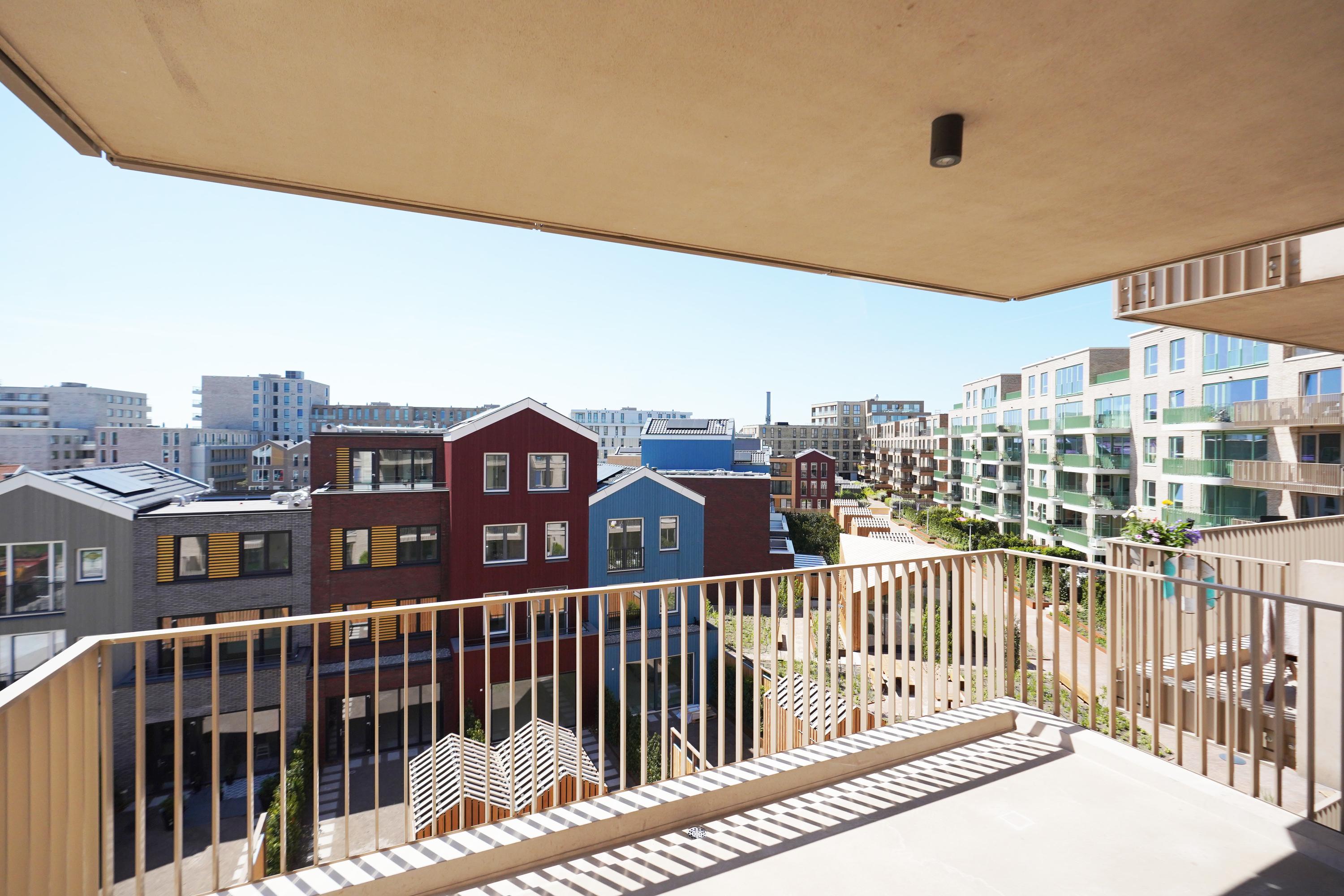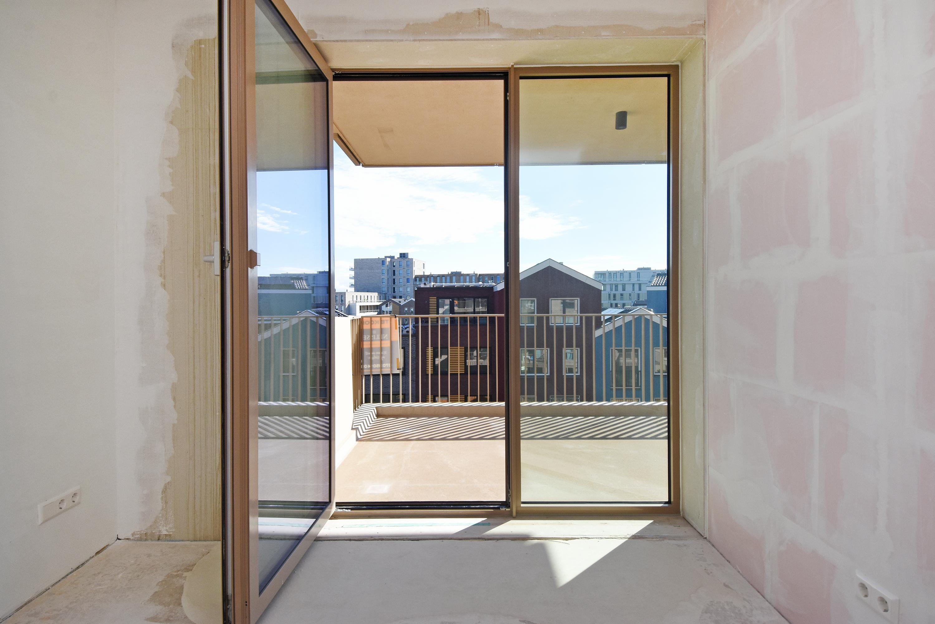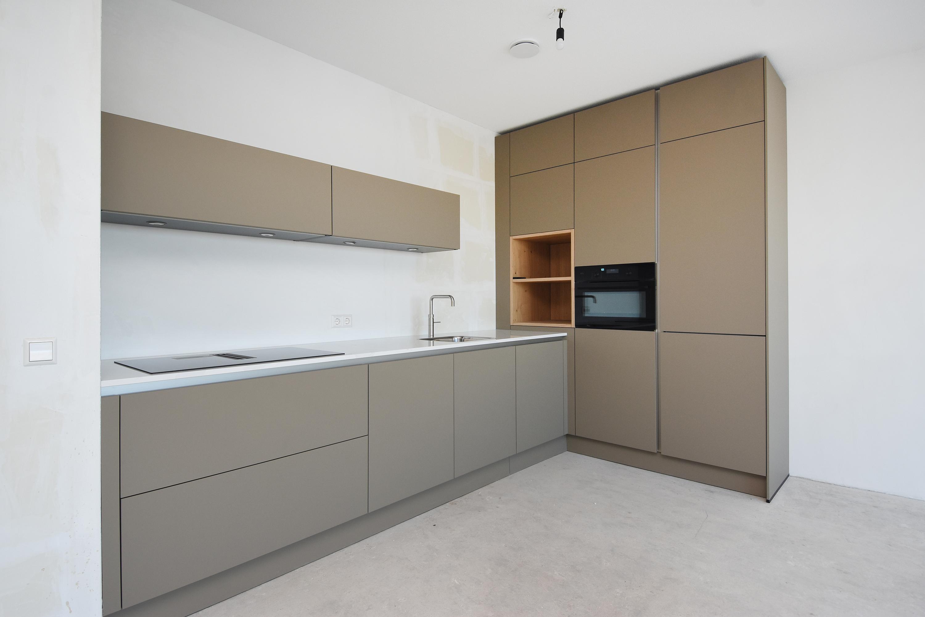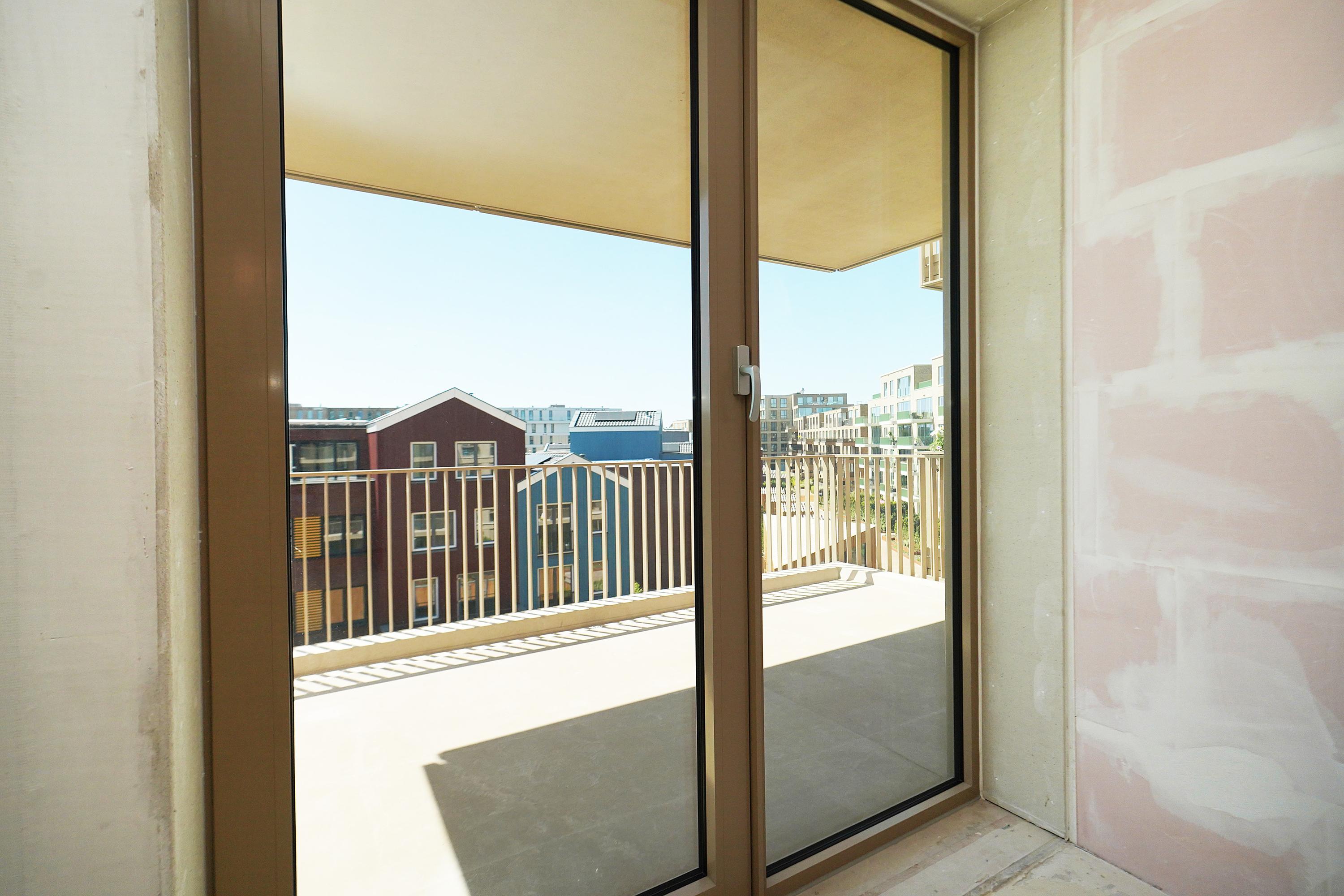 The open NEXT-125 kitchen, with a corner setup, is equipped with a composite countertop and built-in appliances: induction cooktop with integrated ventilation, dishwasher, fridge/freezer combination, Quooker, and combi oven. At the rear of the apartment, there are 2 bedrooms, both of which provide access to the spacious sun-drenched balcony on the south, overlooking the shared courtyard.