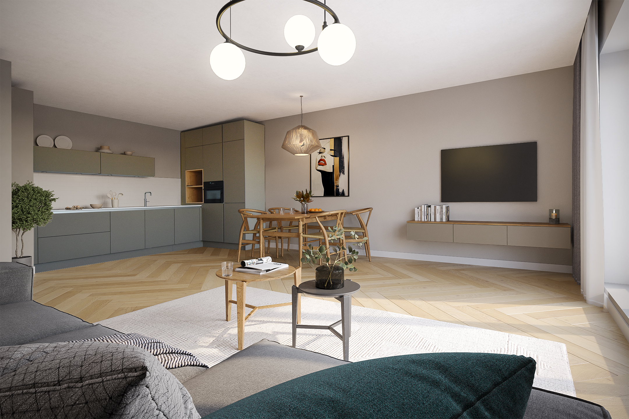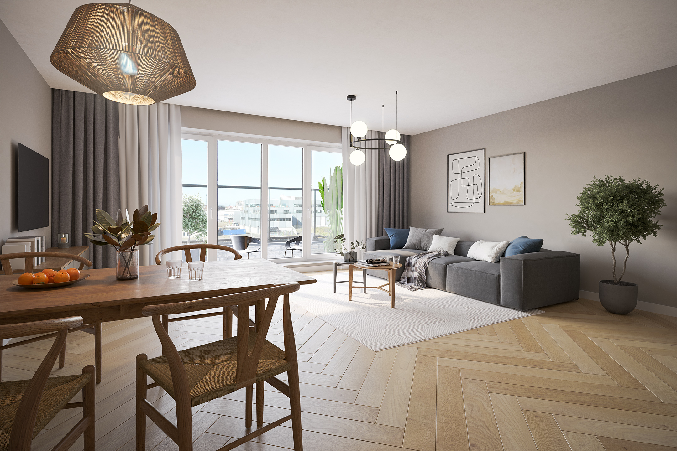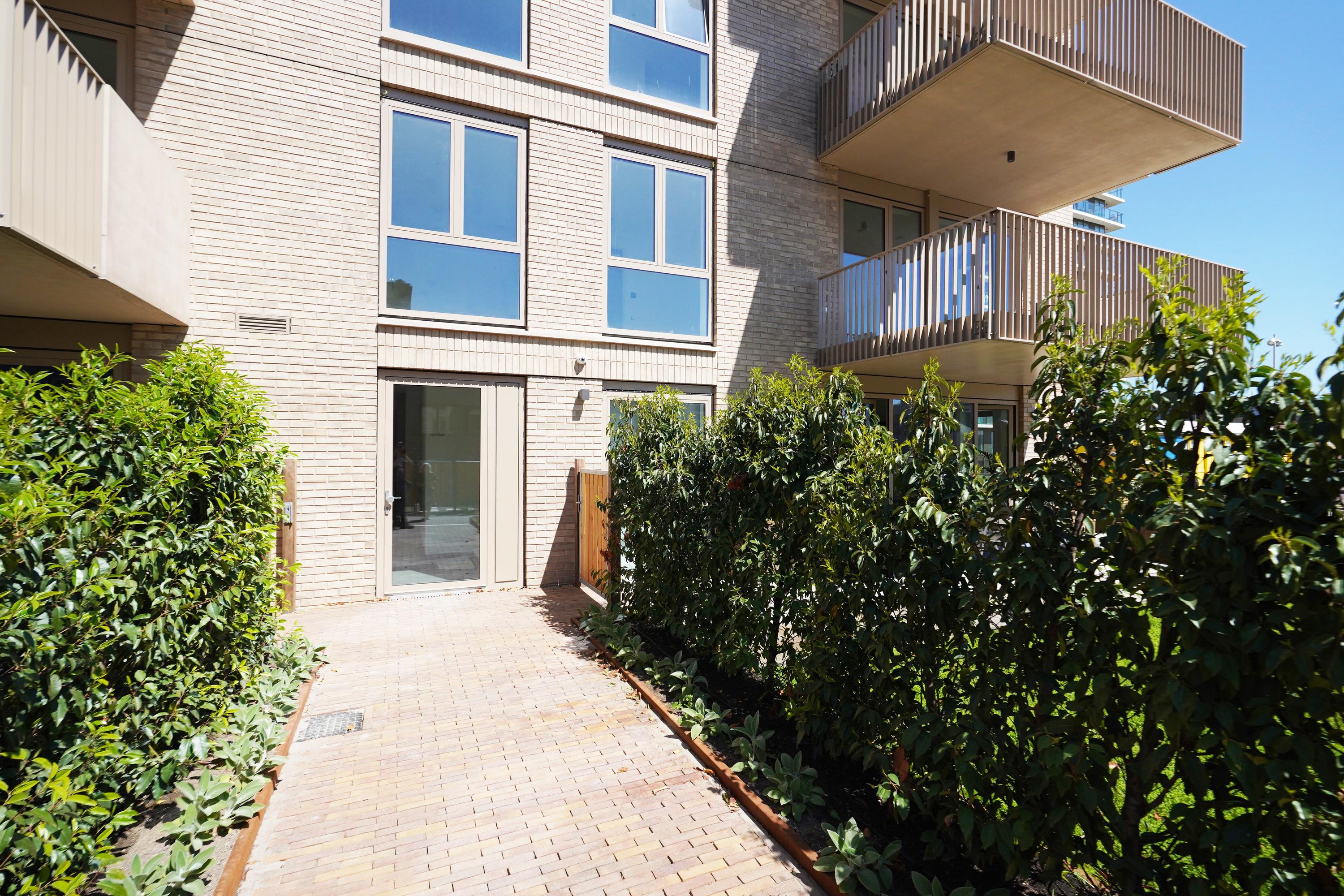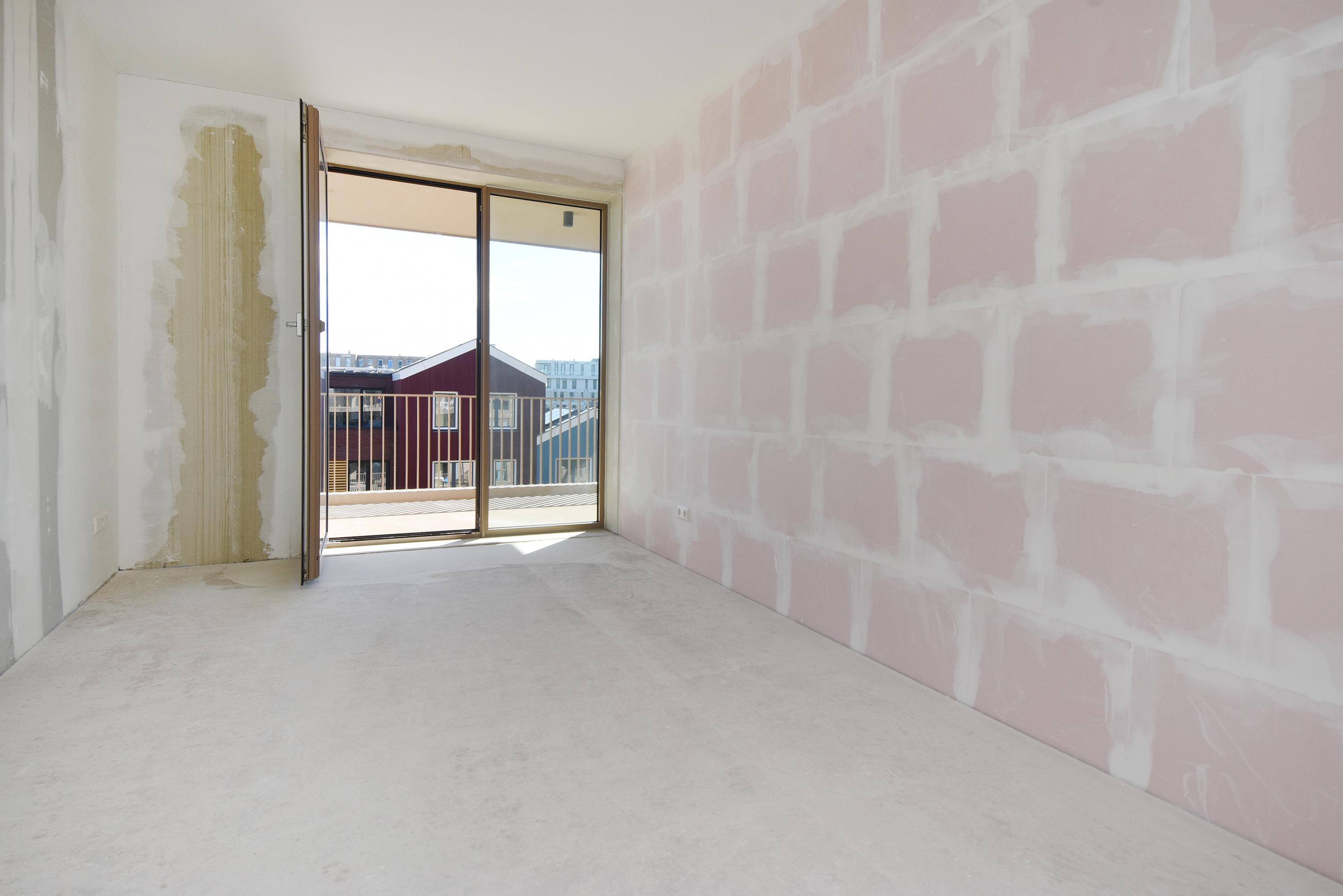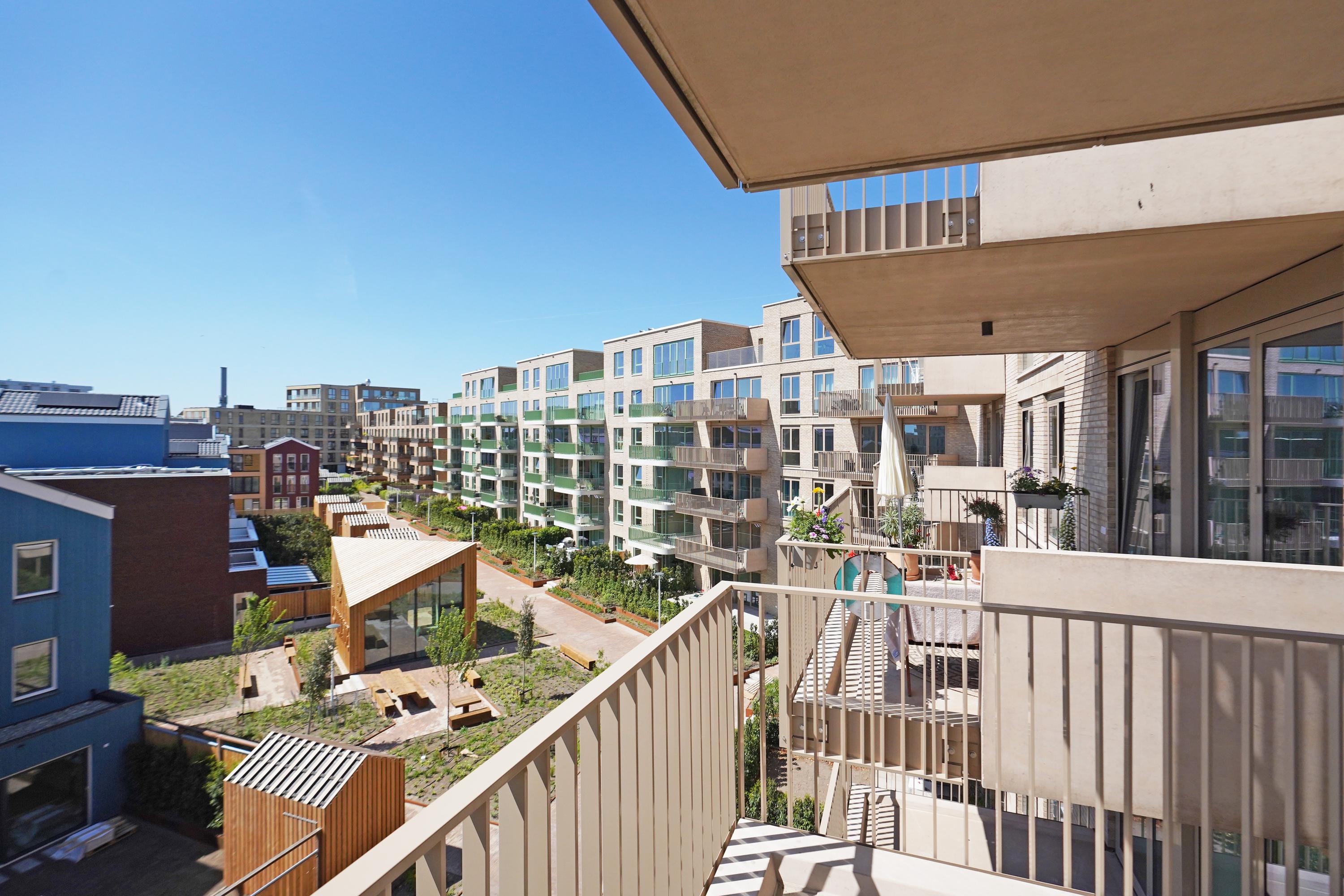 The open NEXT-125 kitchen, with a corner setup, is equipped with a composite countertop and built-in appliances: induction cooktop with integrated ventilation, dishwasher, fridge/freezer combination, Quooker, and combi oven. At the rear of the apartment, there are 2 bedrooms, both of which provide access to the spacious sun-drenched balcony on the south, overlooking the shared courtyard.