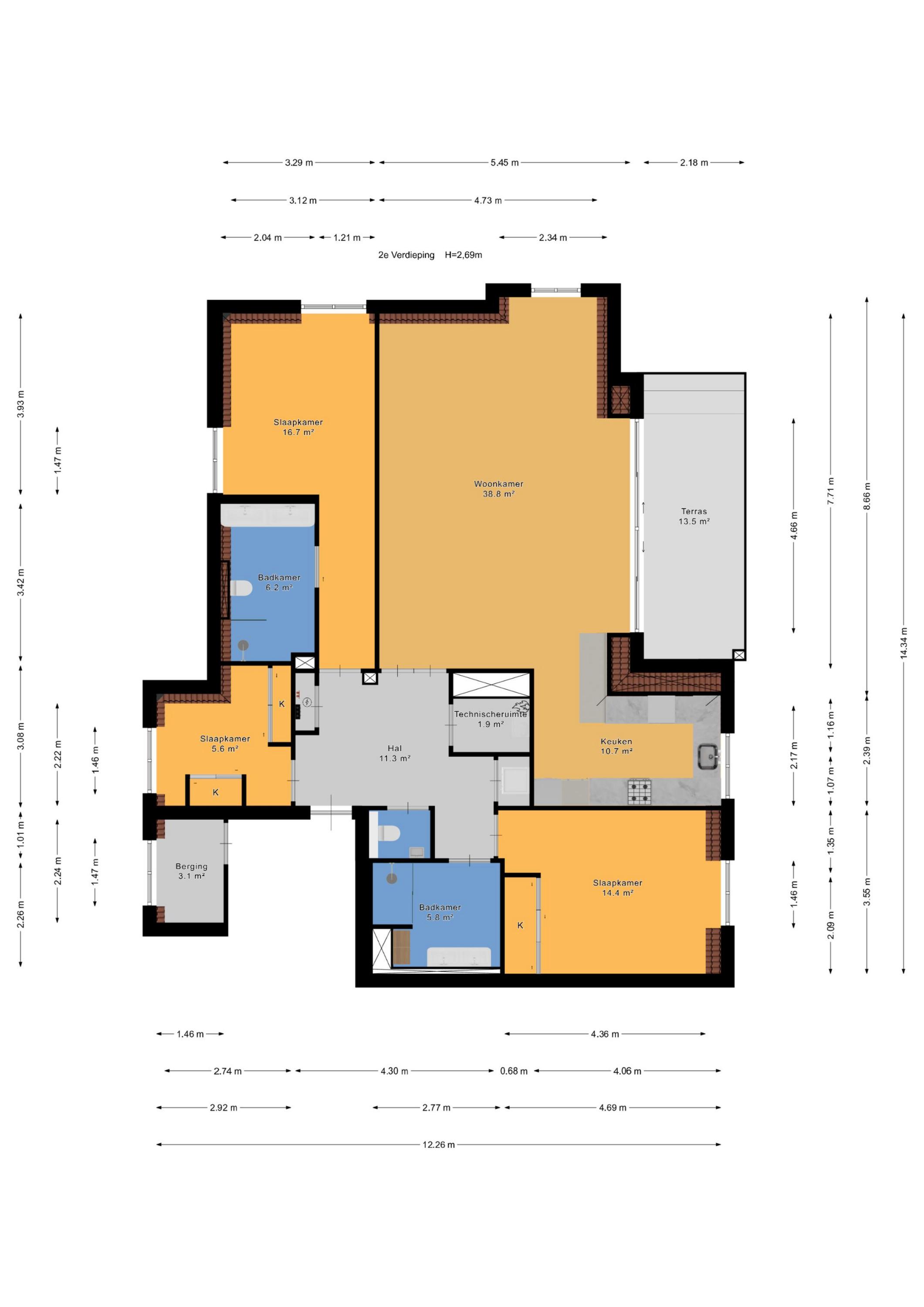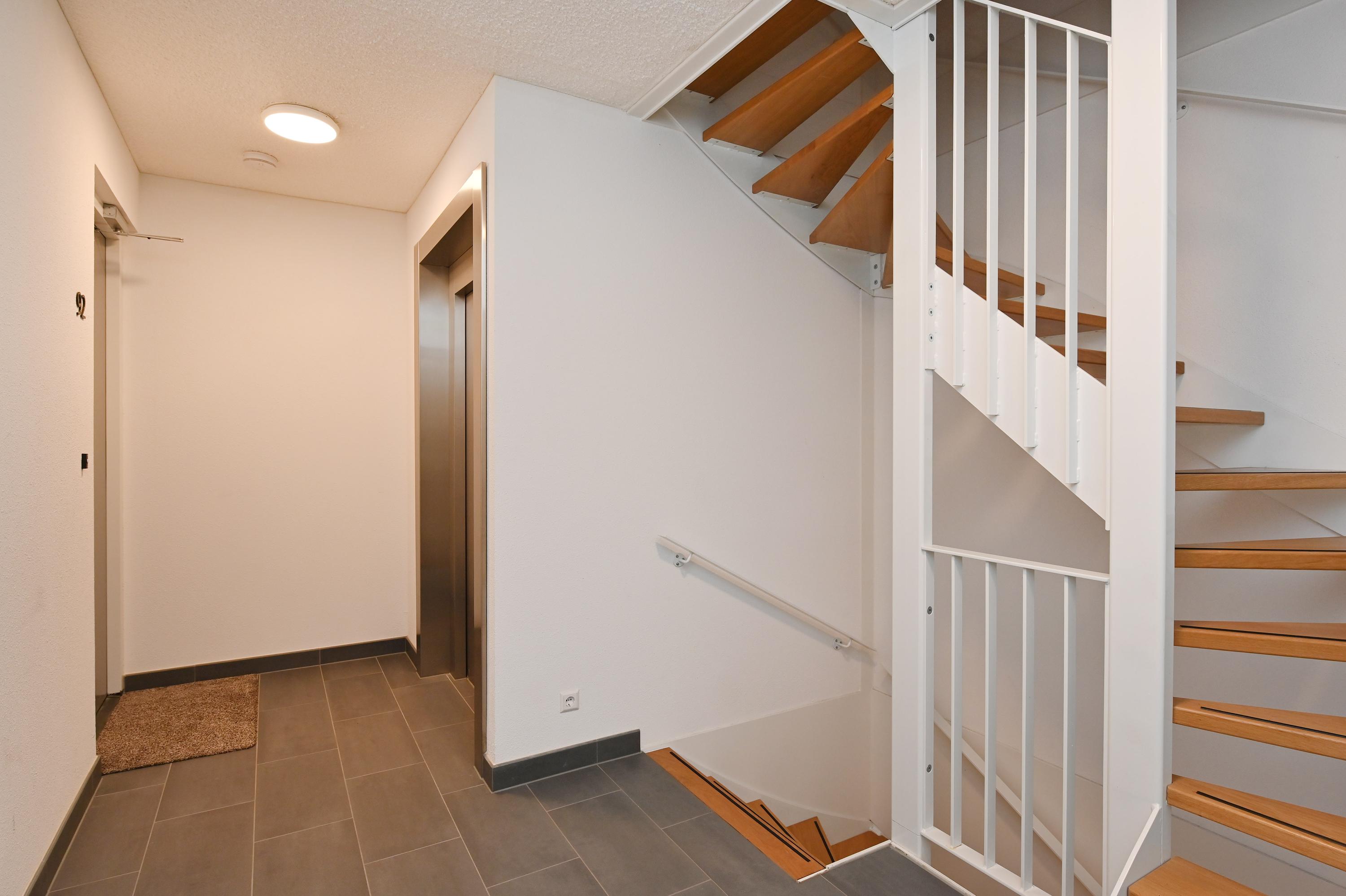Staircase with elevator, central hall, spacious and bright living room with an L-shaped Poggenpohl kitchen featuring modern built-in appliances (such as an induction hob, oven, and Quooker) and an adjoining seating bar. Through a double sliding door, the living room provides access to the spacious terrace (approx. 13.5 m²) with afternoon and evening sun, unobstructed views, and modern finishes. Spacious master bedroom with an en-suite bathroom featuring a rain shower, toilet, and double sink. 2nd spacious bedroom with built-in wardrobe and 3rd bedroom with built-in wardrobes. Both of these bedrooms can also be used as office or hobby spaces. Modern and spacious bathroom with rain shower, double sinks, and mirror lighting. Separate toilet in the hallway.