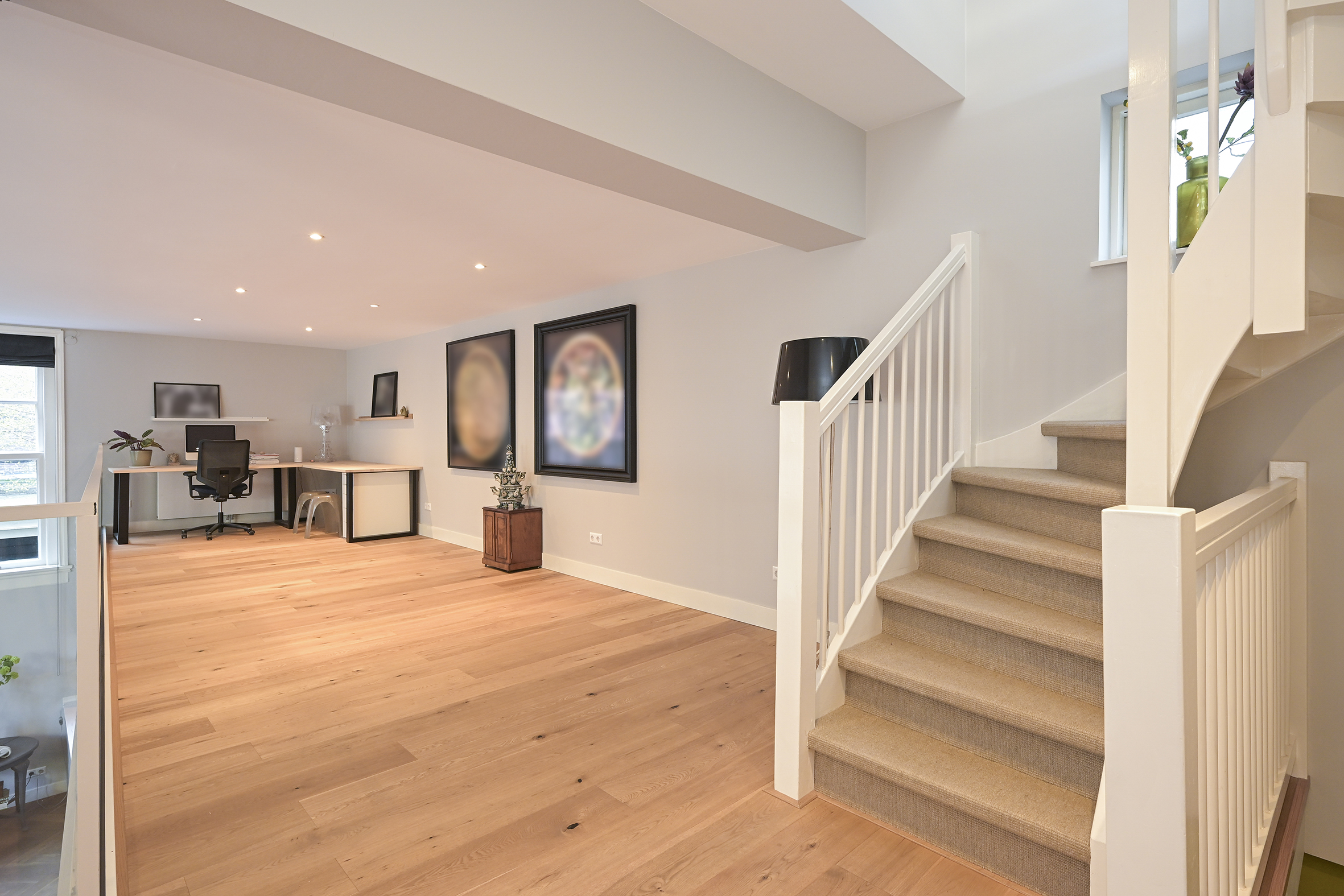 The first floor comprises a large L-shaped loft that can be used in various ways. Currently, two wonderfully bright workspaces are located here, but if additional bedrooms are needed, they can be created.