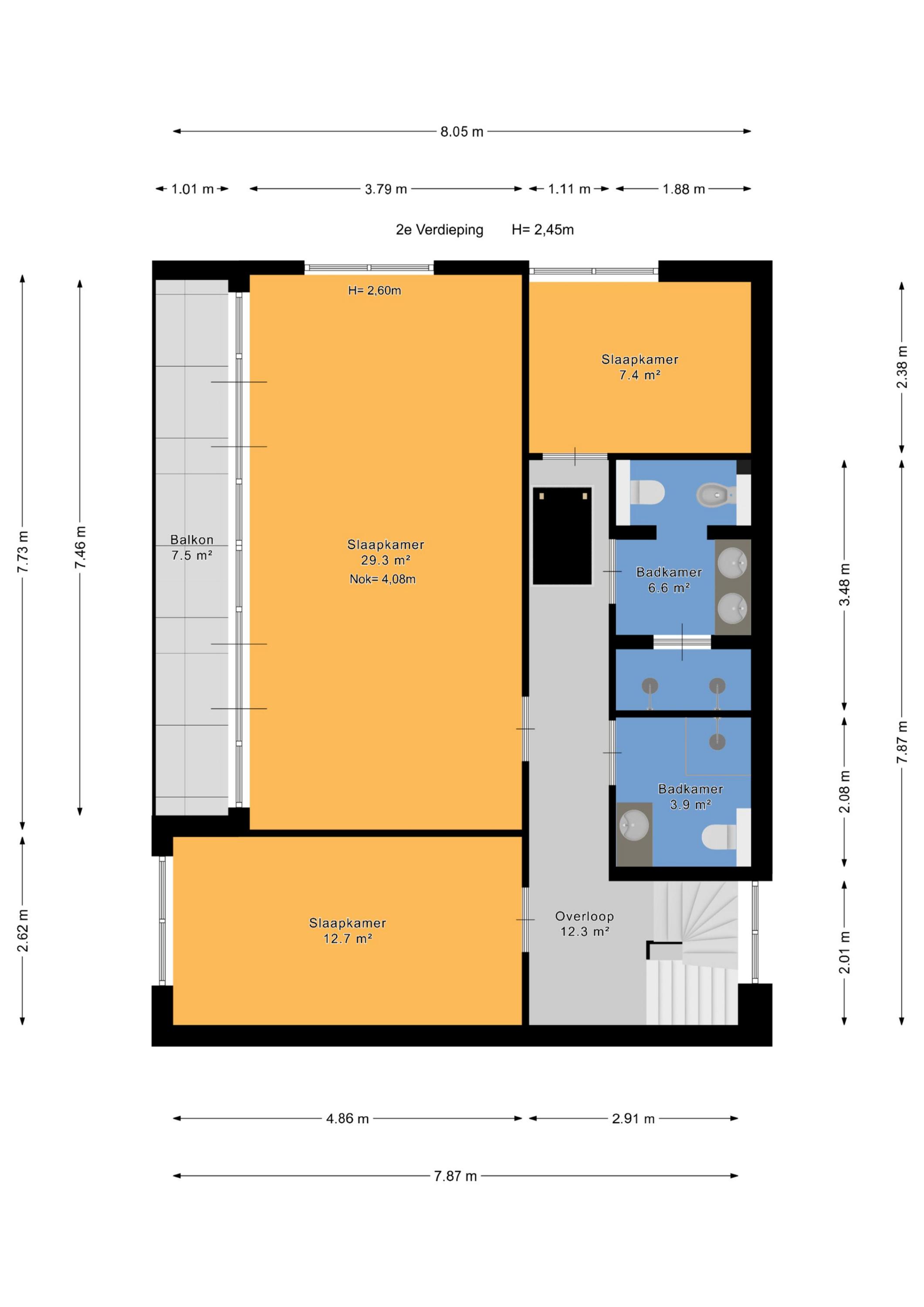 De 2e verdieping telt een drietal slaapkamers, een ruim zonnig balkon en twee moderne badkamers. De hoofdslaapkamer heeft eveneens een loft achtige uitstraling met de spanten in het zicht. Vanuit de gang is er een vliering bereikbaar waar een WTW-systeem staat en er is een vaste trap naar het zonnige dakterras met fraai vrij uitzicht over Den Haag.