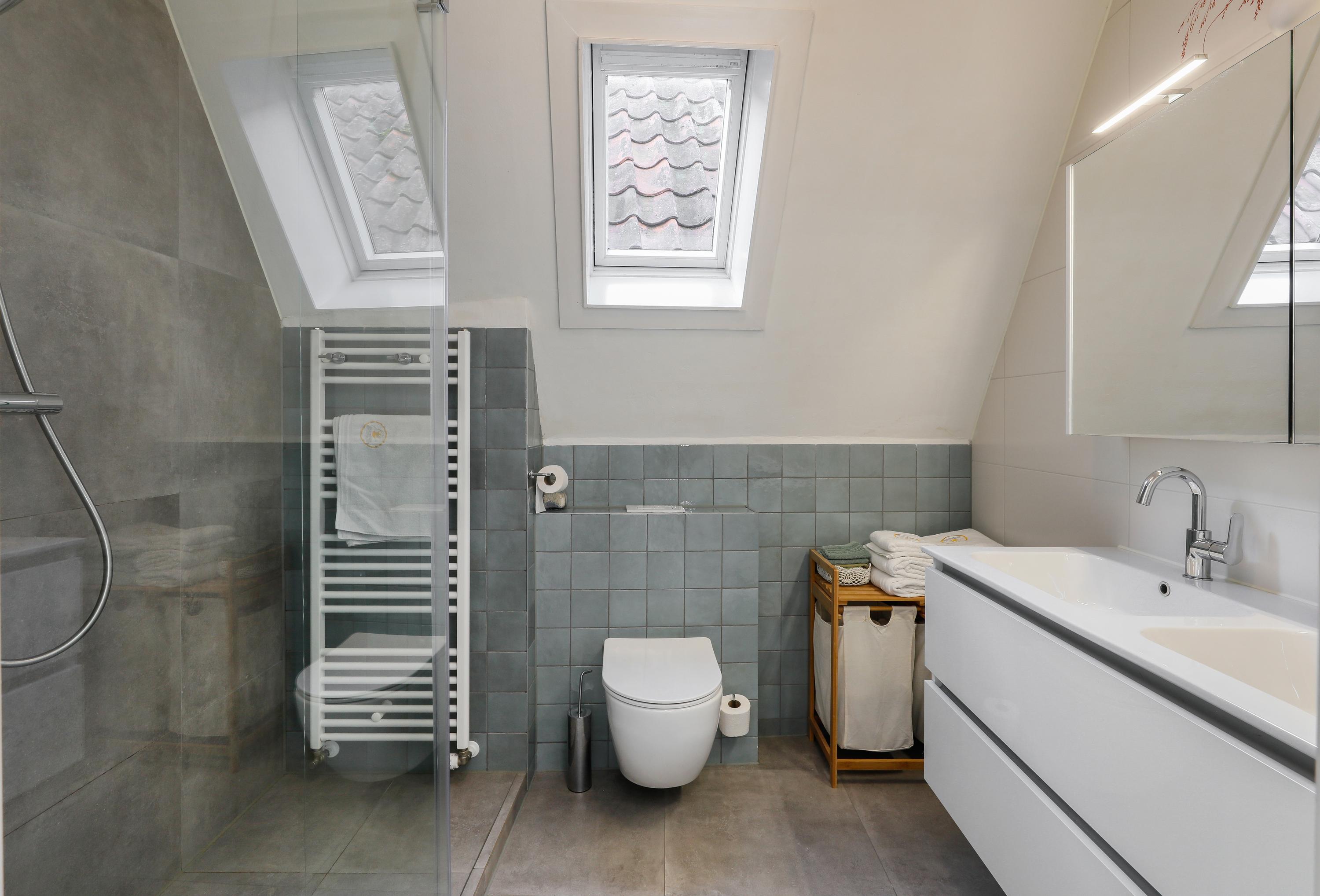 The bathroom was fully renovated in 2024 and includes a walk-in shower, double washbasin, toilet and designer radiator.