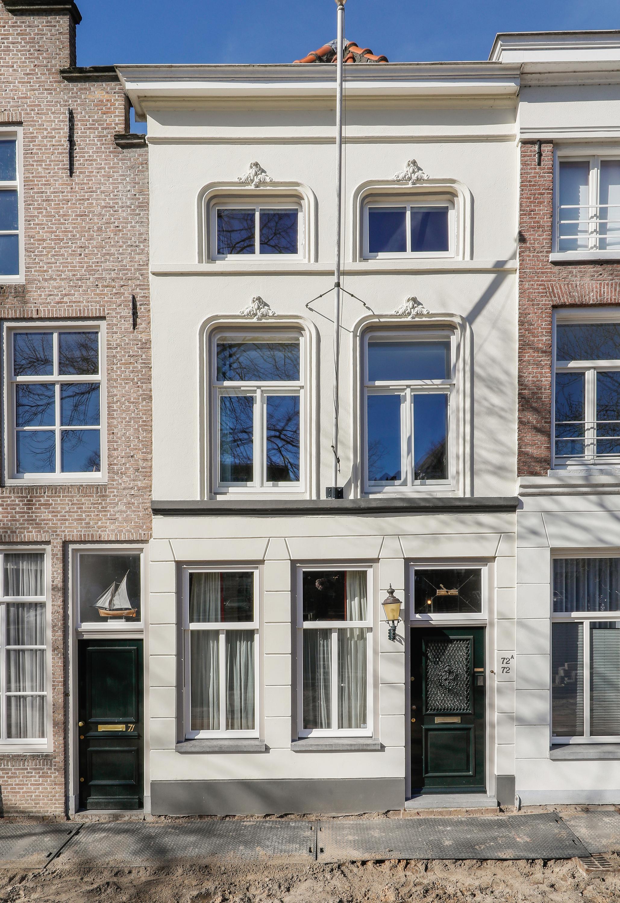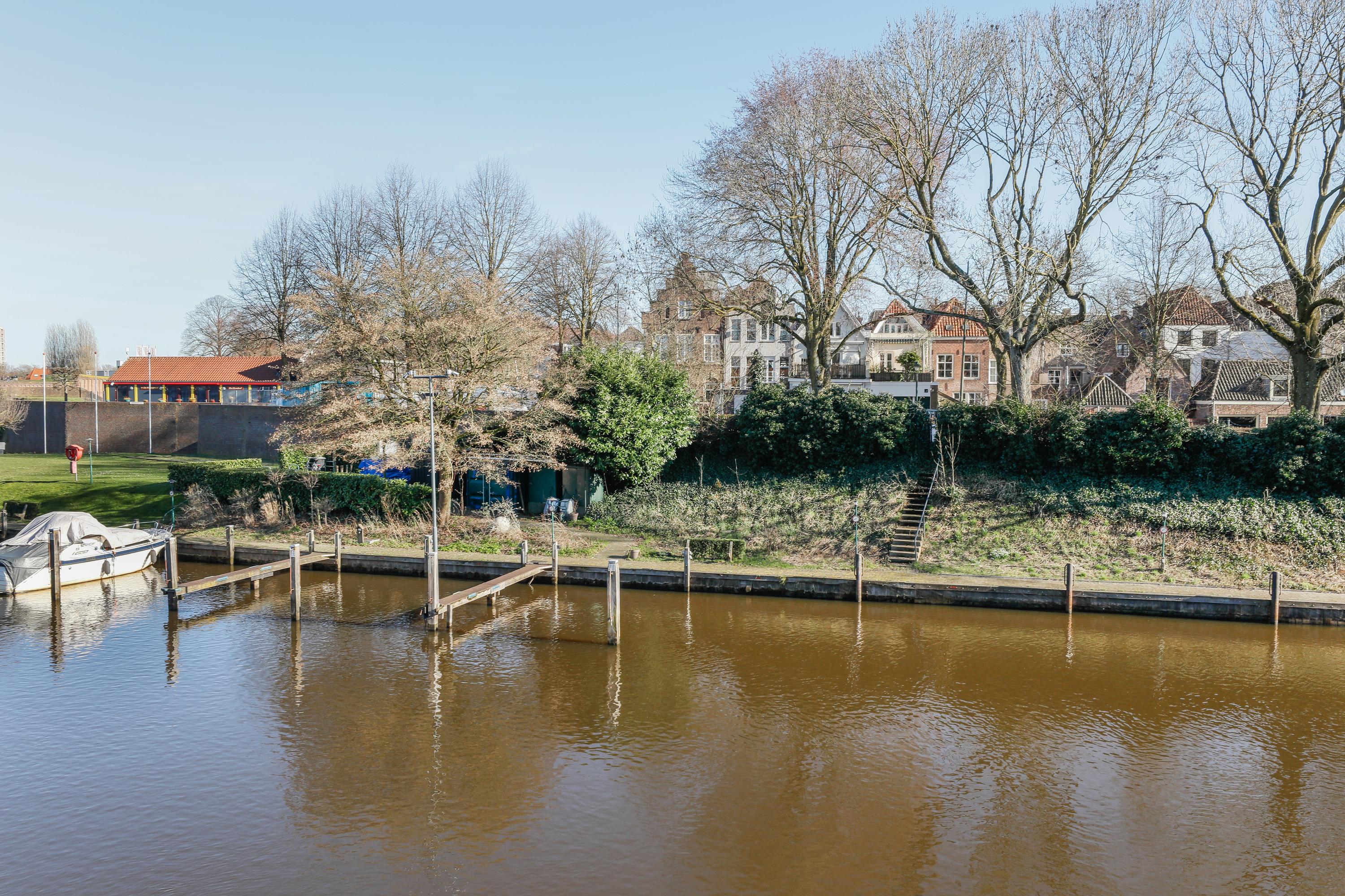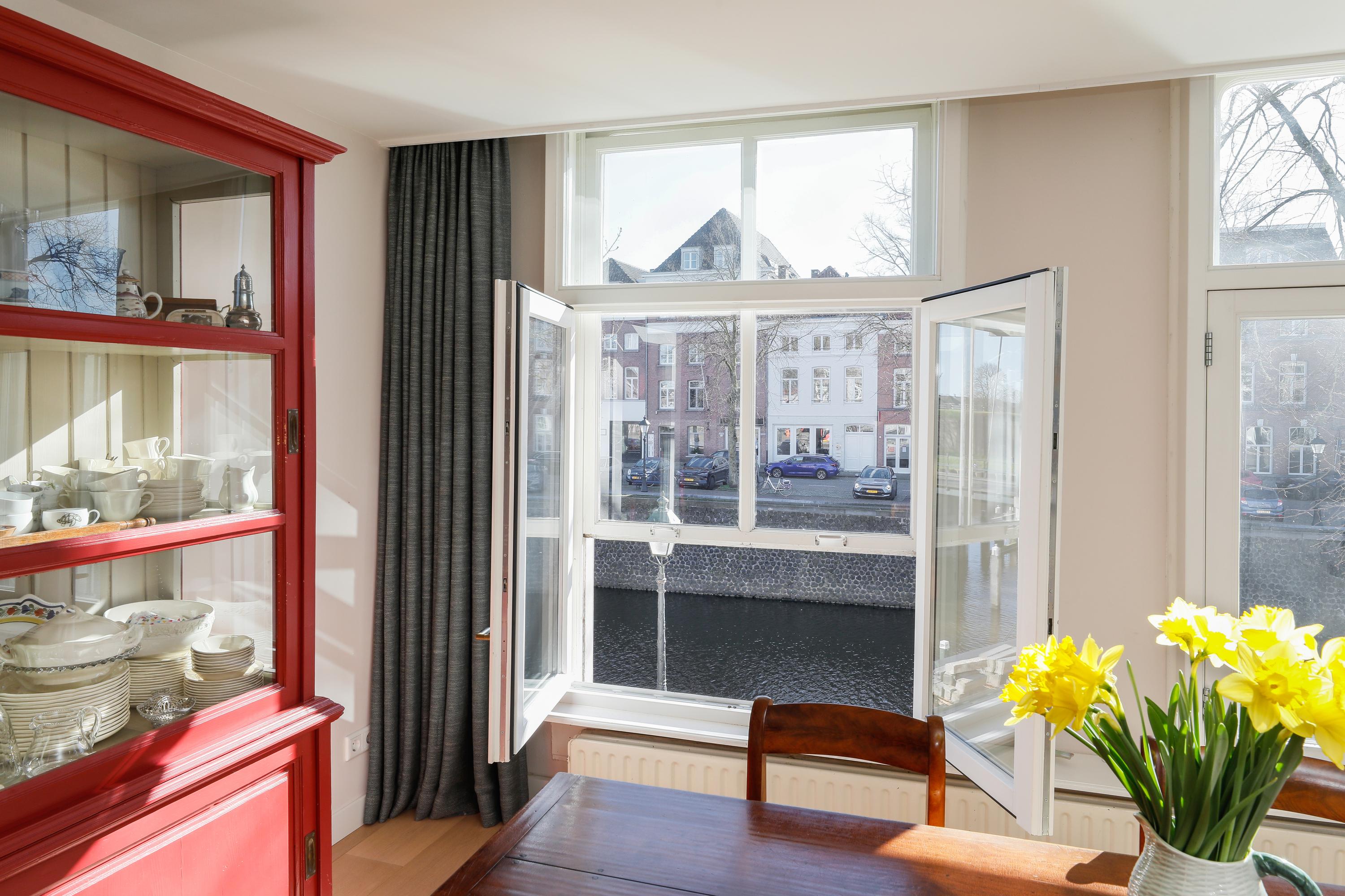 Live in one of the most beautiful locations in Den Bosch's city center, with water at both the front and back. This charming townhouse, dating from around 1670, features two living rooms, two roof terraces, a private garage, an elevator, and a beautiful view of the Brede Haven.