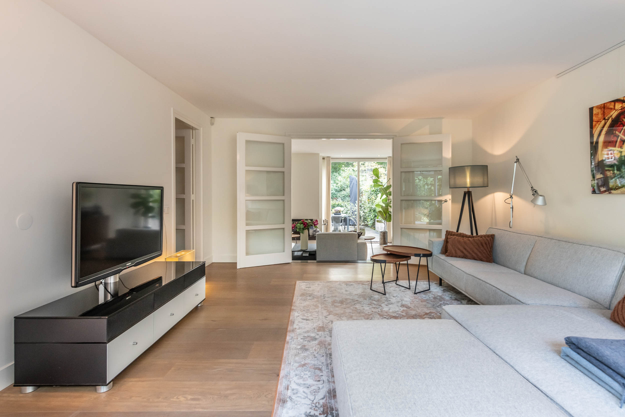 Entrance hall, spacious hallway with toilet and urinal, bright and spacious living room with fireplace, oak flooring and doors to the front terrace. A double door connects to the second living room/TV room with large windows and a view of the back garden. Luxurious, tailor-made kitchen-diner (’t Spant in Heemstede, 2022) featuring underfloor heating, a sink/kitchen island and various built-in appliances: wine climate cabinet, ovens, Quooker with sparkling water feature, coffee machine, Bora electric hob with flex zones and dishwasher. Door to the side garden.