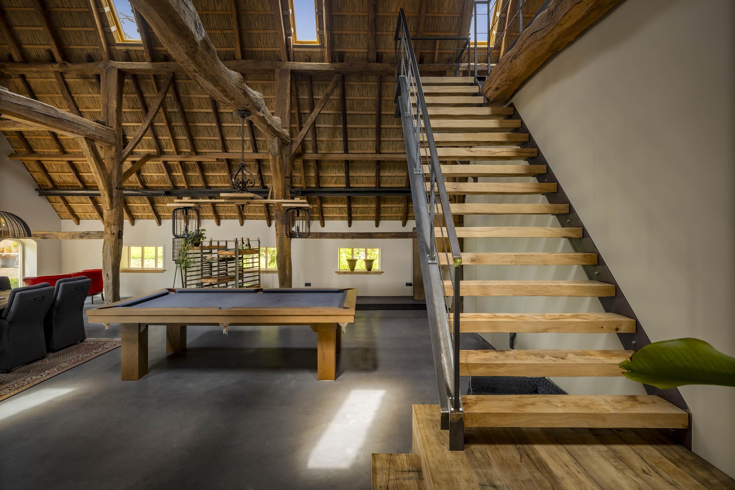 The part, where the cows used to ruminate, has been transformed into a super cool space; the rafters and the thick reed package (there is still insulation material in between) have been left in sight and the space is nice and light through the skylights. The concrete floor - ready for the installation of floor heating -, the beautiful loam stove and the staircase (forge Oldenhave from Vorden) give it a raw, industrial edge. Downstairs, two separate toilets have been installed. Upstairs, the billiard room will be realized.