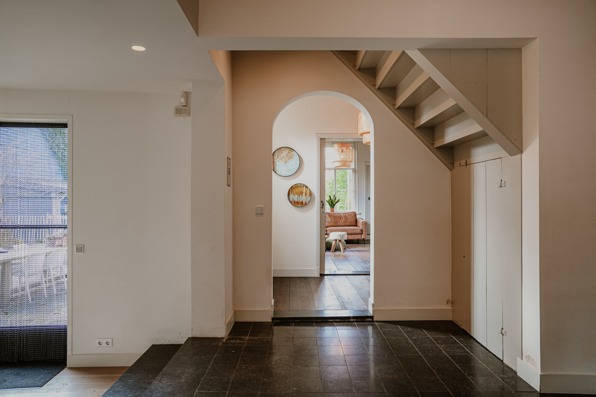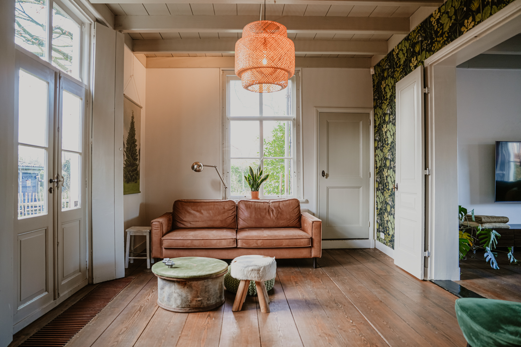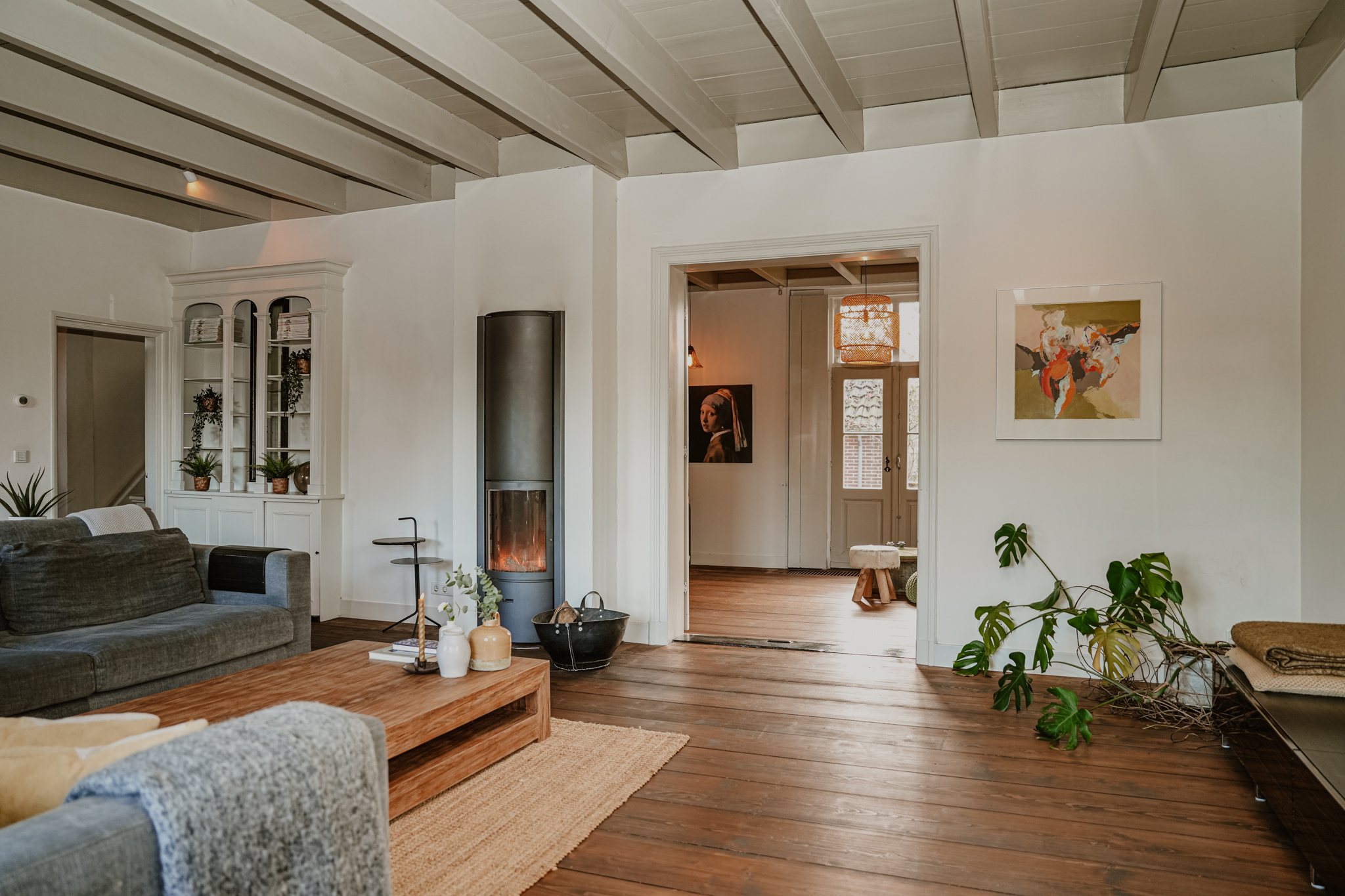 Centrale hal met aan de rechterzijde de voormalige gelagkamer. De antieke toogkast is een stille getuige van een ver verleden. De kamer is momenteel in gebruik als woonkamer, maar leent zich goed als werkruimte, atelier of studio. Er is een hoog balkenplafond, brede vloerdelen en hoge 6-ruits vensters zijn voorzien van Ruysdael monumentenglas, geflankeerd door binnenluiken. Er zijn tijdloze Jaga convectoren toegepast en een luxe Stuv haard zorgt voor maximaal comfort. Antieke paneeldeuren leiden naar de aangrenzende tuinkamer.