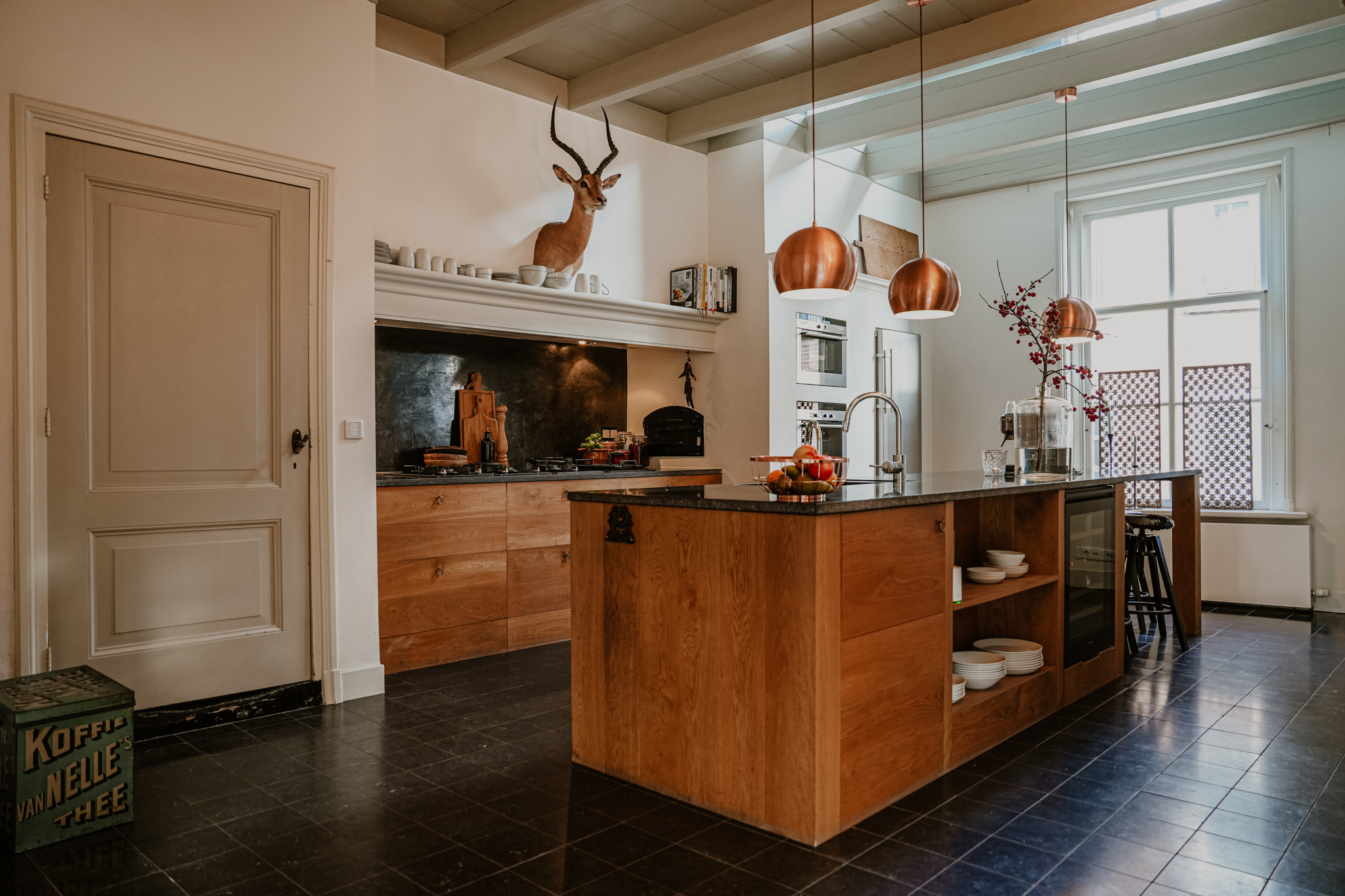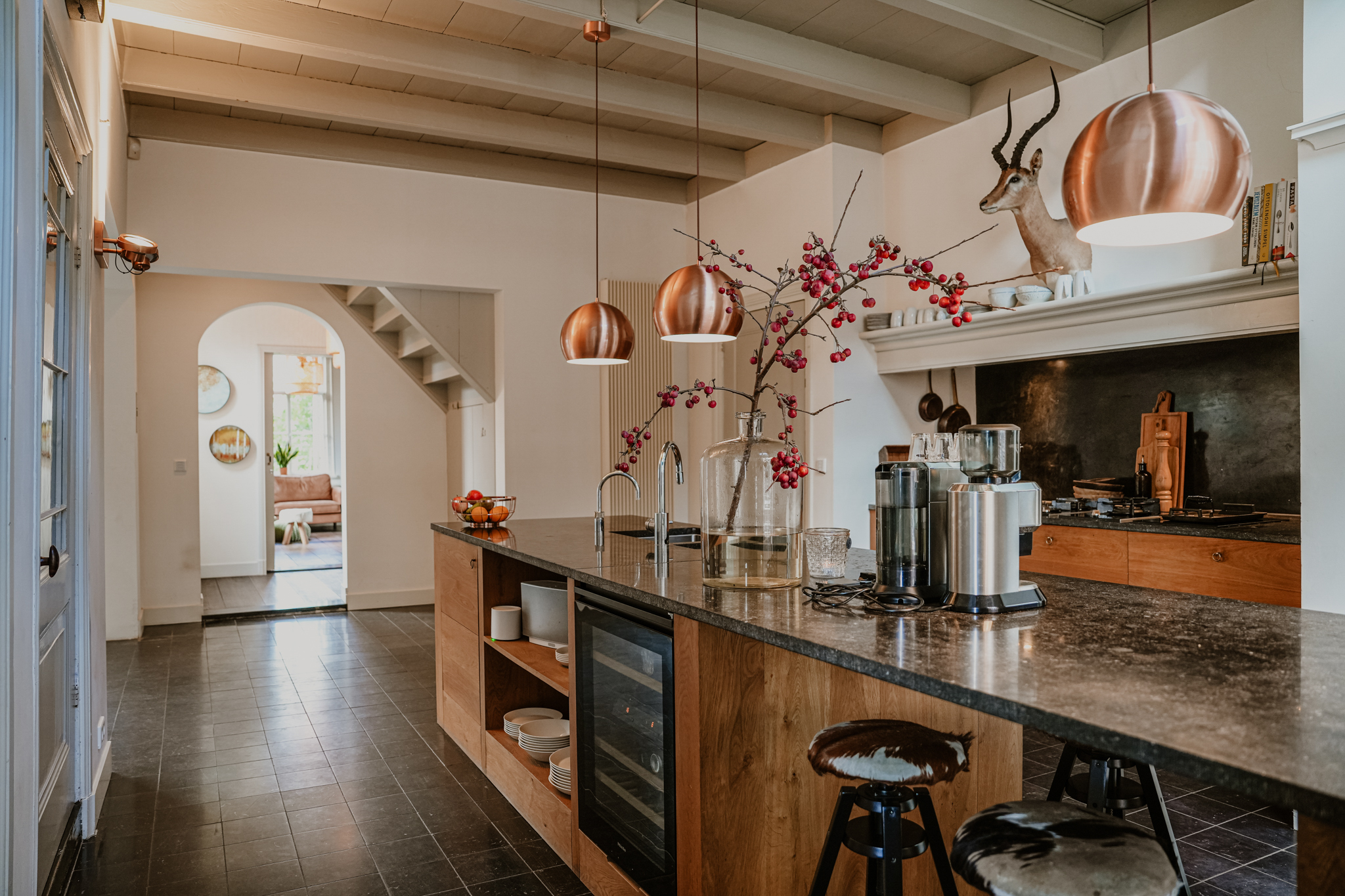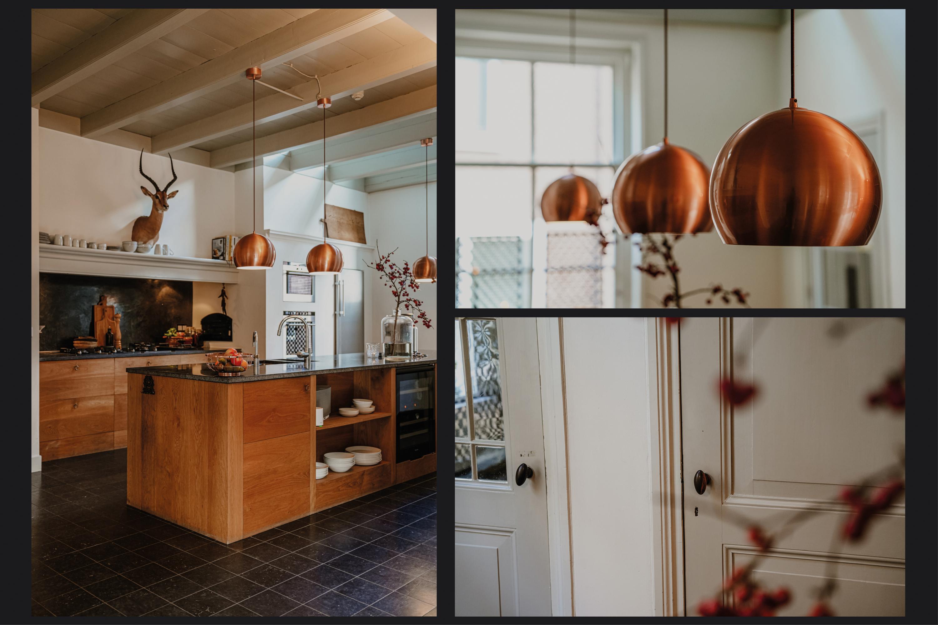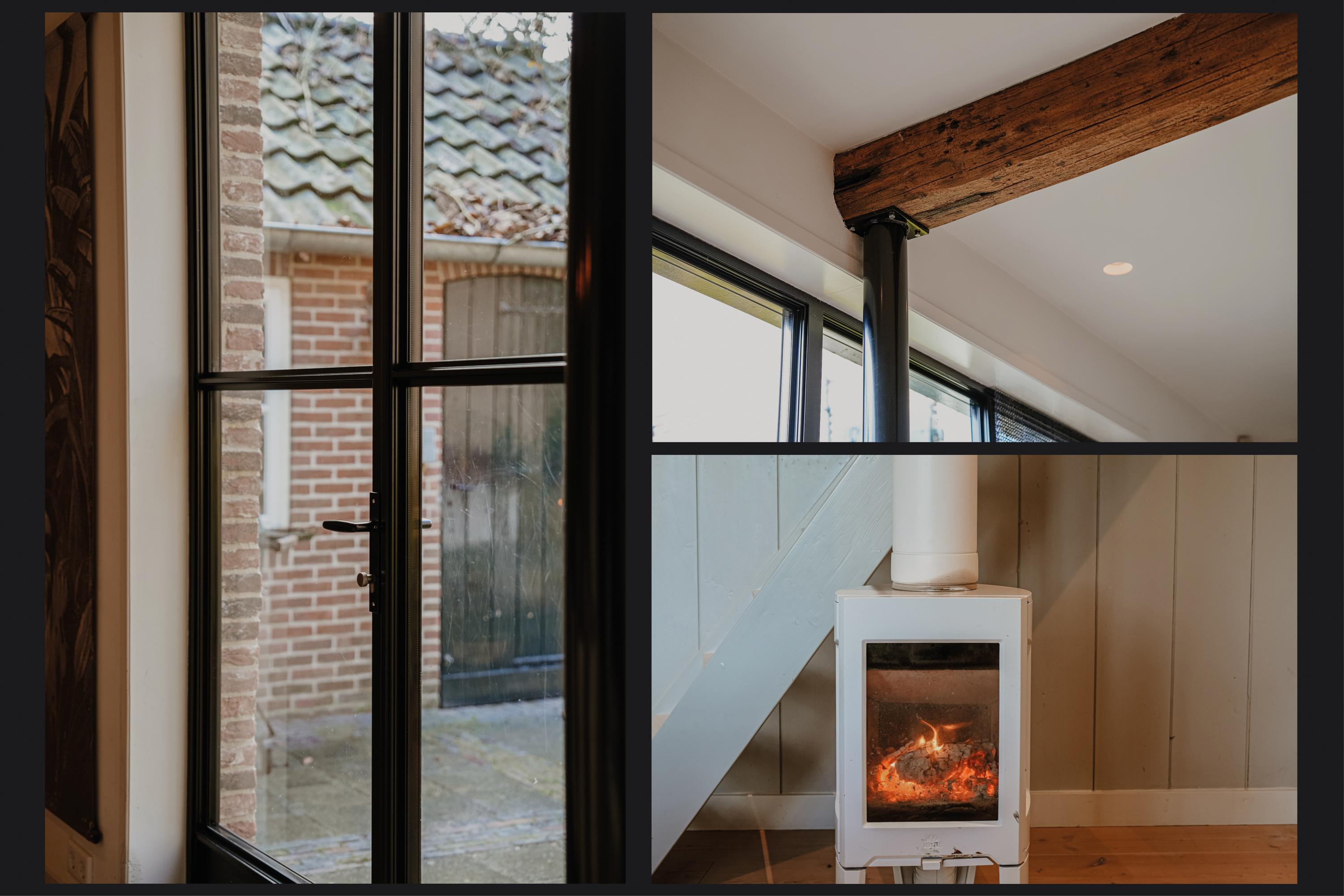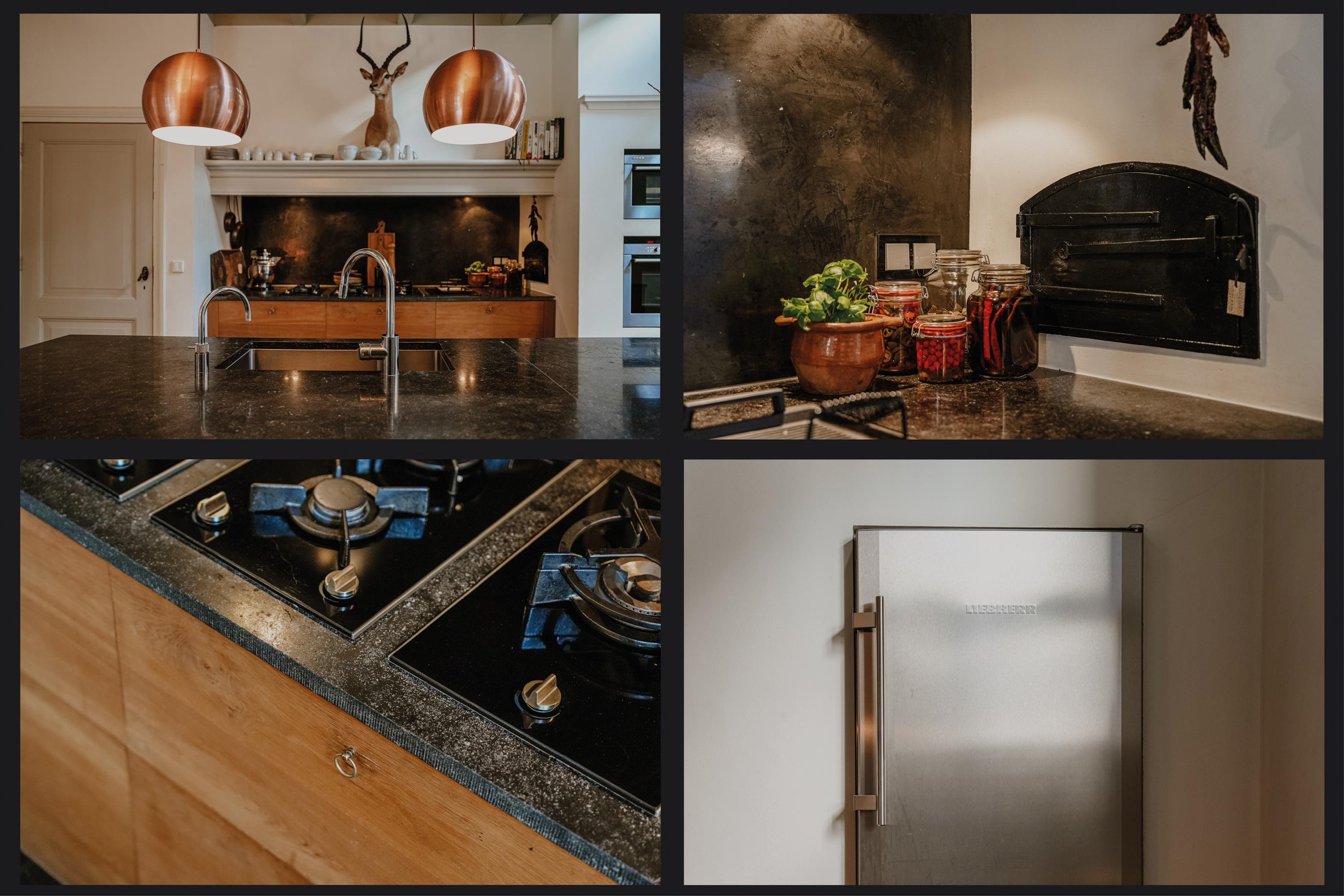 De tuinkamer beschikt over dubbele deuren naar de tuin, die zijn voorzien van binnenluiken. De houtkachel is aangesloten op de cv en de vloer is ook hier belegd met brede vloerdelen. Aan de tuinkamer grenst een ruime toiletruimte met voorportaal. De tuinkamer staat via een werkruimte in contact met de woonkeuken. De keuken is voorzien van een luxe houten keuken met een groot werkeiland en een natuurstenen werkblad met gefrijnde rand. Onder de antieke schouw is royaal ruimte om te wokken, grillen of koken. In de keuken is een deel van het plafond in veiligheidsglas uitgevoerd, zodat er niet alleen licht via het keukenraam binnenvalt, maar ook via het raam op de overloop. Aan de keuken grenzen twee opkamers, waarvan er één in gebruik is als provisieruimte en de andere als werkkamer. Onder de opkamers bevindt zich de wijnkelder. De keuken vormt een visuele eenheid met de aangrenzende eetkamer; een heerlijke leefruimte met houtkachel. Via de geïsoleerde, zwartstalen pui is volledig zicht op de tuin, waarin een imposante beuk de blikvanger is. Aan de eetkamer grenst een praktische bijkeuken en een achterhal met tweede toilet. Vanuit de achterhal is toegang tot de voormalige paardenstal die momenteel in gebruik is als (fietsen)berging. Het aangebouwde verwarmde bakhuis beschikt over aansluitingen van gas, water, elektra en riolering.