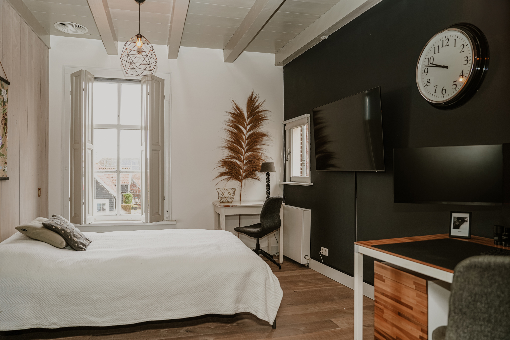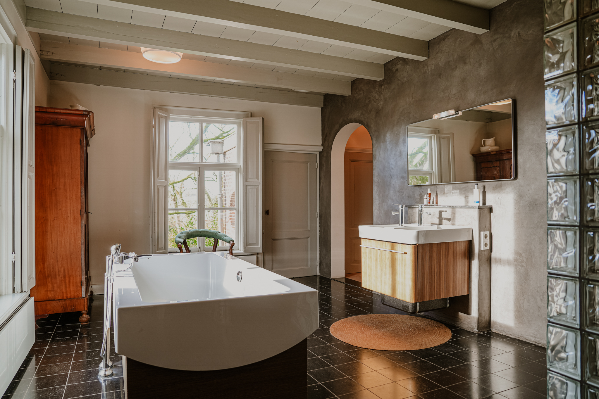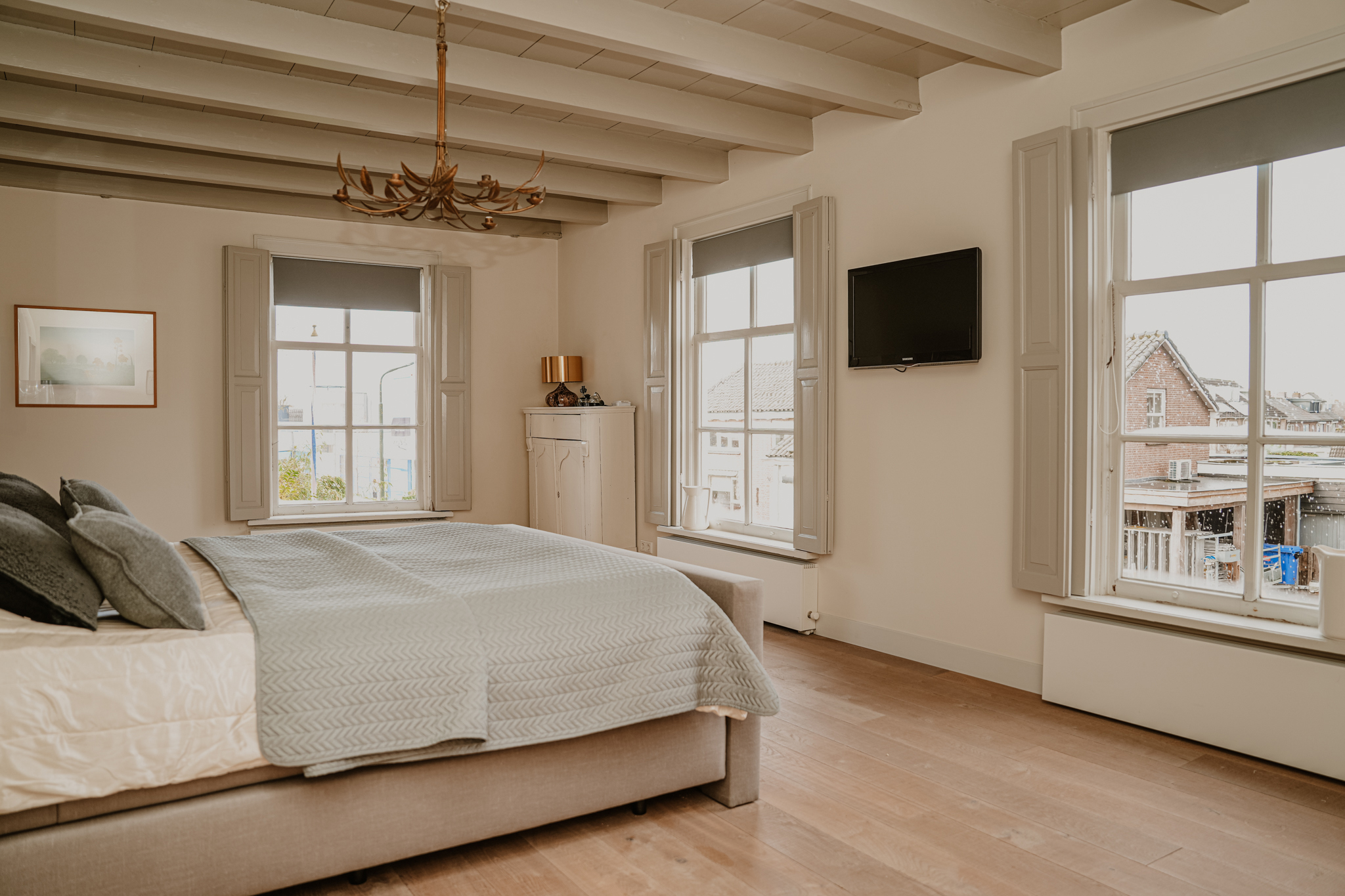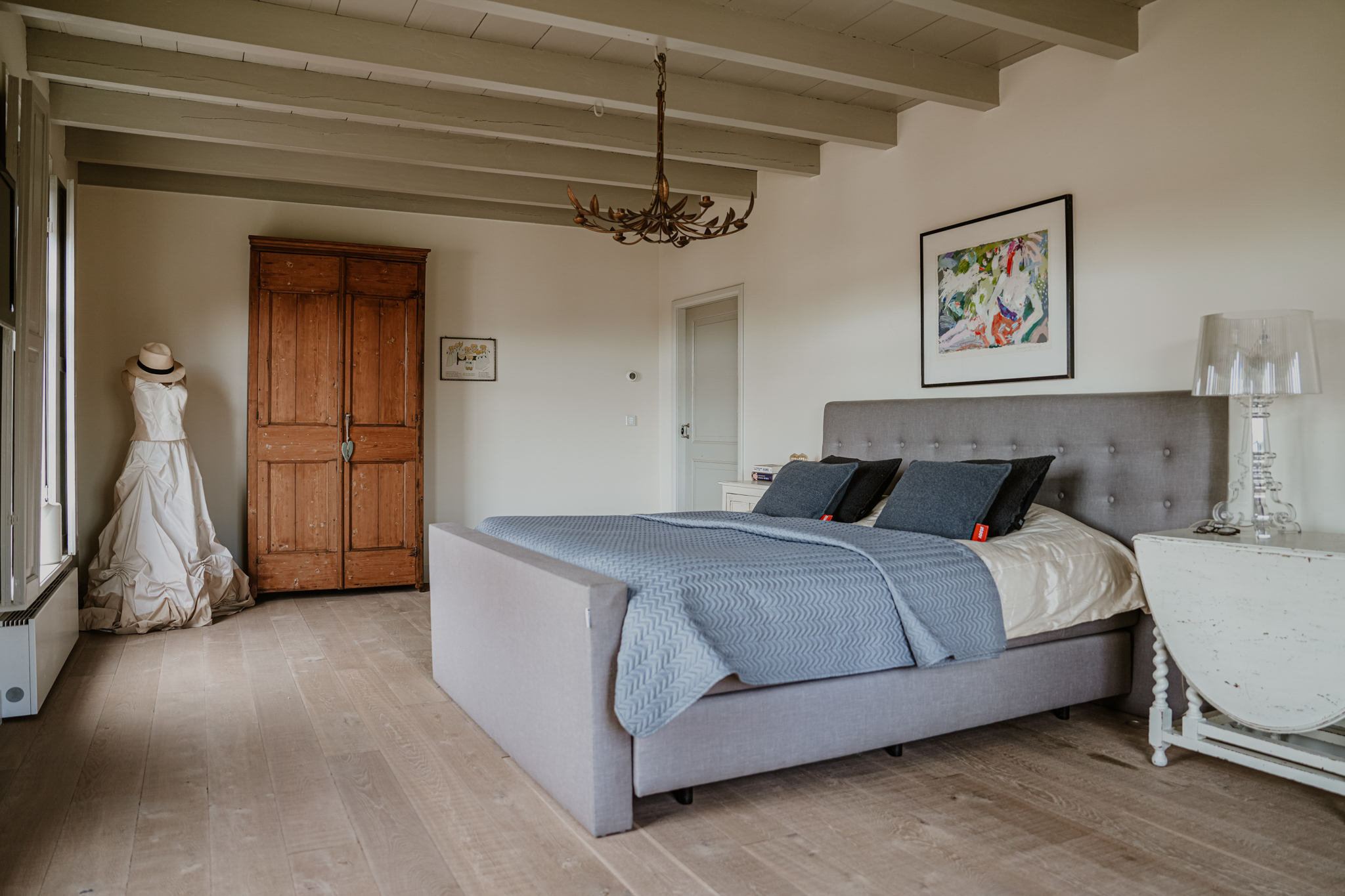 De slaapkamer en garderobekamer bevinden zich op de plaats waar in het verleden de raadzaal zich bevond. Deze was bereikbaar vanuit een separate zijentree. Door deze tweede entree is de ‘westvleugel’ ook uitstekend in te richten als zelfstandige gastenkamer. De badkamer is zonder meer riant te noemen. Er zijn een vrijstaand bad, een royale inloop regendouche en twee wastafels. De toiletruimte is separaat. Alle slaapkamers en de badkamer in het voorhuis zijn voorzien van airconditioning.