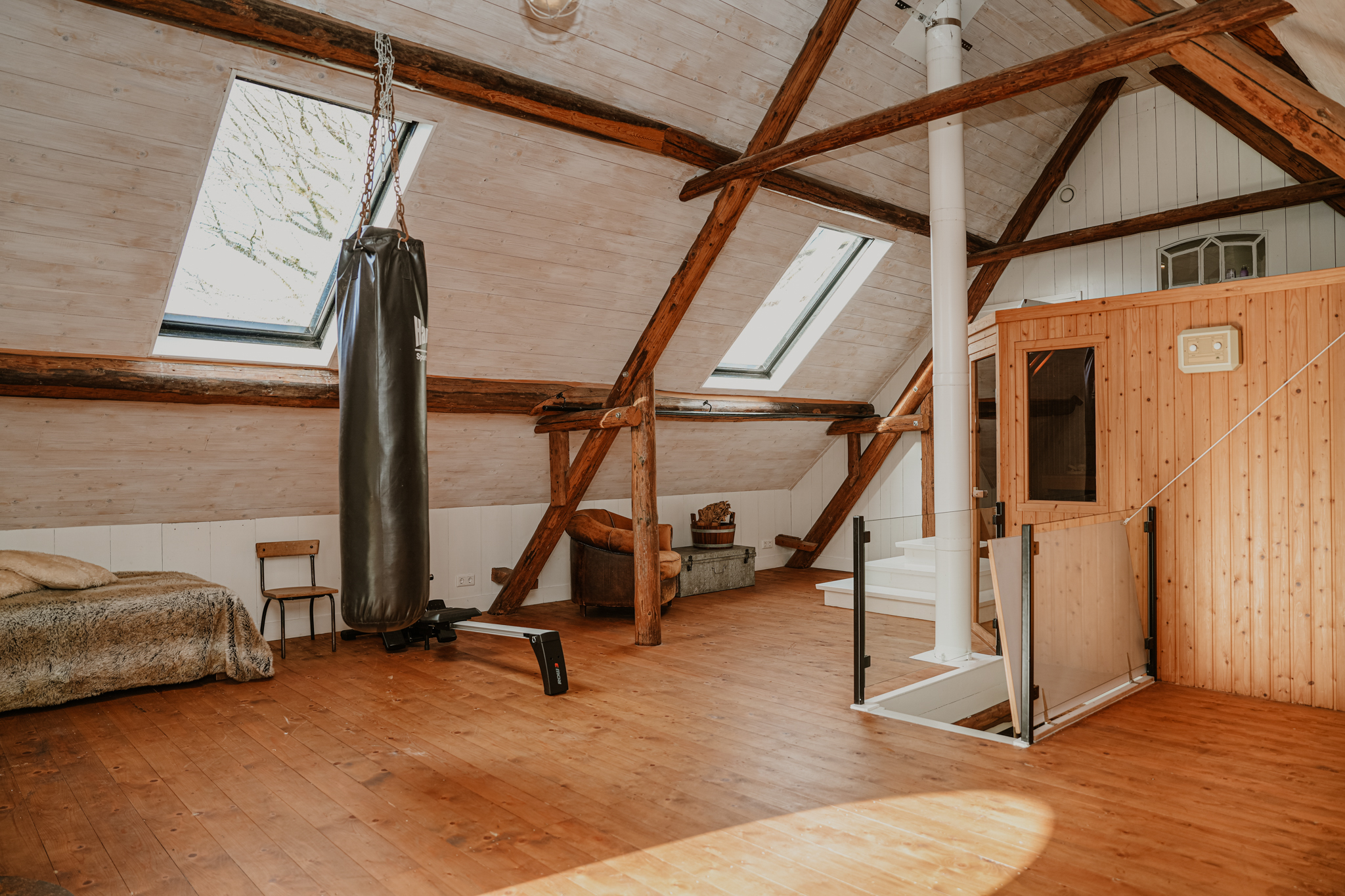 In het achterhuis bevindt zich onder de geïsoleerde kap een 4e slaapkamer die momenteel in gebruik is als sportkamer. In de kamer bevindt zich een grote traditionele sauna en een trap die uitkomt in de eetkamer. Aan de overloop is een 2e badkamer met grote inloopdouche en luxe wastafelmeubel.