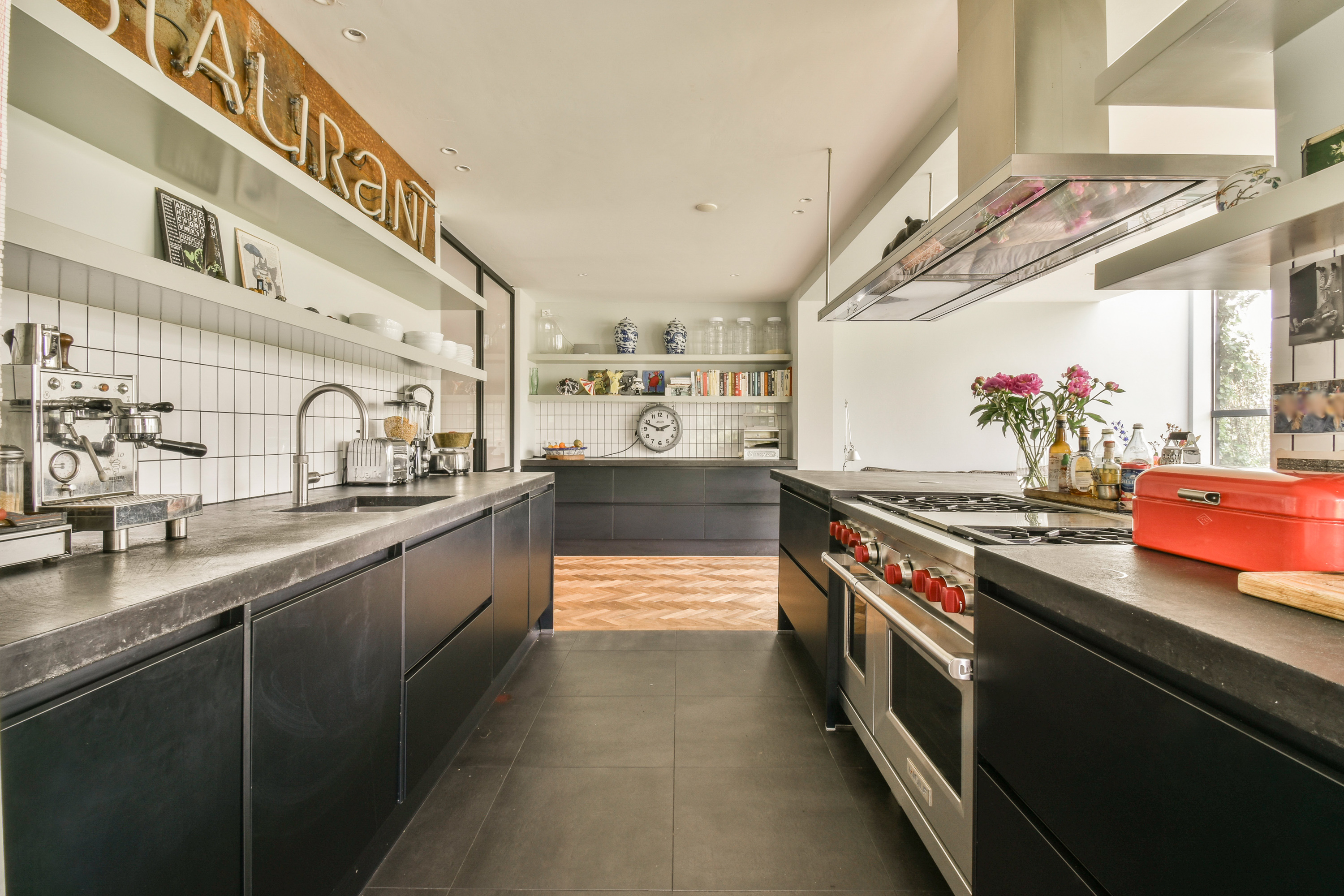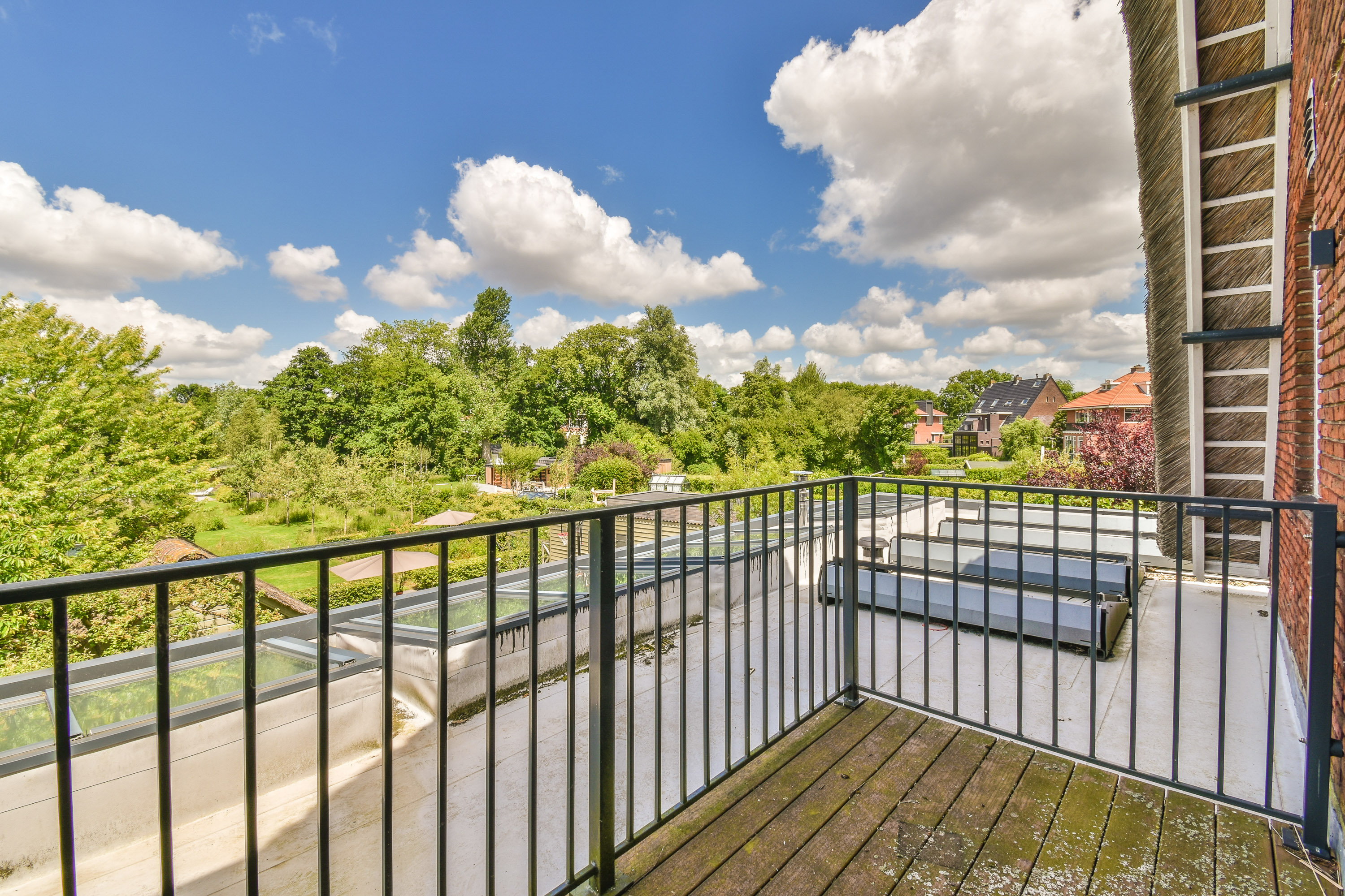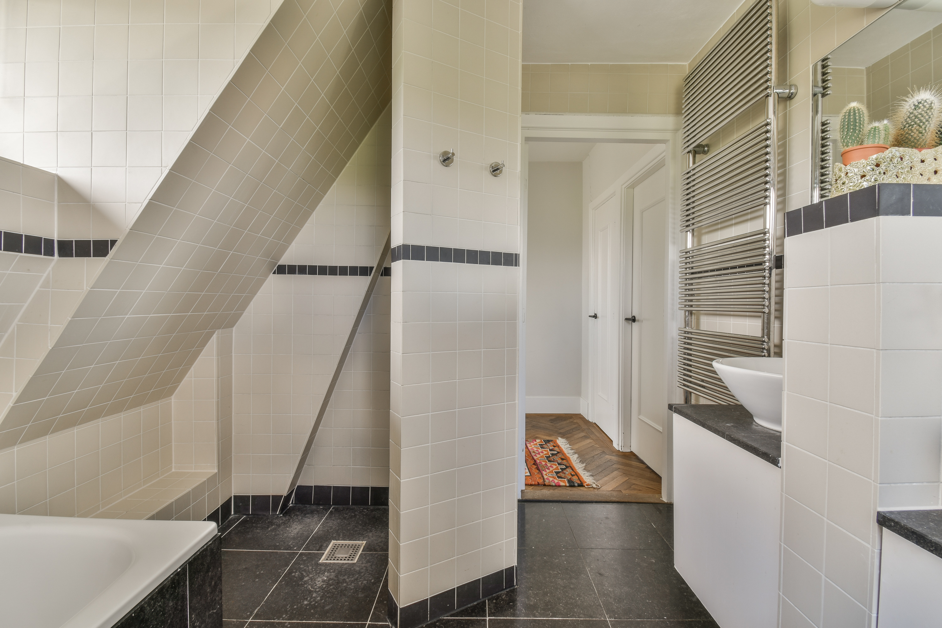 A staircase leads to the first floor, where peace and privacy are key. At the front of the home is the spacious bedroom, offering panoramic views of the Amstel. This room includes a large walk-in closet and a luxurious en-suite bathroom with a freestanding bathtub, double vanity, walk-in shower and toilet. At the rear is a second large bedroom, also with an en-suit bathroom. This bathroom is equipped with a double sink, walk-in shower and toilet. A bright landing connects the rooms and enhances the overall sense of space and refinement.