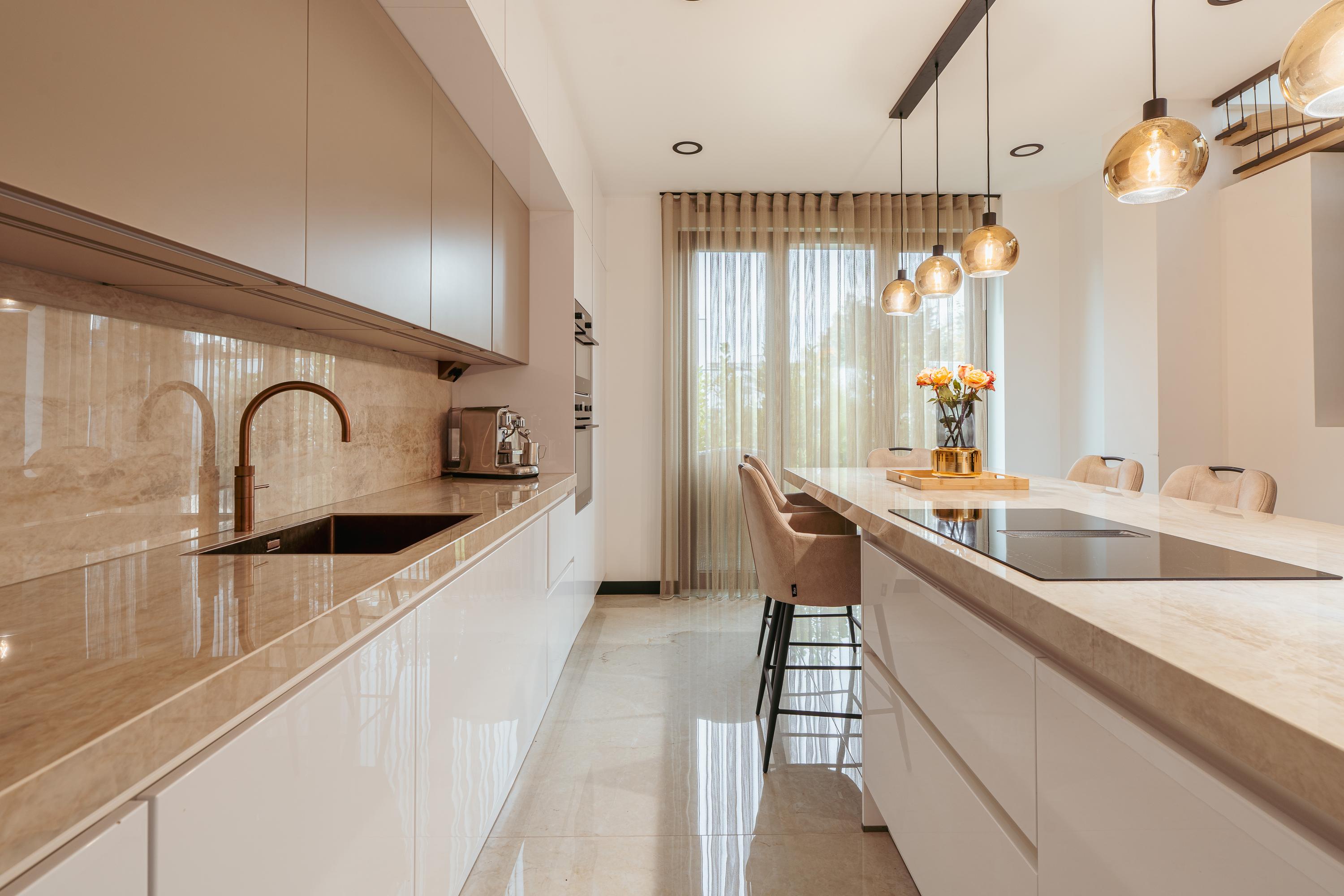 The entrance to the property is reached via the well-maintained front garden. The spacious hallway provides a welcoming first impression and leads into the generous living room, which is characterised by an abundance of natural light. Large windows and glass doors connect the living area directly to the garden terrace, creating a seamless flow between indoor and outdoor living. Adjacent to the living room is the luxurious open-plan kitchen, featuring a spacious cooking island that also serves as a cosy bar seating area. The kitchen is fully equipped and includes an oven and combi-oven, an induction hob with integrated extractor, a climate-controlled wine cabinet, Quooker, dishwasher, fridge and freezer. There is ample space for a large dining table. Behind the kitchen, you will find a spacious utility room and storage area, offering plenty of room for household appliances and pantry items.