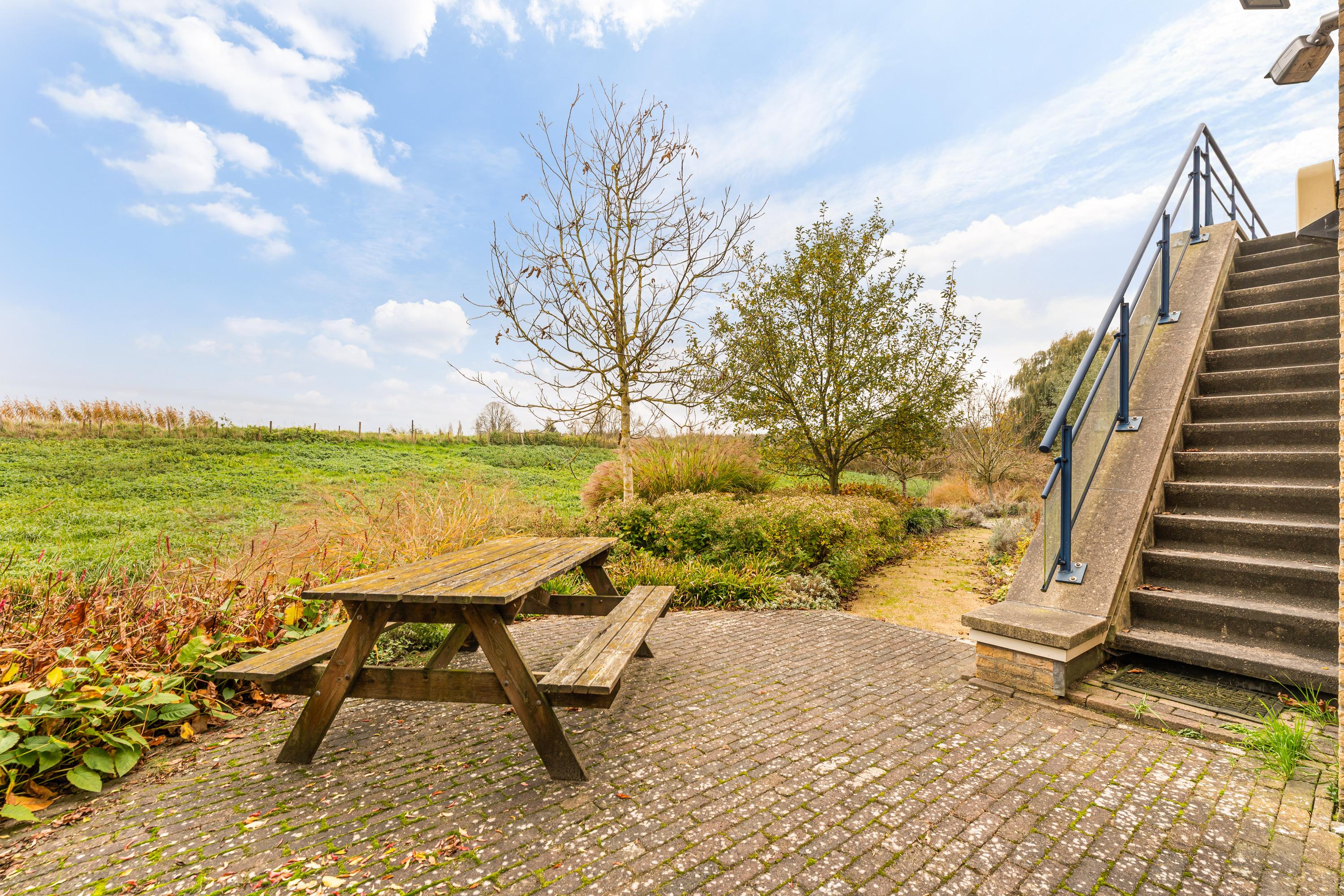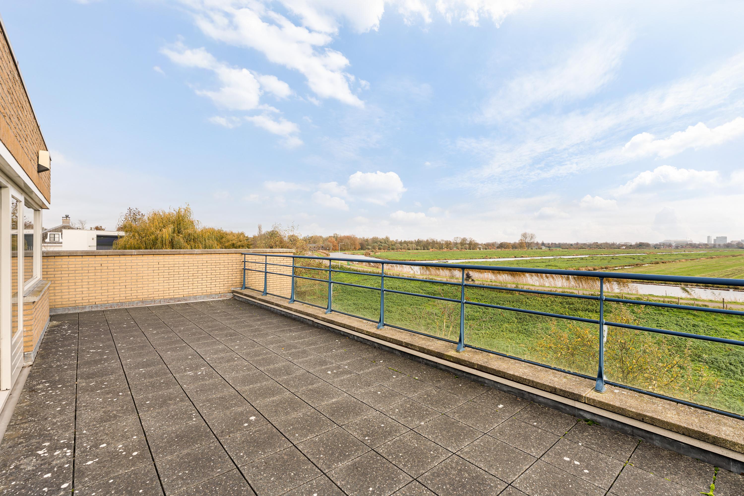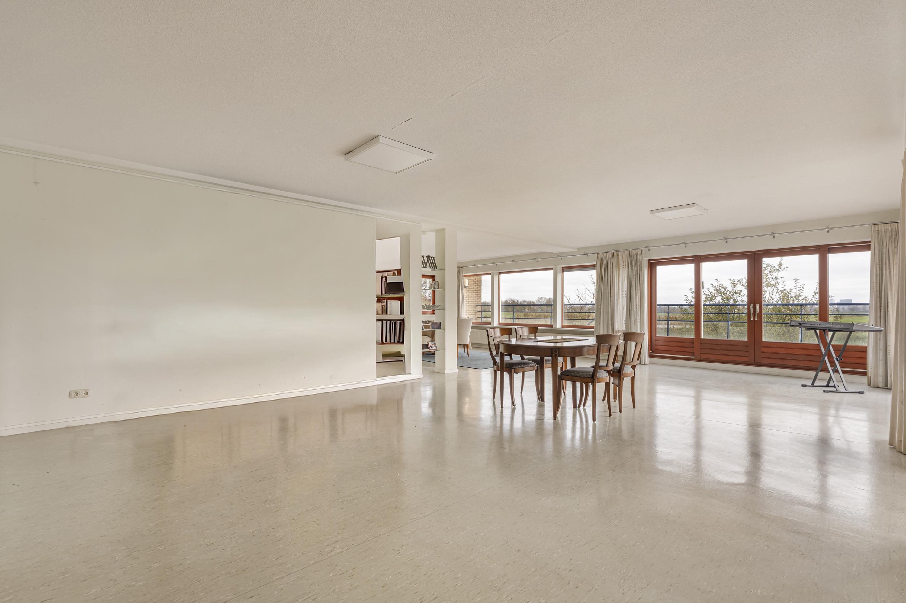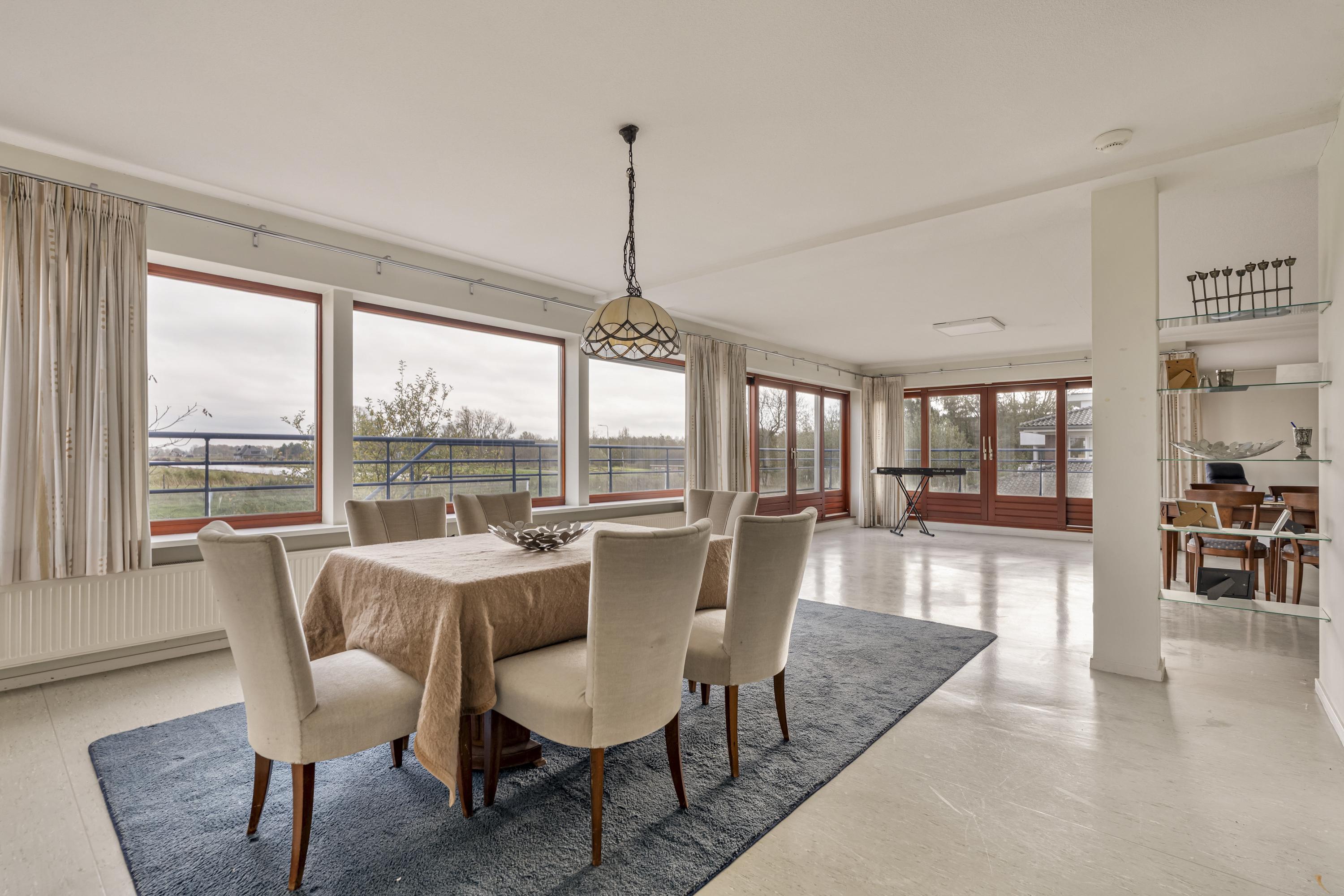 The first floor is accessed via a wide landing and offers three generous living areas. At the rear of the home is an exceptionally large room currently used as a living room, with an adjacent bright kitchen area. From this living floor you step directly onto the generous balcony, which can also be reached from the garden. From here, the view over the Middelpolder is truly spectacular.