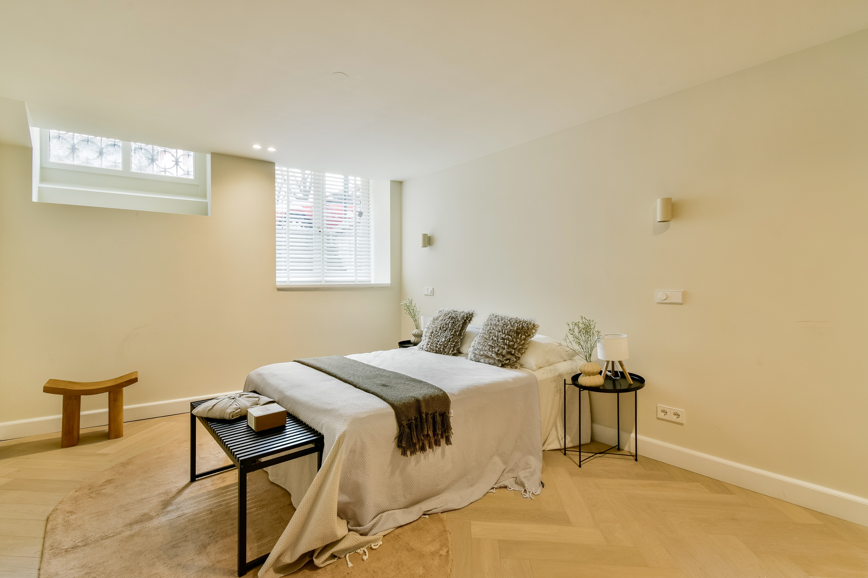 The entrance is located on the ground floor. Here you step into a bright and spacious living area, where a generous lounge and dining space seamlessly blend together. The modern open kitchen connects the two areas and is fitted with a cooking island and high-quality built-in appliances—a true eye-catcher for cooking enthusiasts. From the dining area, large French doors open onto the charming (inner) garden, a sheltered private retreat in the heart of the home, away from the city bustle. Here, you can enjoy a wonderful indoor-outdoor living experience. At the rear, there is an additional room, accessible both from the garden and via the hallway next to the dining room. This space features a second kitchen and therefore offers numerous possibilities, such as a home office, guest accommodation, or hobby room. Ample built-in cupboards on this floor ensure sufficient storage space.