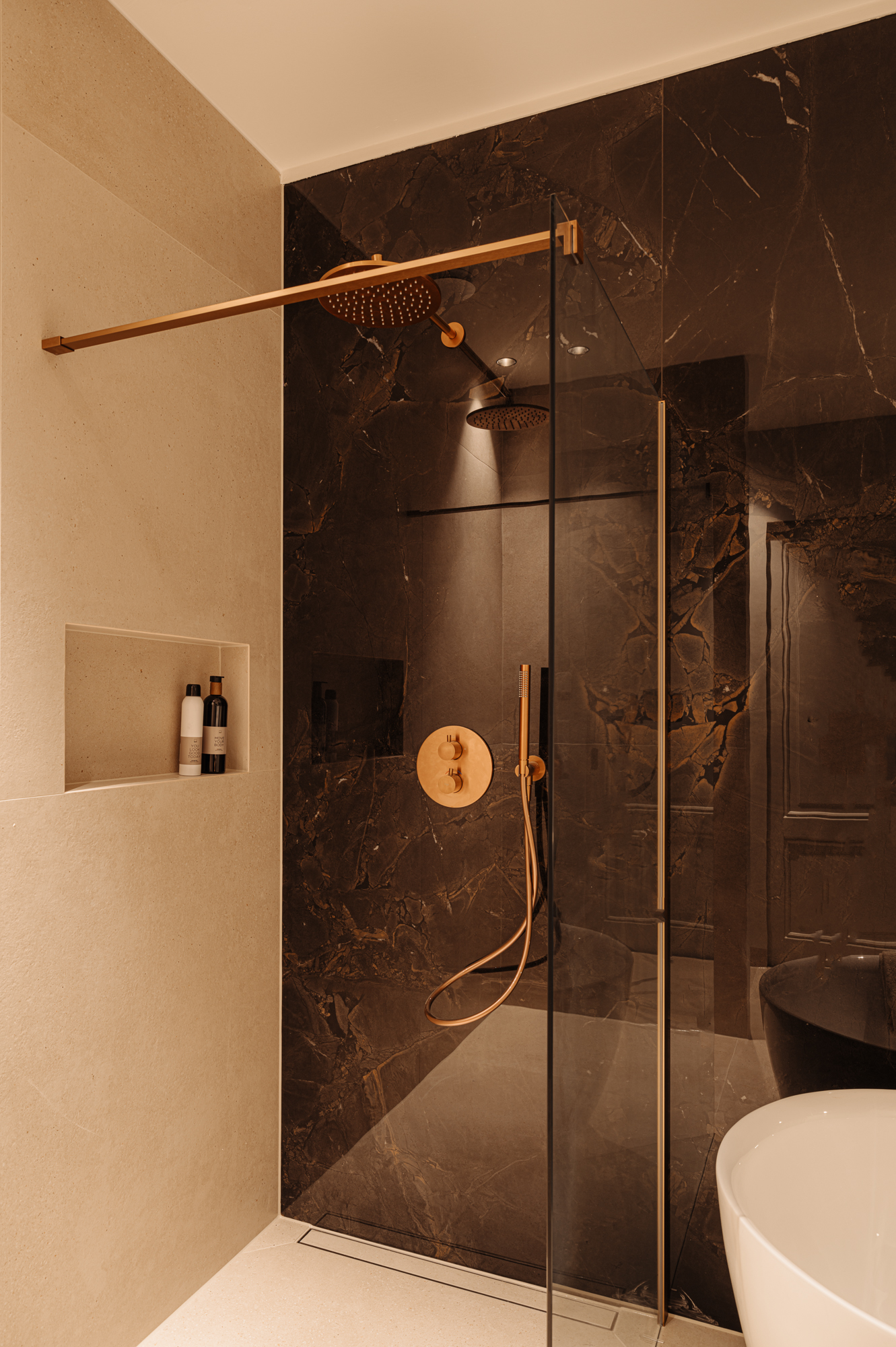The two bedrooms at the back are flooded with natural light. They are so spacious that it would be easy to create a third bedroom. They have been beautifully finished with original wooden beams, which contribute to the apartment’s distinctive charm. The Master bedroom has its own en-suite bathroom with a double washbasin, a large bath and walk-in shower and a toilet. This bathroom is the epitome of comfort and luxury. The second bathroom is elegant too and has a double washbasin unit and a walk-in shower.