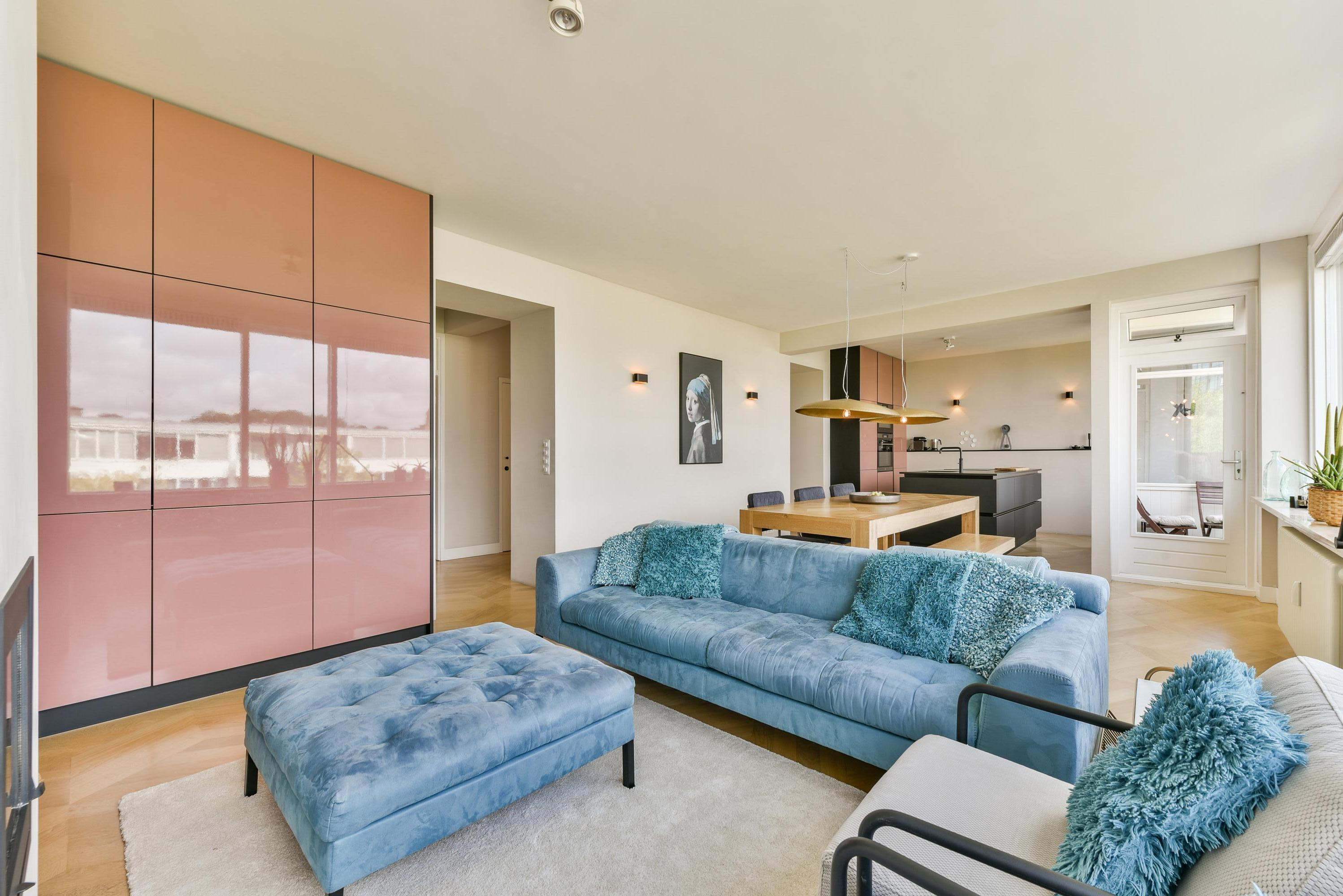 Upon entering, you are welcomed by a spacious hallway with an elegant parquet floor and practical built-in cupboards. The bright living area comprises a generous open-plan kitchen, dining space, and a comfortable lounge featuring a built-in wood-burning stove. The modern kitchen, finished in black Fenix, is equipped with a cooking island including an induction hob, oven, combi-oven, dishwasher, large refrigerator, and Quooker. Thanks to the glass façade and two French doors opening onto the west-facing balcony, the living room is bathed in natural light. The apartment offers three bedrooms. The master bedroom, located at the front of the apartment, features an entire wall of wardrobes, an original built-in cabinet with safe, and direct access to the balcony. The other bedrooms also enjoy access to the balcony. The luxurious bathroom is fitted with a rain shower, bathtub, double washbasin, and a second toilet. Additional built-in storage spaces are available throughout the apartment, including a spacious utility room with connections for a washing machine and dryer. The entire apartment is finished with a herringbone floor and atmospheric lighting by Zuiver. With large windows on both sides, the home enjoys abundant natural light throughout the day. Morning sun streams into the bedrooms, while in the afternoon and evening the kitchen and living area are filled with warm sunlight. This not only creates an exceptionally bright and airy atmosphere but also enhances the overall sense of space and comfort.