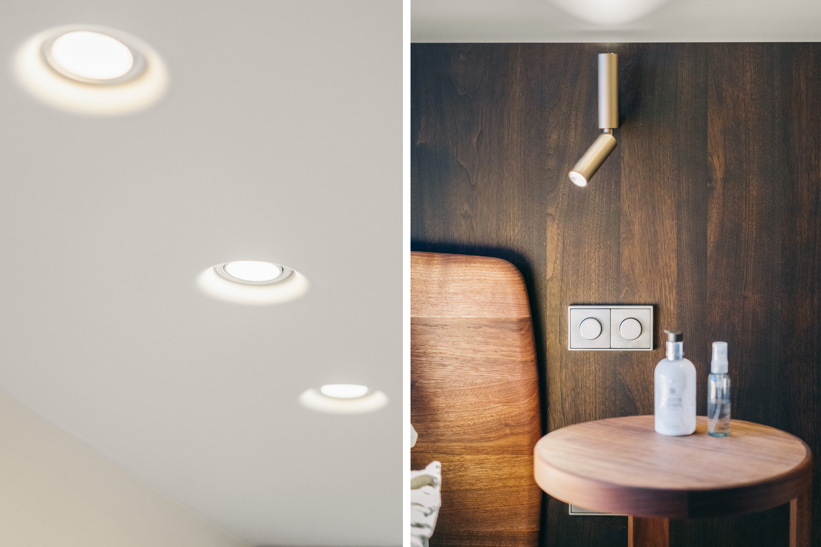 Along the wall, there is a custom-built cabinet with an integrated desk, finished in warm walnut veneer, providing generous storage and an elegant appearance. This bespoke solution makes the space highly suitable as a workspace, reading room, or reception area.