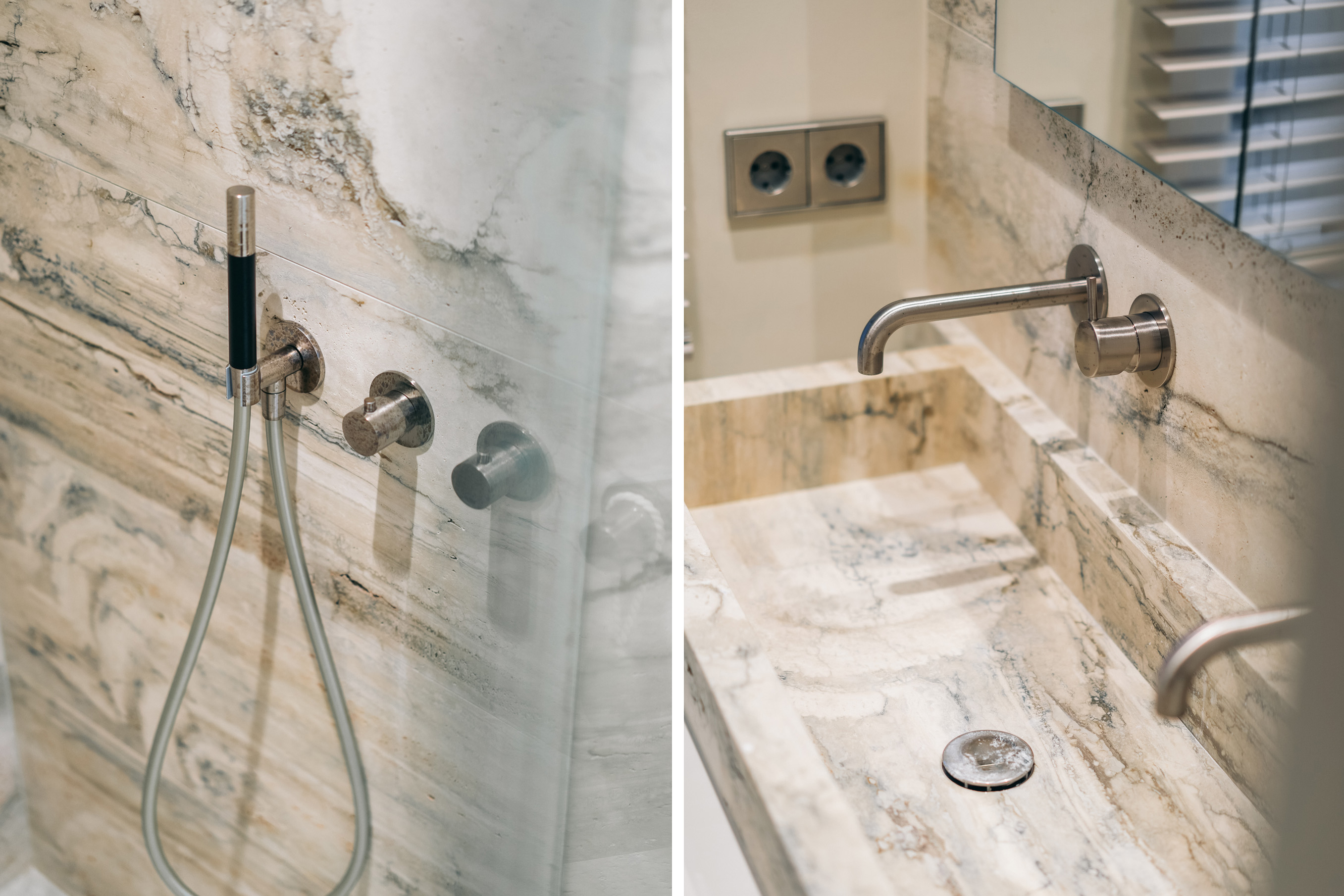 - Sanitary areas finished with travertine walls and ceramic floor tiles;