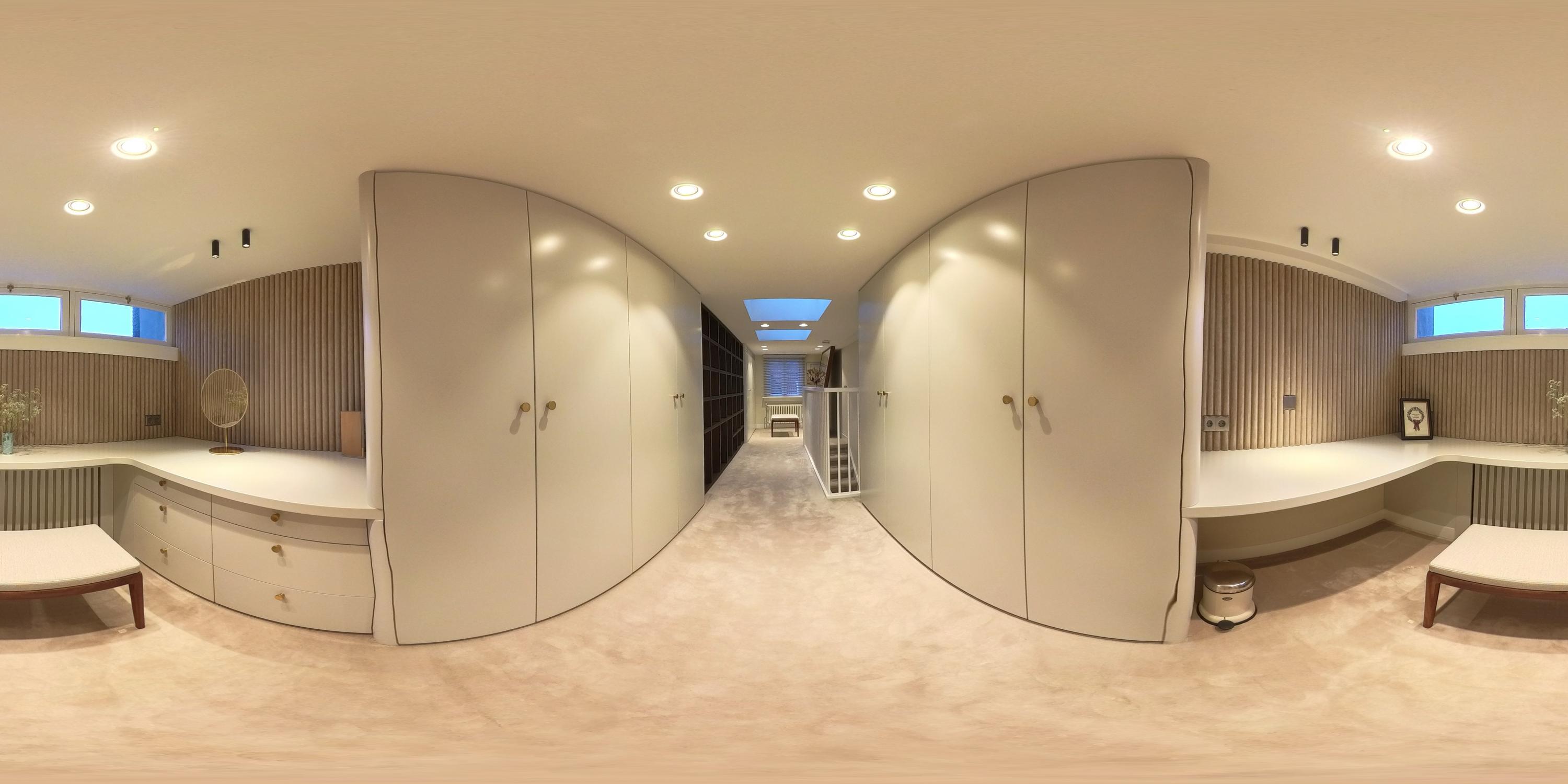 The third floor is arranged as a generous walk-in wardrobe with custom-built closets, a distinctive wall finish, and a skylight providing natural light. The space is also fitted with air conditioning.