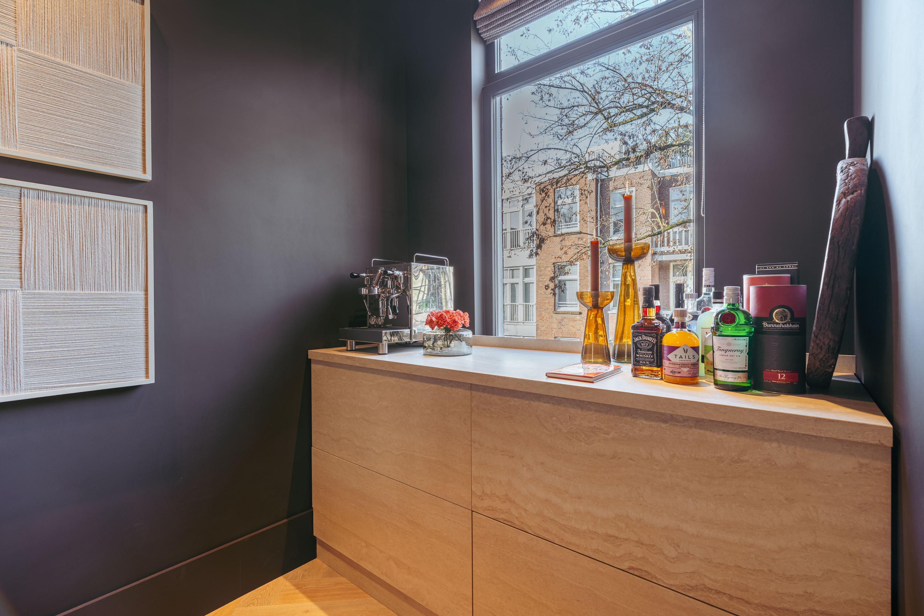 The kitchen-diner is the absolute centerpiece and connecting element of this floor. This generous space has been designed for both everyday comfort and refined dining experiences. The large kitchen island features a double induction hob with integrated extraction and is elegantly combined with a built-in dining and bar area. The handleless custom cabinetry houses high-end built-in appliances, including a refrigerator, freezer, dishwasher, double Miele oven and a wine climate cabinet. At the rear you will find a more intimate sitting or dining area, perfect for dinners or as a cozy coffee and bar corner. Two sets of French doors provide access to the deep and beautifully landscaped balcony at the quiet rear, overlooking the inner gardens.