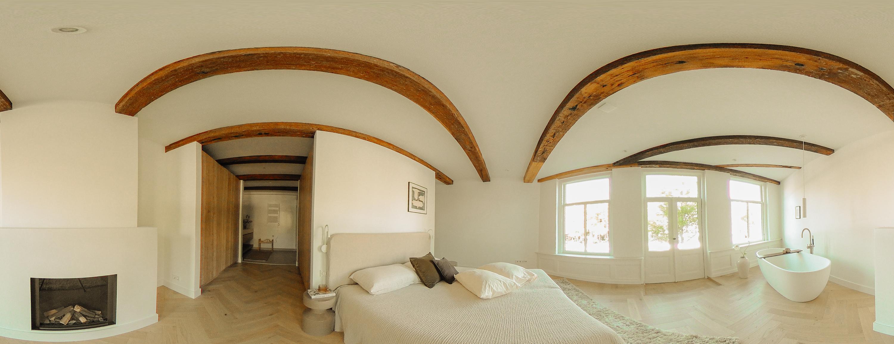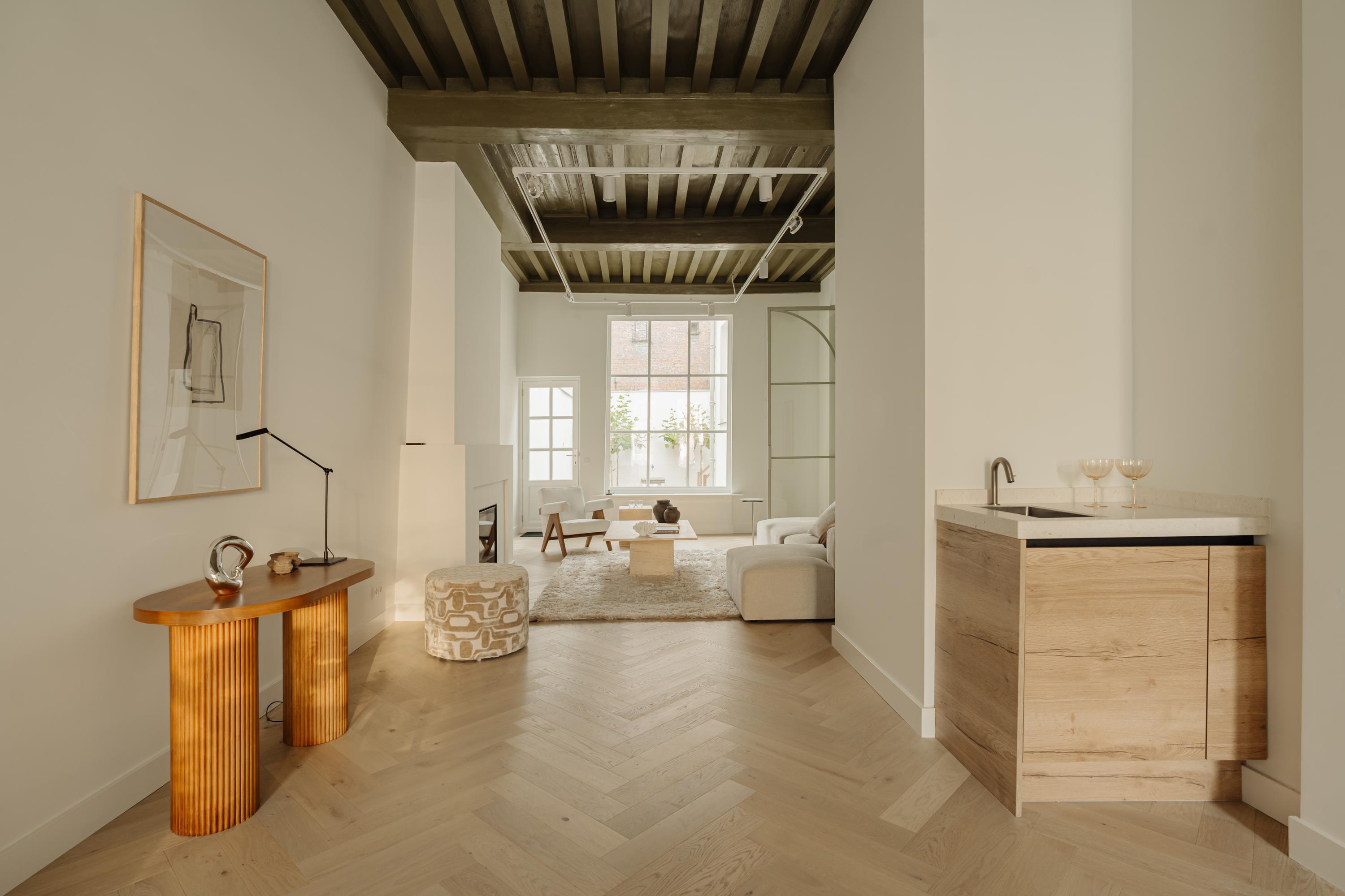 From the hall, you enter the living area. With a ceiling height of over 3.4 metres, original exposed beams, large windows and a beautiful view over the Singel, this is an impressive space where warmth and grandeur meet naturally. Two fireplaces on this floor add an extra sense of homeliness and refinement.