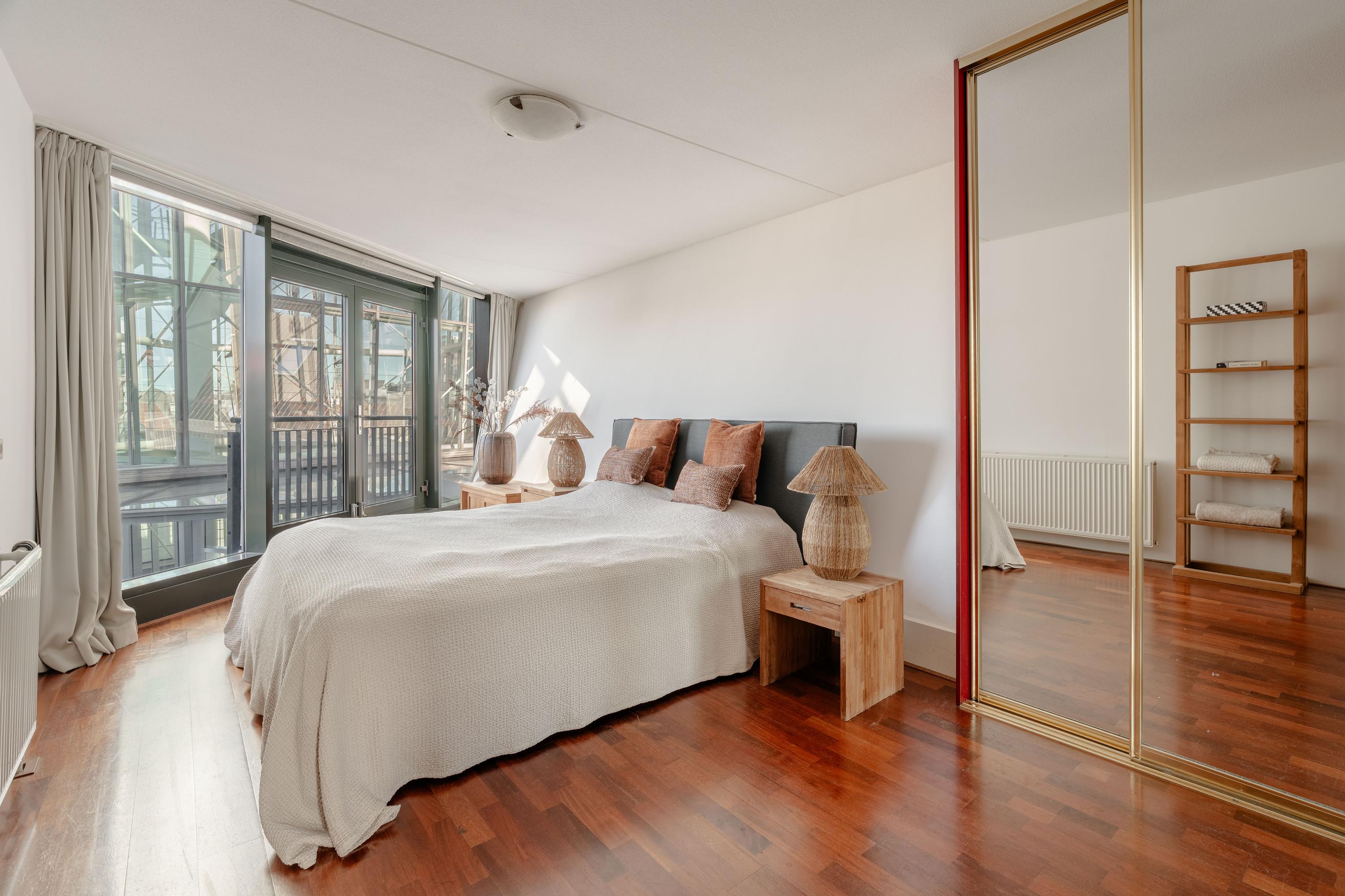 The apartment’s living level occupies the top floor, where large windows and generous ceiling heights invite daylight to animate the interiors. The living room opens to far-reaching views across the Singel and the city’s celebrated Flower Market, setting an atmosphere of refined urban calm. A half-open kitchen, complete with built-in appliances and an adjacent storage area, seamlessly connects to the dining space, ideal for gathering and entertaining.