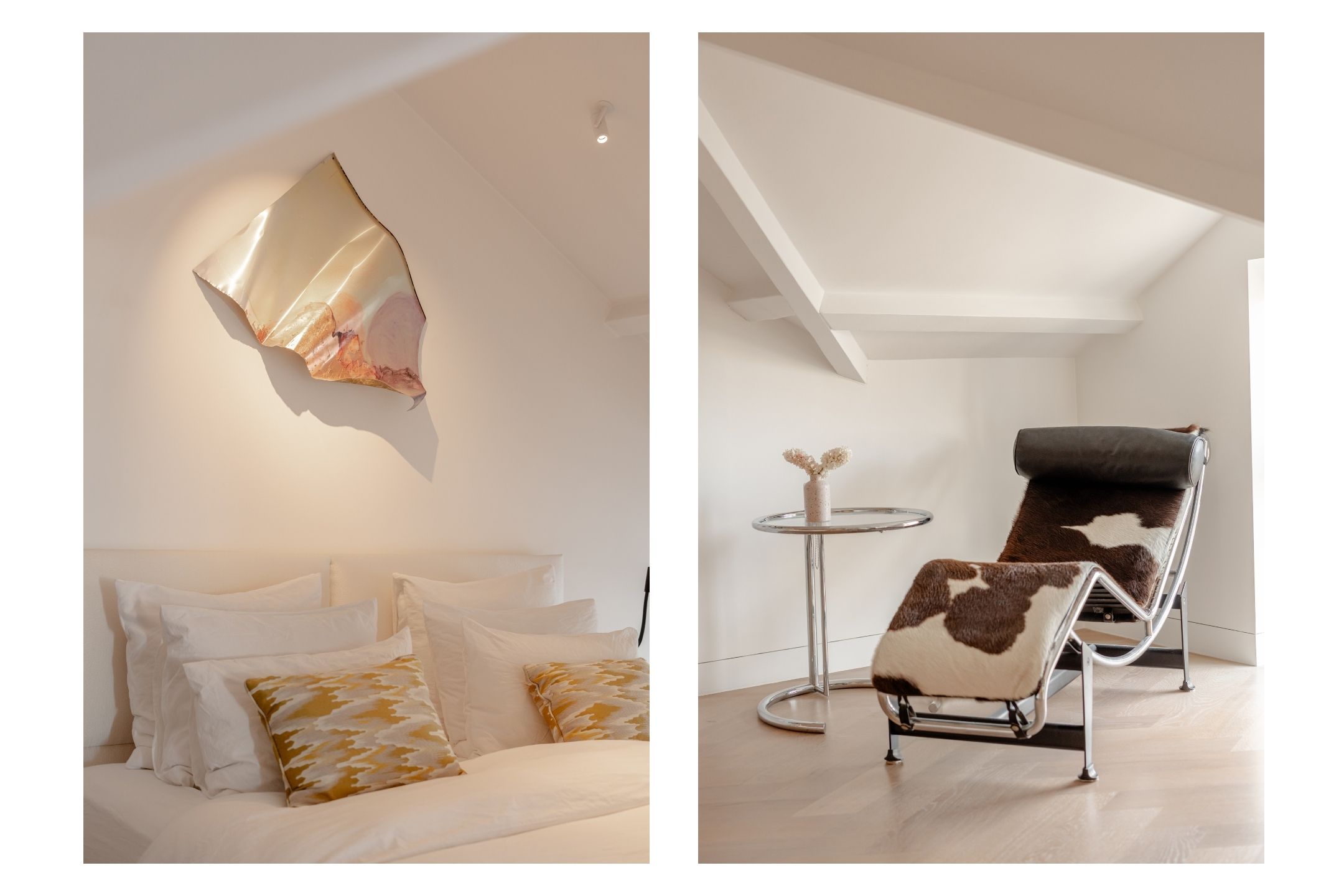 The spacious master bedroom, accessible from the living room, exudes calm and luxury. Exposed beams add character, while smart built-in storage solutions under the sloped ceilings ensure optimal use of space. Air conditioning is also installed here for maximum comfort. The adjoining en-suite bathroom is generously sized and finished to a high standard, featuring a double vanity, freestanding bathtub, walk-in rain shower, and toilet.