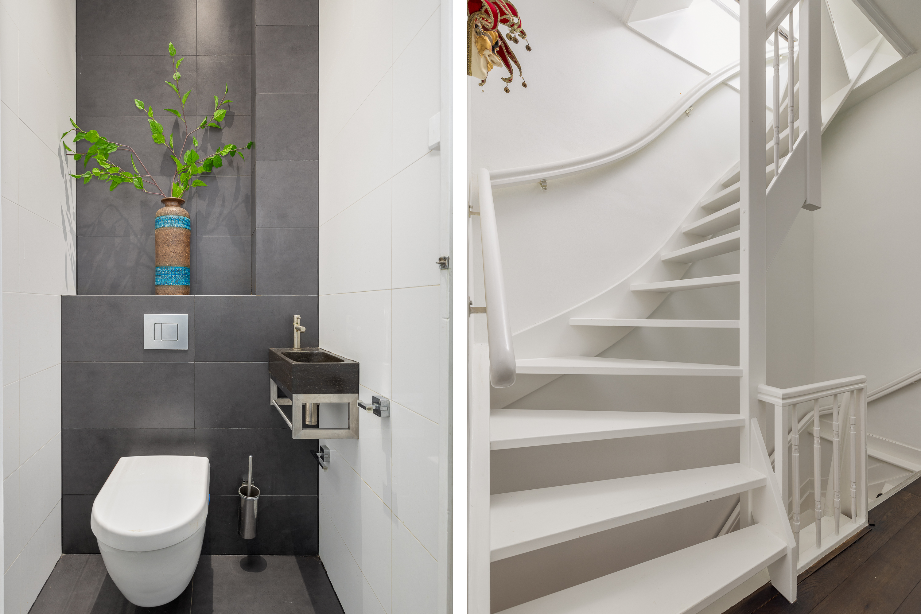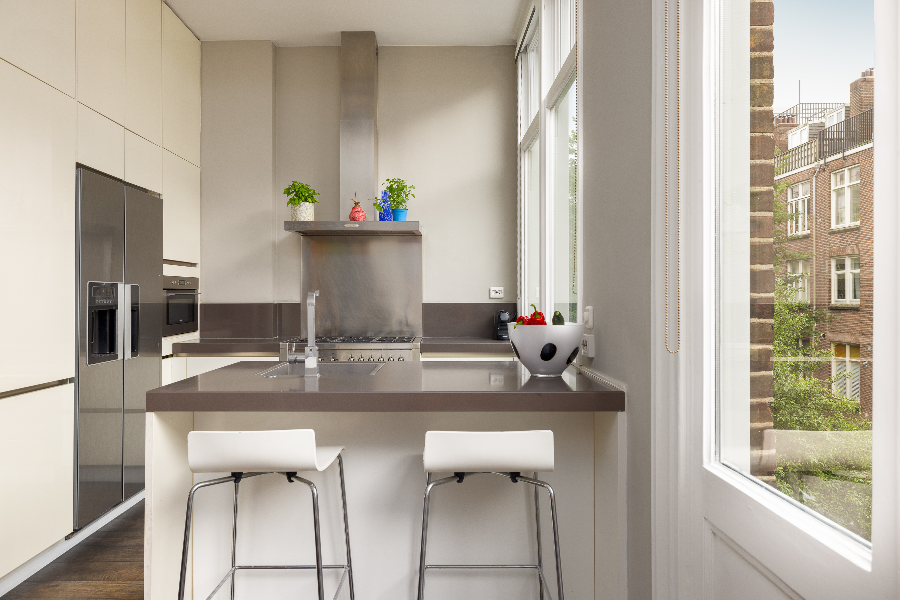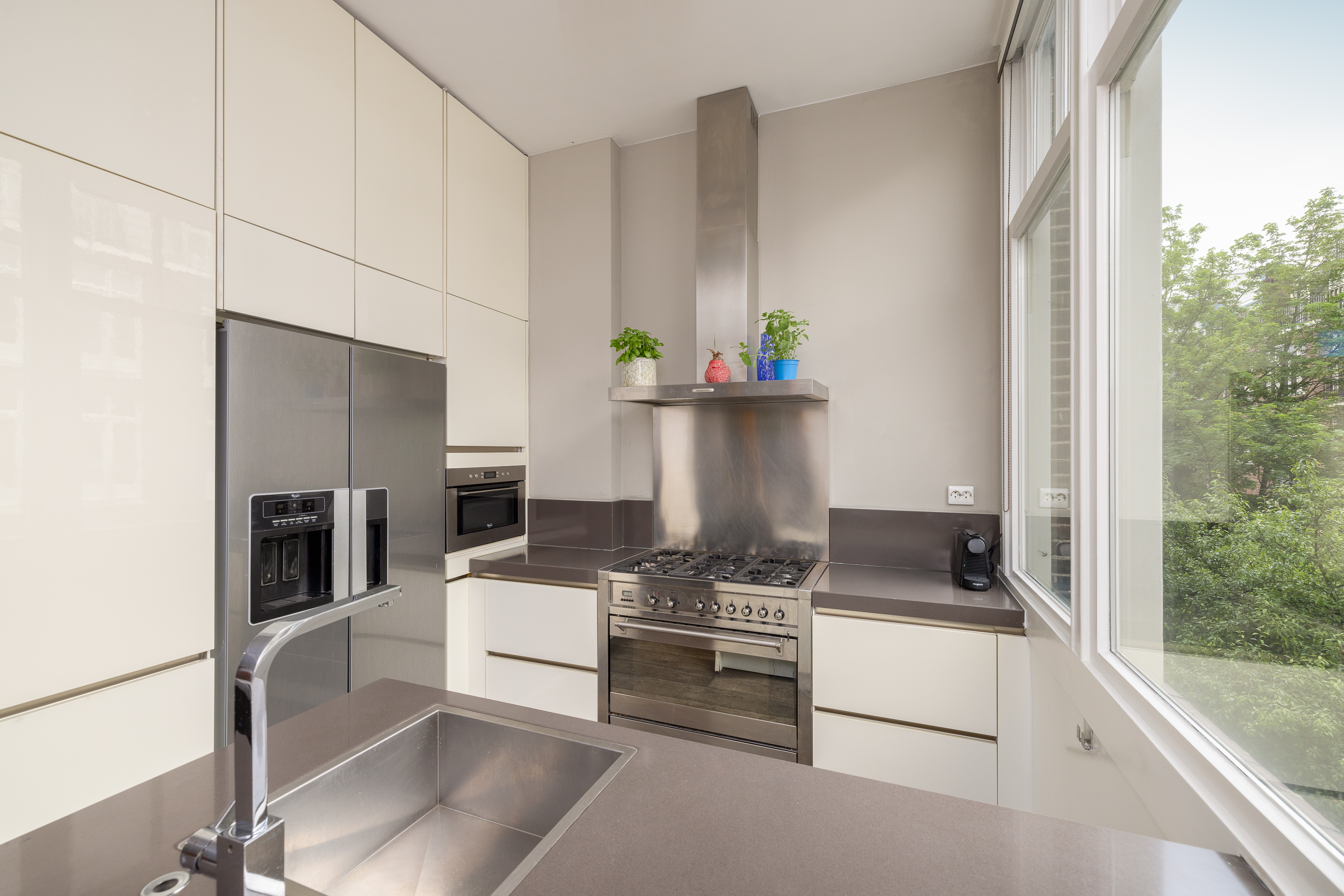 On the landing, you will find a separate toilet with a sink. From the landing, you have access to the spacious through-living room. At the front of the living room, there is enough space for both a formal sitting area and a cozy TV corner. There is also a beautiful balcony with a view of Valeriusstraat and Amstelveenseweg. At the rear of the house is the dining area, open kitchen with island, and a French balcony. The kitchen is equipped with a 5-burner gas stove, oven, microwave, and a fridge/freezer combination. Due to the abundance of glass and the ceiling height of 3.07 meters, this floor is particularly light and spacious.