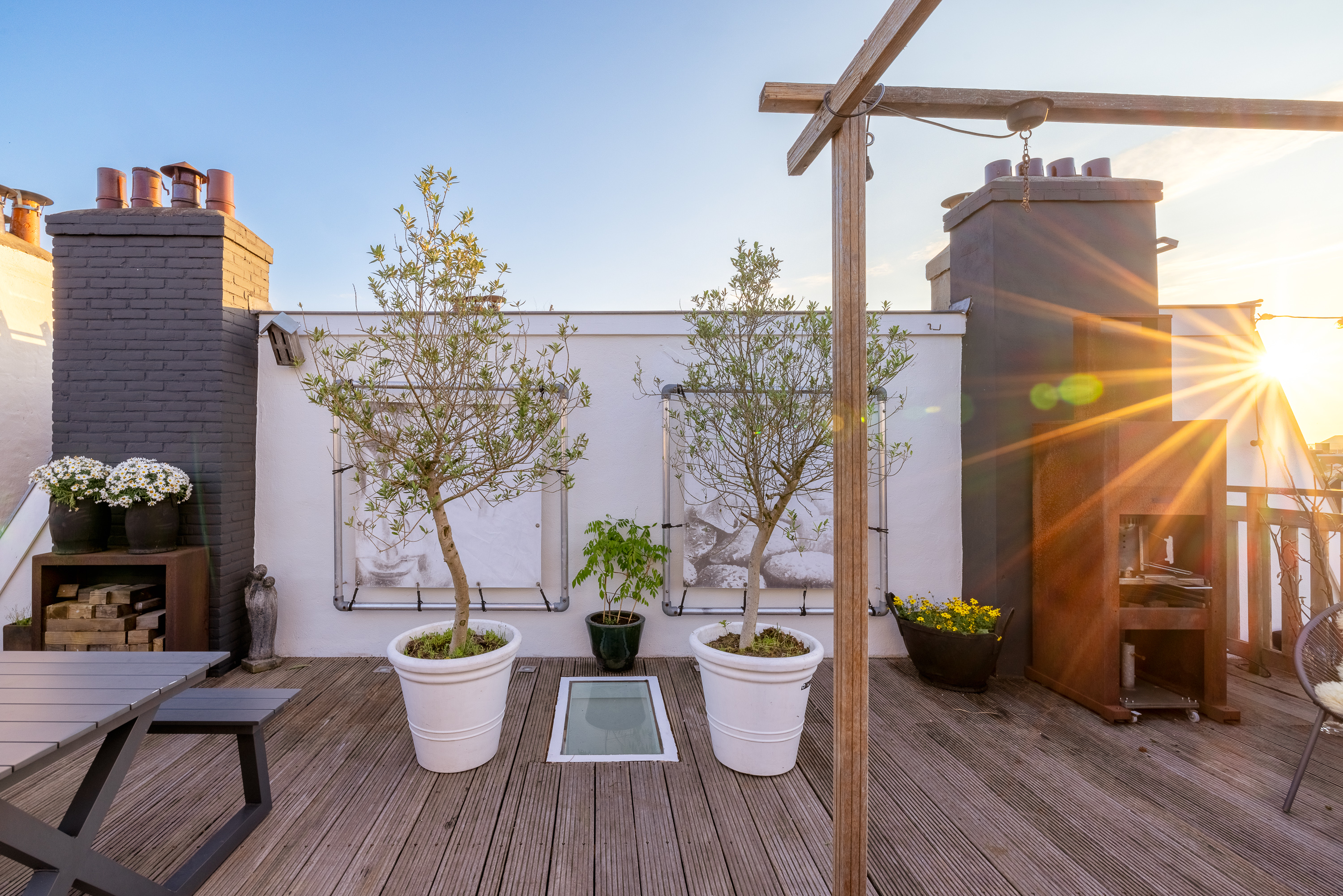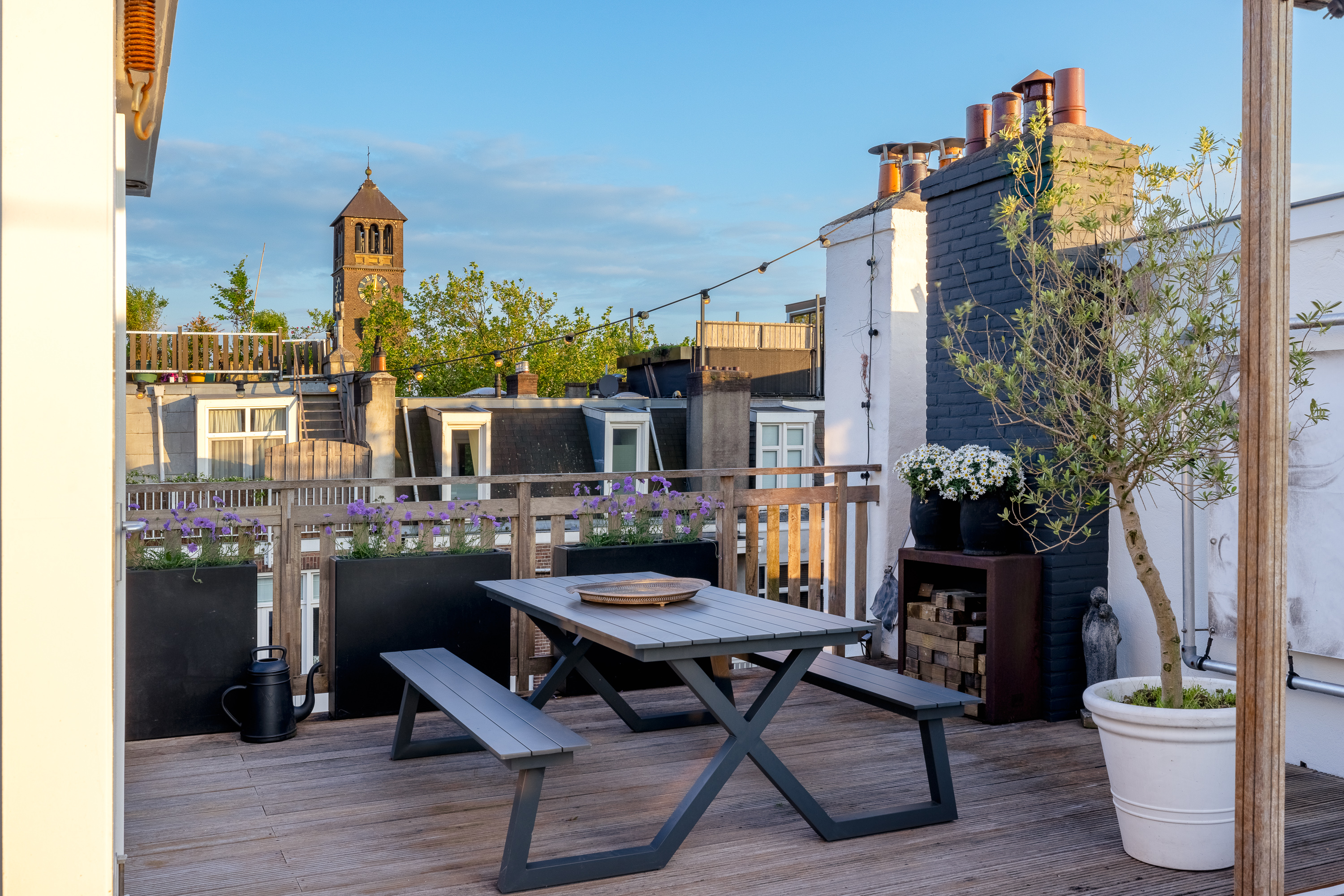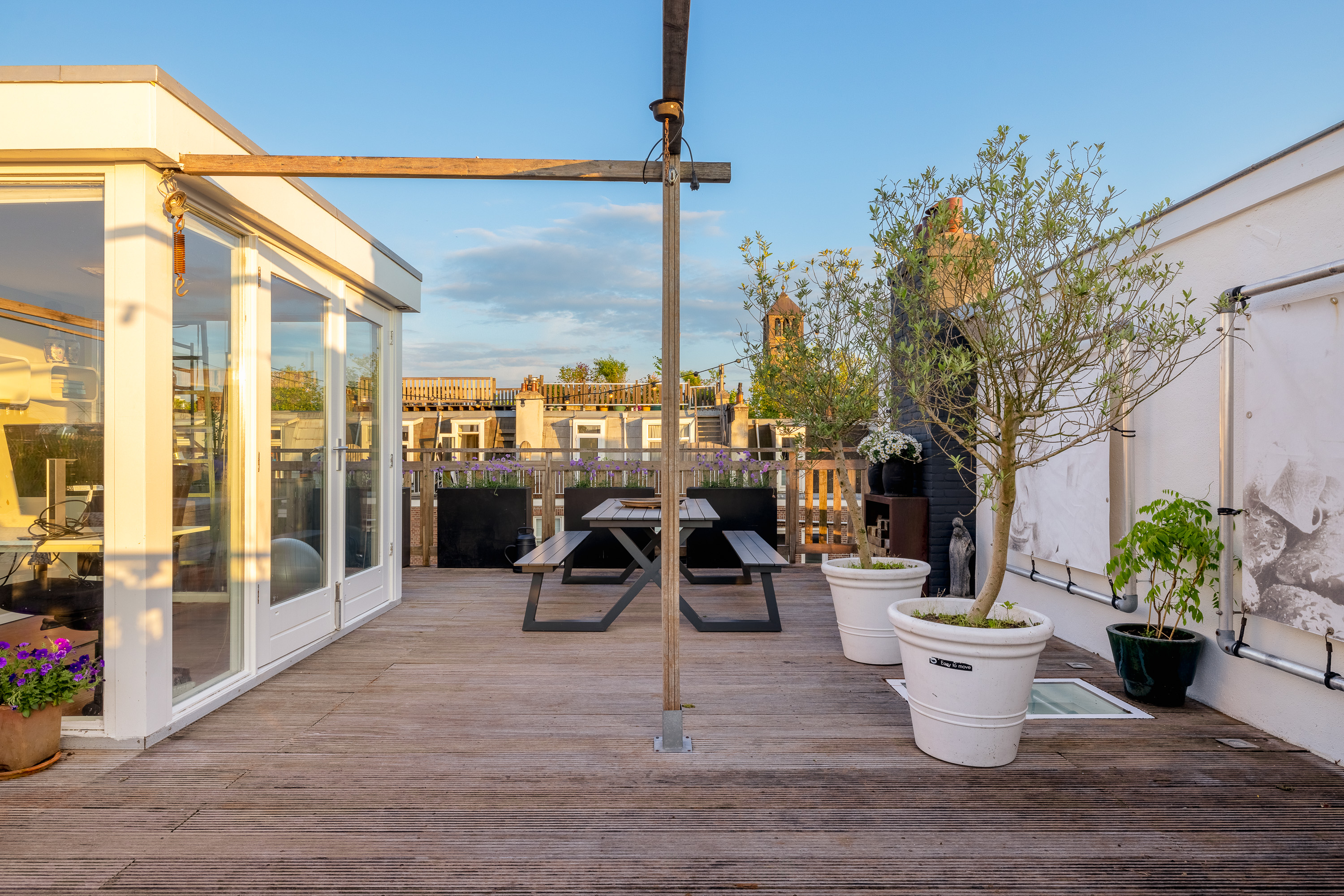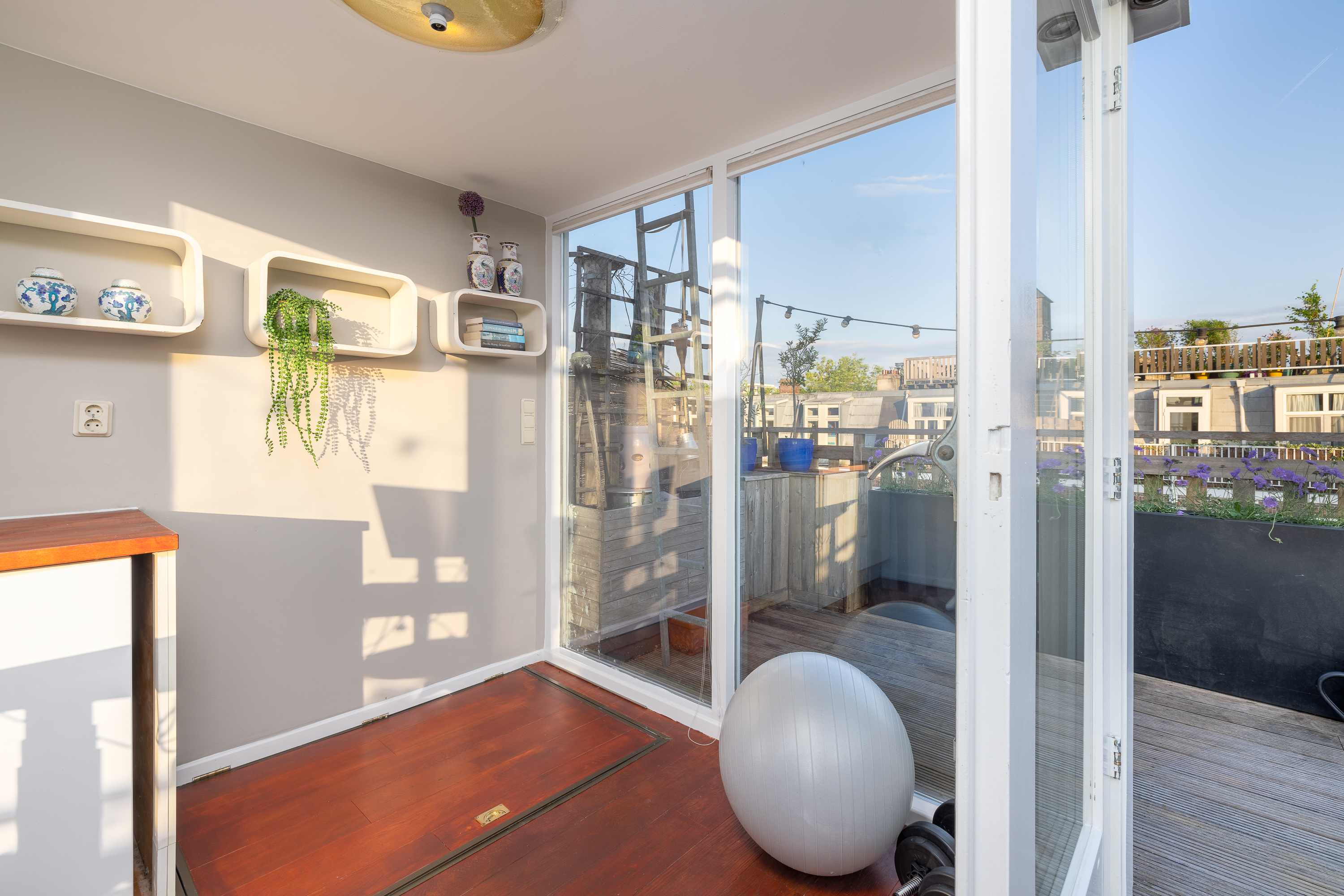 Here you get access to the very spacious, cozy, and beautifully finished roof terrace. On this floor, you also have a sink and cooling at your disposal. It is also convenient that the access to the roof house can be closed off, creating a nice space of about 6m². In short, enough space to create a home gym, for example for practicing yoga, or a wonderful home office.
