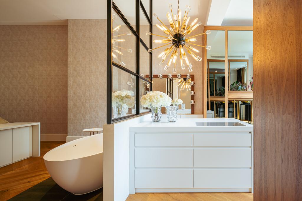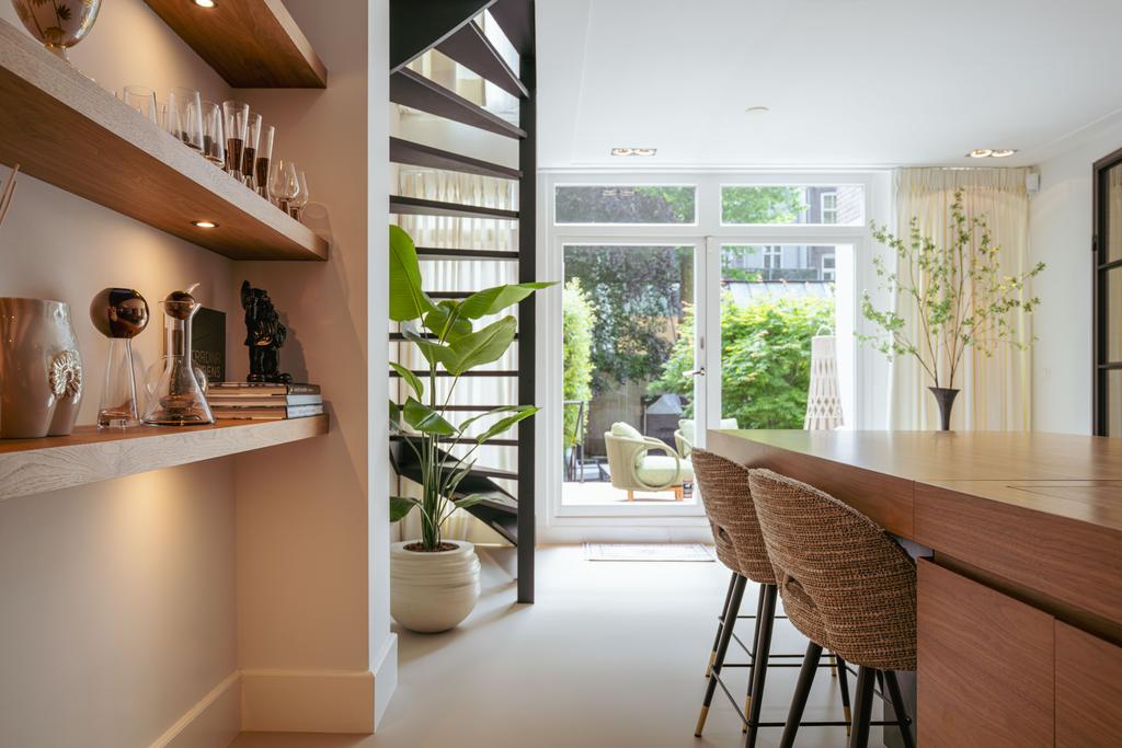 To the front is a bedroom with an en-suite bathroom featuring a washbasin and walk-in shower—currently used as a home gym, but easily repurposed. At the rear is the stunning open-plan kitchen, the centerpiece of this level. Outfitted with Gaggenau appliances, including a fridge, freezer, Quooker, five-burner gas stove integrated into the counter, oven, steam oven, dishwasher, and wine fridge, the kitchen combines luxury and functionality. A solid natural stone countertop with a wooden breakfast bar provides a warm, refined look.