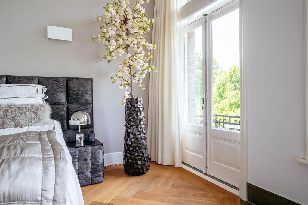 Also at the rear is a modern bathroom with a double vanity, spacious walk-in shower, and toilet. At the front of the home is a second large bedroom, with a gas fireplace, a freestanding bathtub, and French doors opening onto a balcony with breathtaking views over Vondelpark.