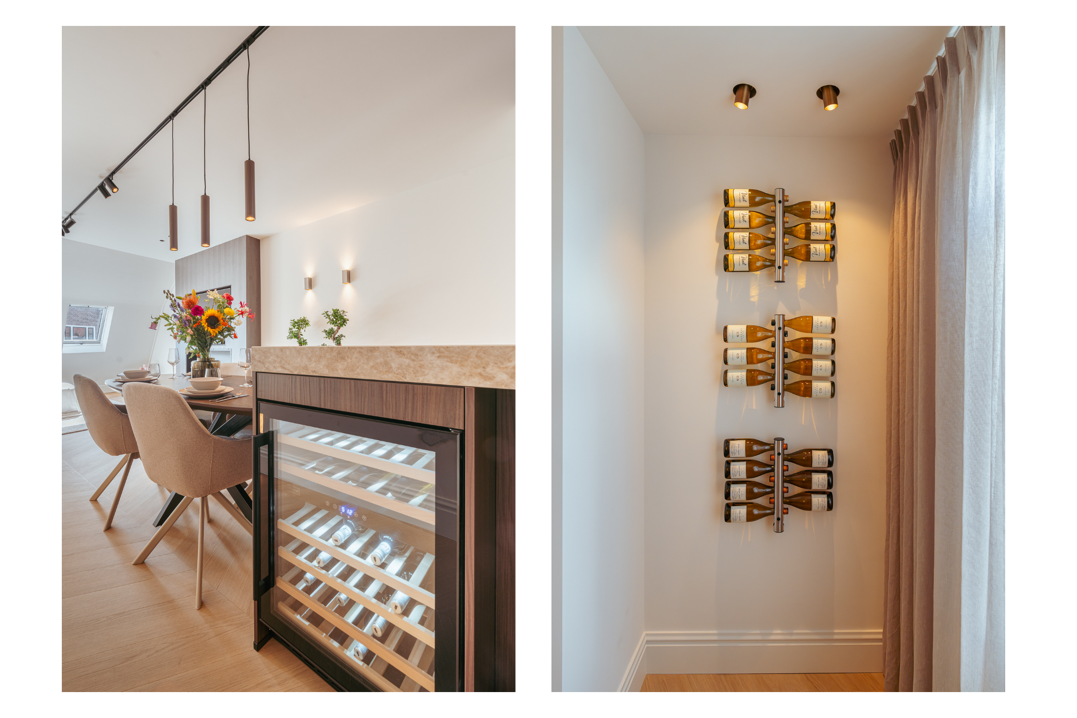Via the communal staircase, you reach the entrance to the property on the third floor. From your private entrance, a neatly renovated staircase leads up to the apartment on the fourth floor. Upon entering, you immediately notice the warm and stylish ambiance, thanks to carefully chosen materials, atmospheric lighting, and impeccable finishes. The apartment has been renovated to a high and luxurious standard, with great attention to detail. Modern black steel doors combined with classic elements give the home a contemporary yet timeless feel, something that runs consistently throughout the property.