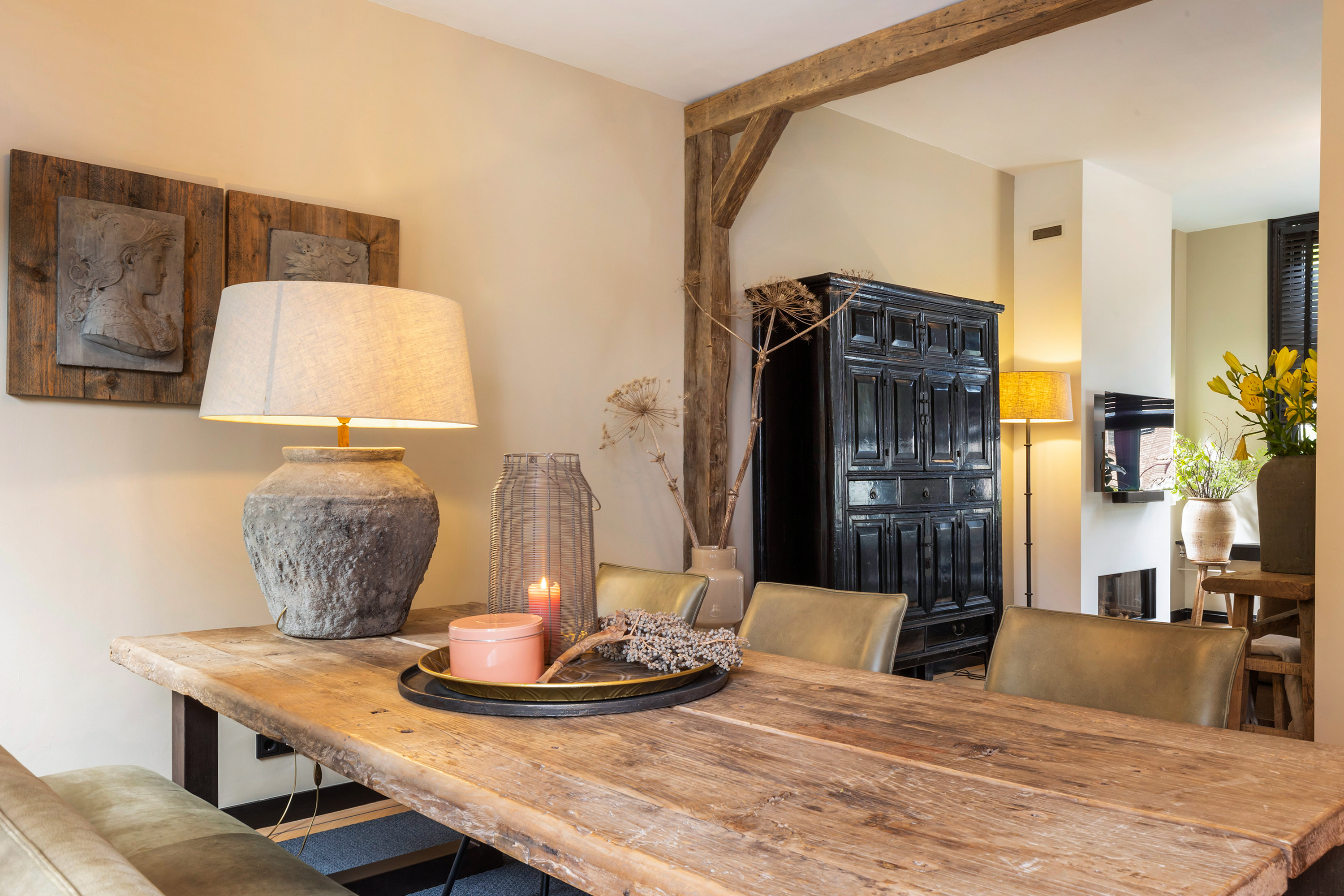 De woonkeuken staat in open verbinding met de eetkamer en de zonnige L-vormige woonkamer. Aan de voorzijde bevindt zich de zitkamer met een sfeervolle Faber gashaard (bedienbaar met afstandsbediening). De achterzijde van de woning opent met dubbele deuren naar het royale terras. De verouderde eiken balken zijn ter decoratie aangebracht en zorgen voor een warme en authentieke sfeer. De gehele begane grond is voorzien van een fraaie Frans eiken visgraatparketvloer met zwarte bies, geschuurd en afgewerkt in white wash.