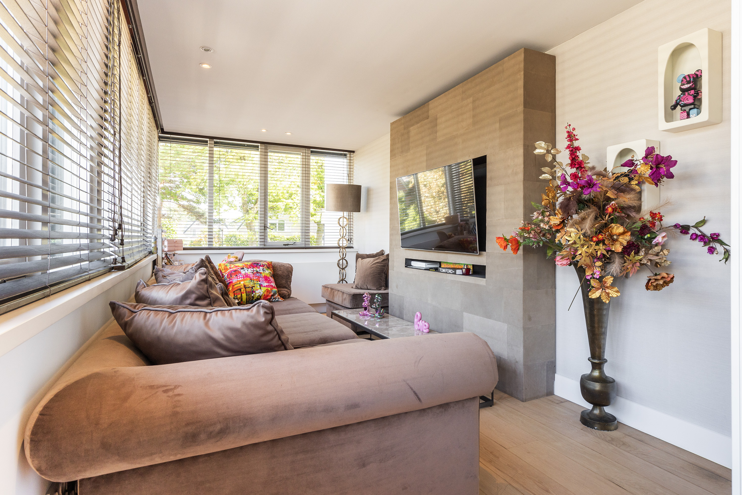 The living room exudes understated luxury, featuring a contemporary gas fireplace, bespoke cabinetry and integrated media system. Large windows seamlessly connect the interior with the garden, creating spectacular play of light throughout the home.