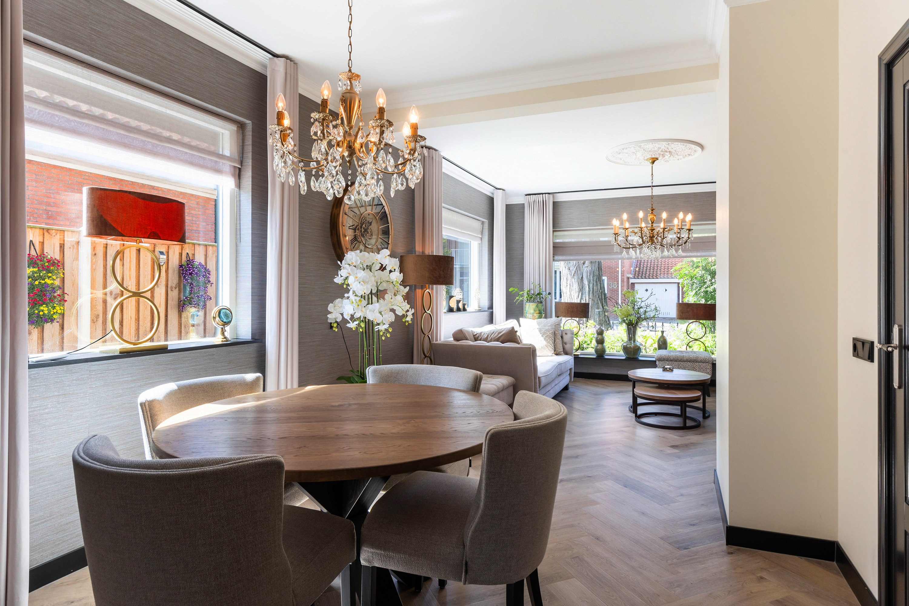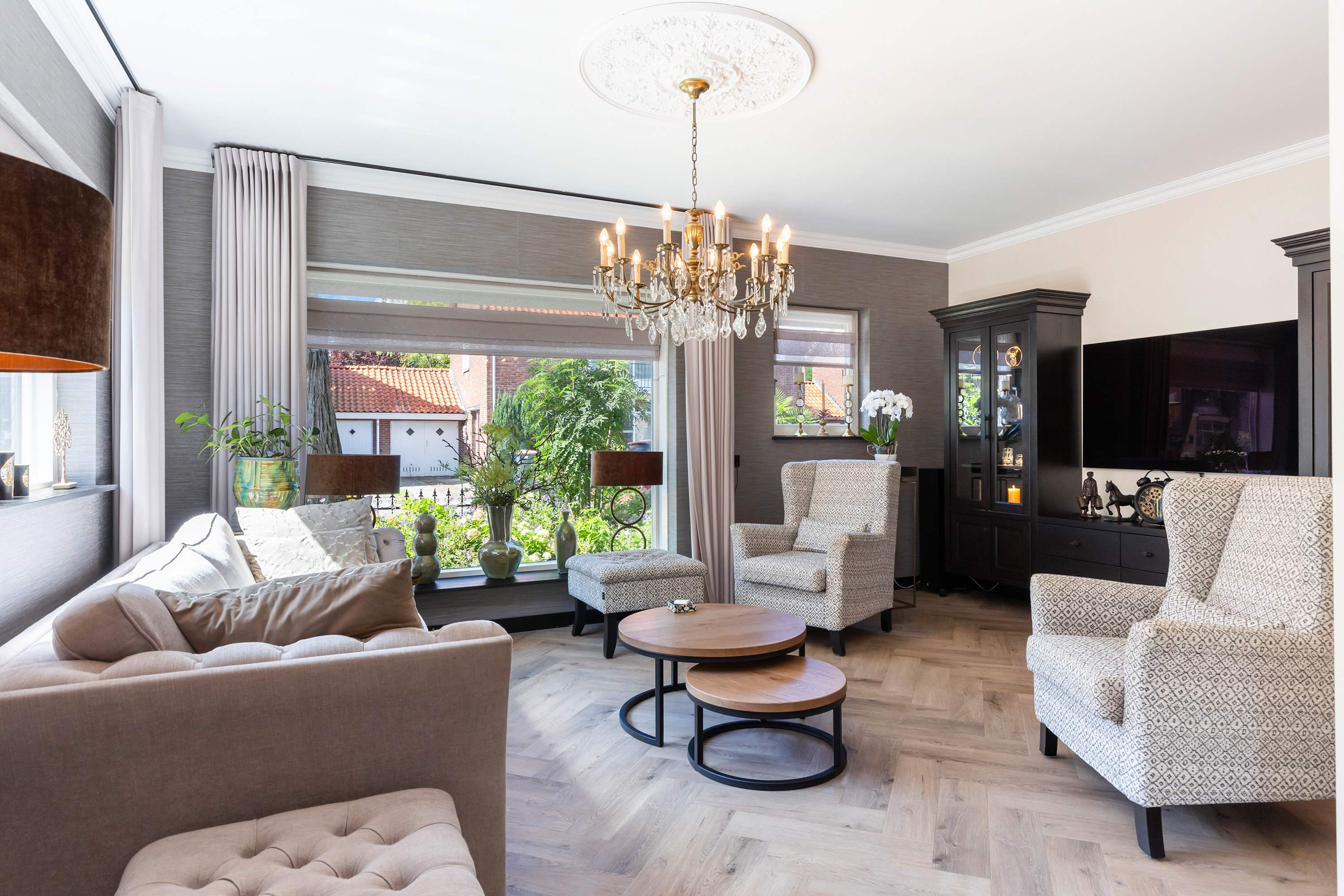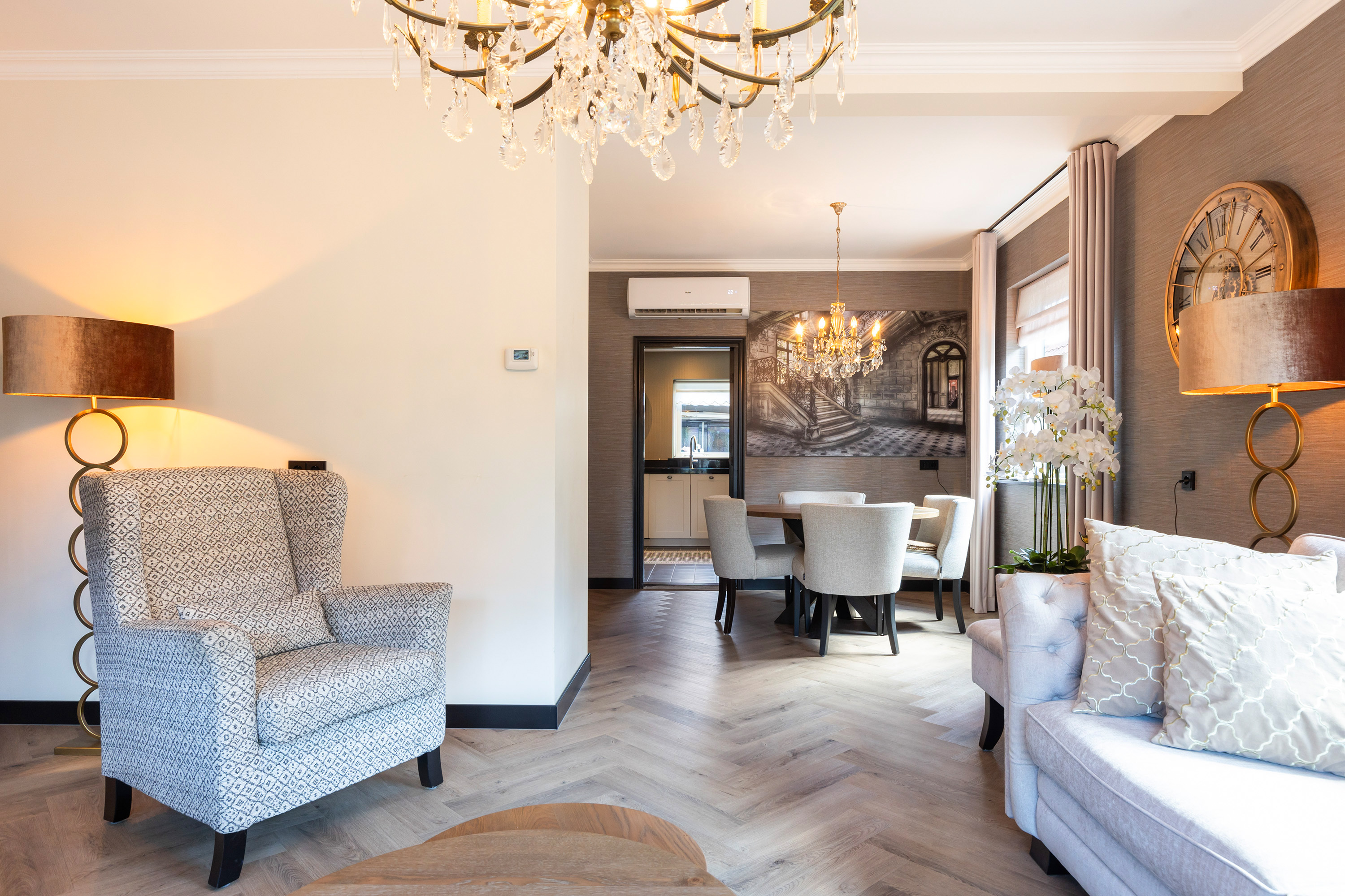 In 2024 is de vloer van de woonkamer vervangen door een Faber gasbetonvloer en voorzien van vloerverwarming, aangesloten op de HR-combiketel. De woonkamer en entree zijn stijlvol afgewerkt met een PVC-vloer in visgraatmotief in de tint white-wash eiken. Wanden en plafonds zijn strak gestuct en voorzien van sierlijsten en ornamenten die de woning extra allure geven.