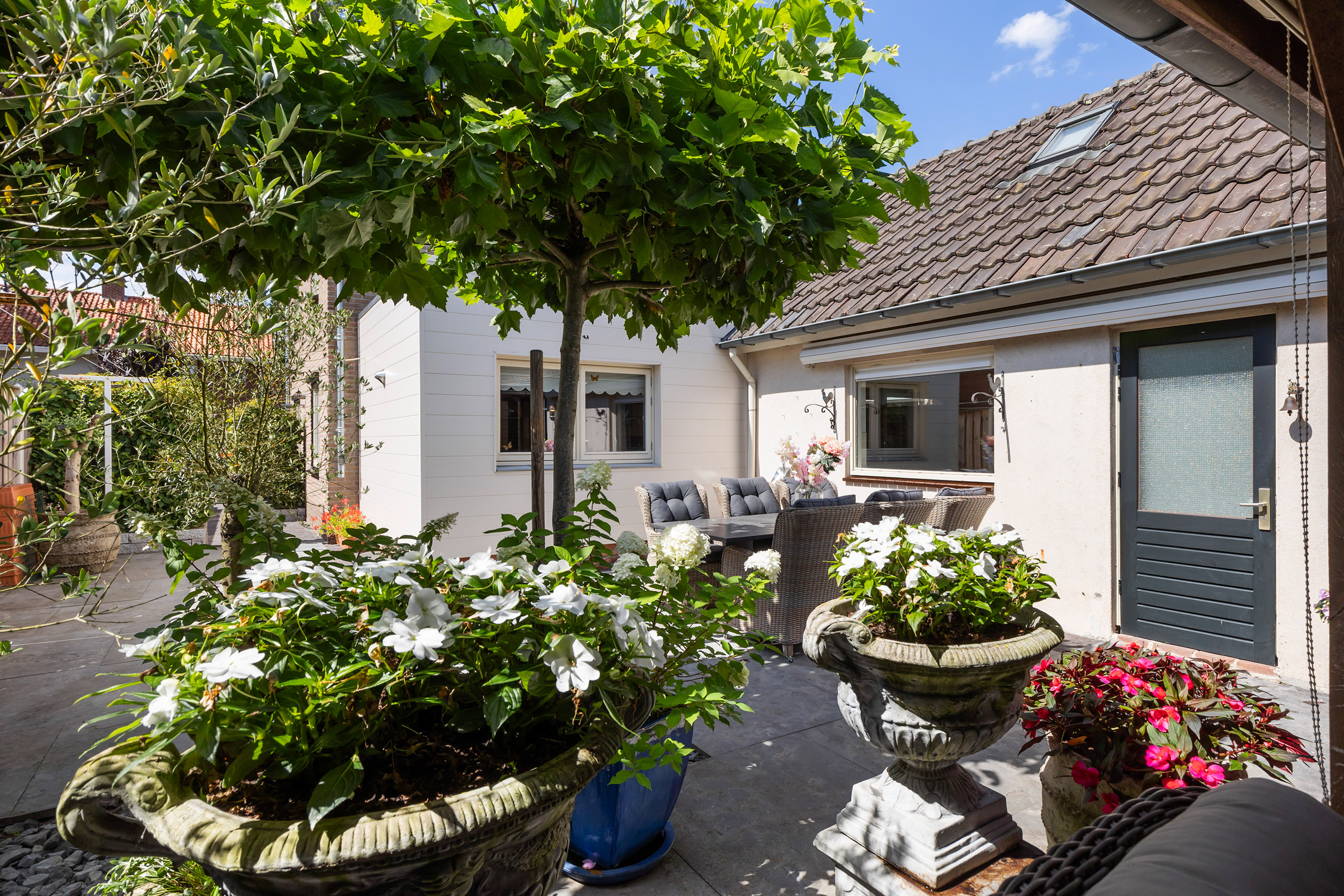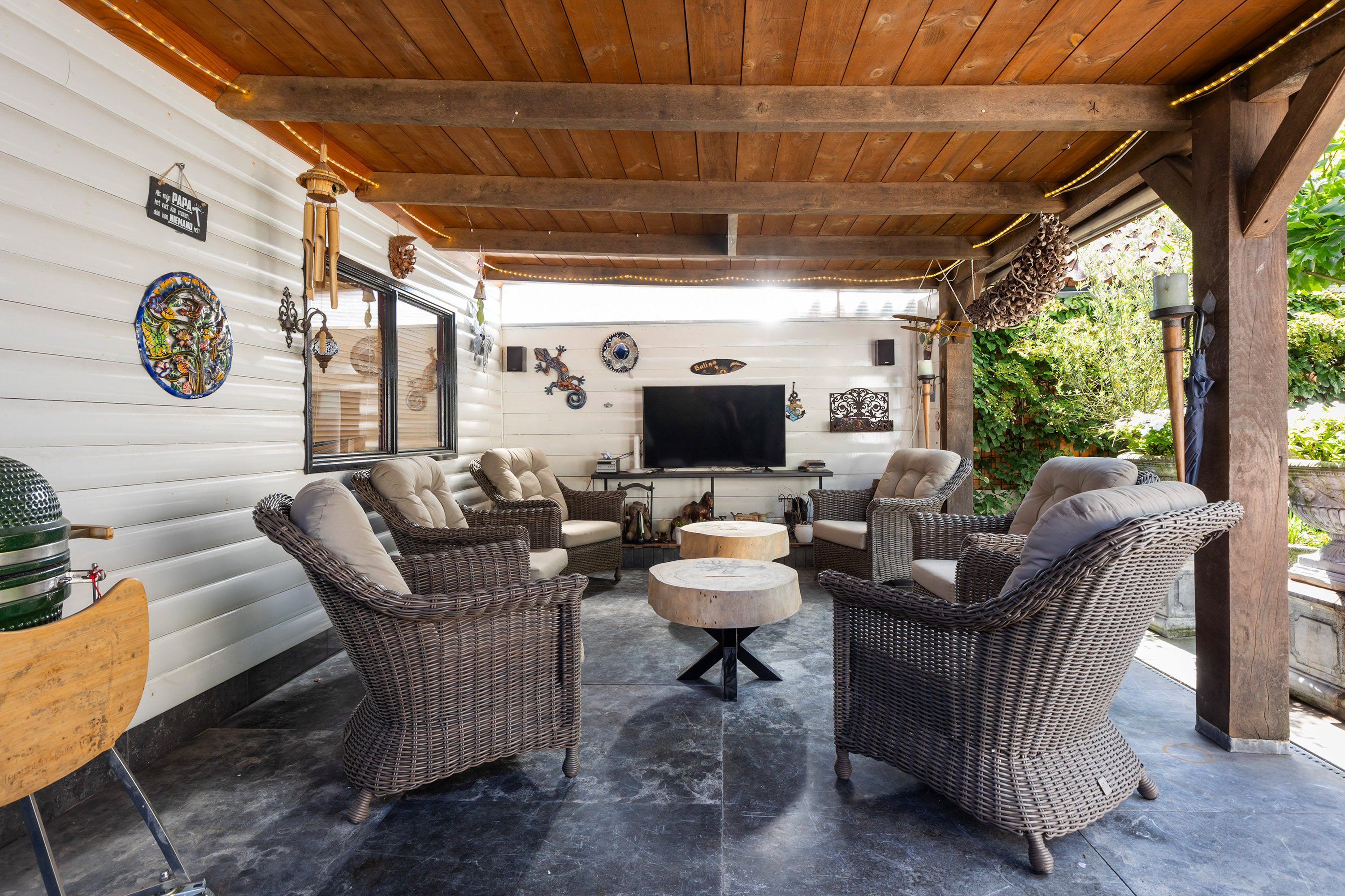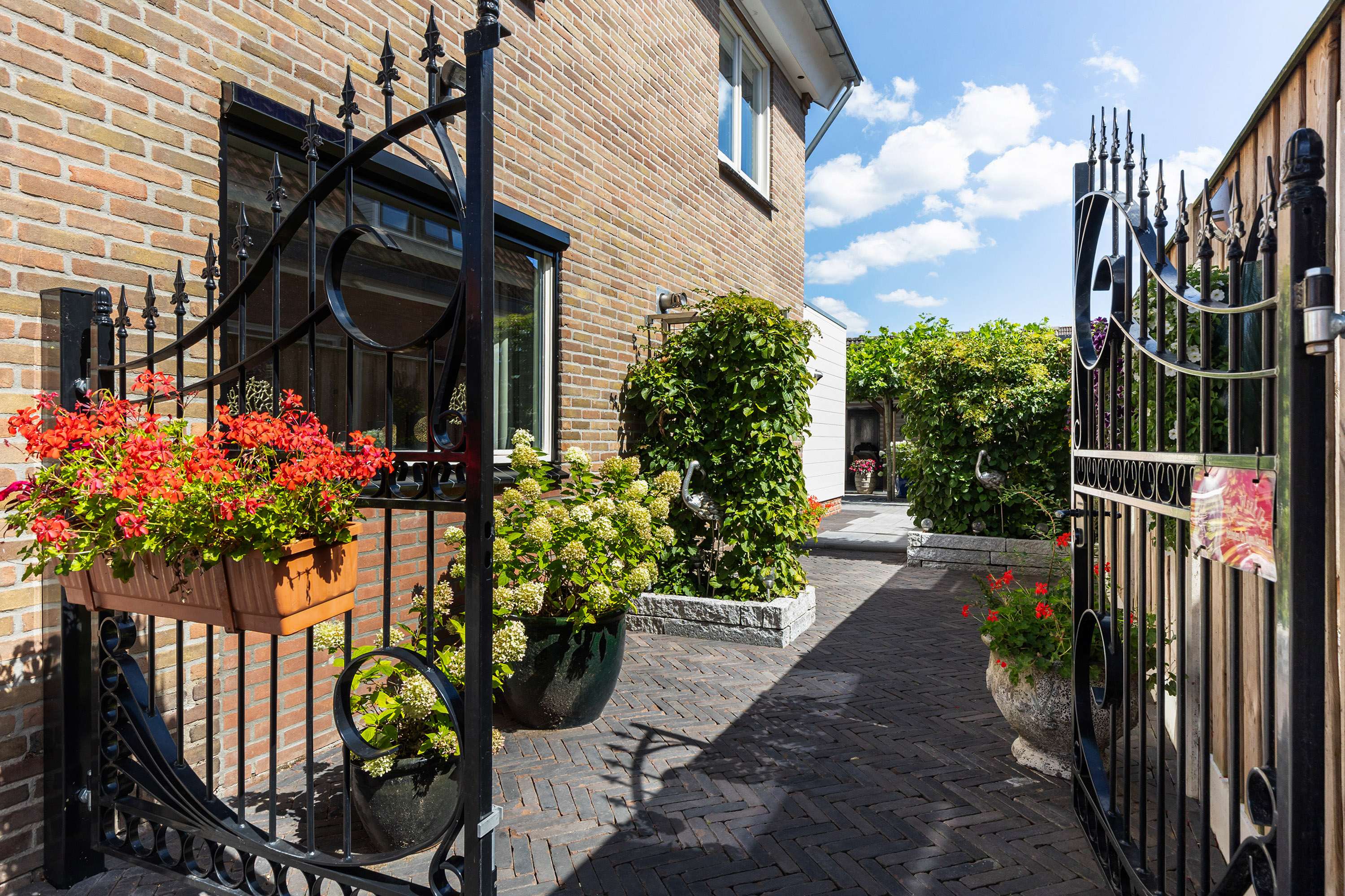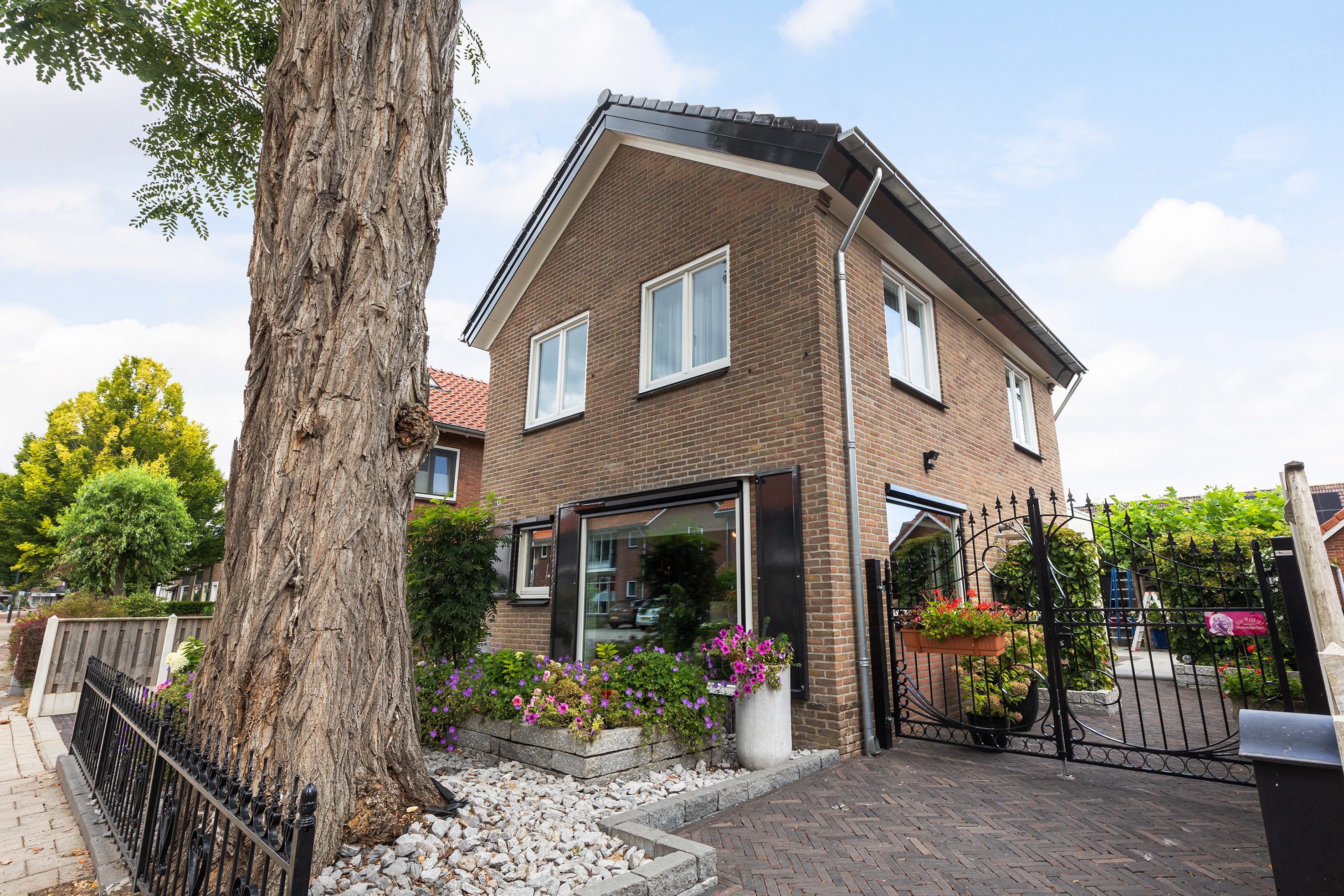 De buitenruimte is minstens zo aantrekkelijk. De fraai aangelegde tuin beschikt over terrassen van blauw hardsteen, granieten plantenbakken en diverse zitplekken. Aan de achterzijde staat een houten schuur met bergvliering met daarvoor een exclusieve veranda vervaardigd uit een robuust eikenhouten constructie en een met EPDM afgewerkt dak: een heerlijke plek om te genieten van het buitenleven en gezelligheid. De erfafscheidingen zijn recent vernieuwd in samenwerking met de buren en bestaan uit schuttingen met betonpalen en hout. Aan de voorzijde siert een acaciaboom de tuin, terwijl een smeedijzeren hekwerk met afsluitbare poort zorgt voor een stijlvolle entree. De royale oprit met klinkerbestrating en carport biedt plaats aan meerdere auto’s.