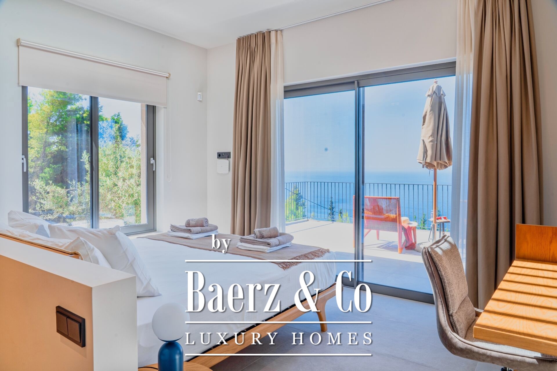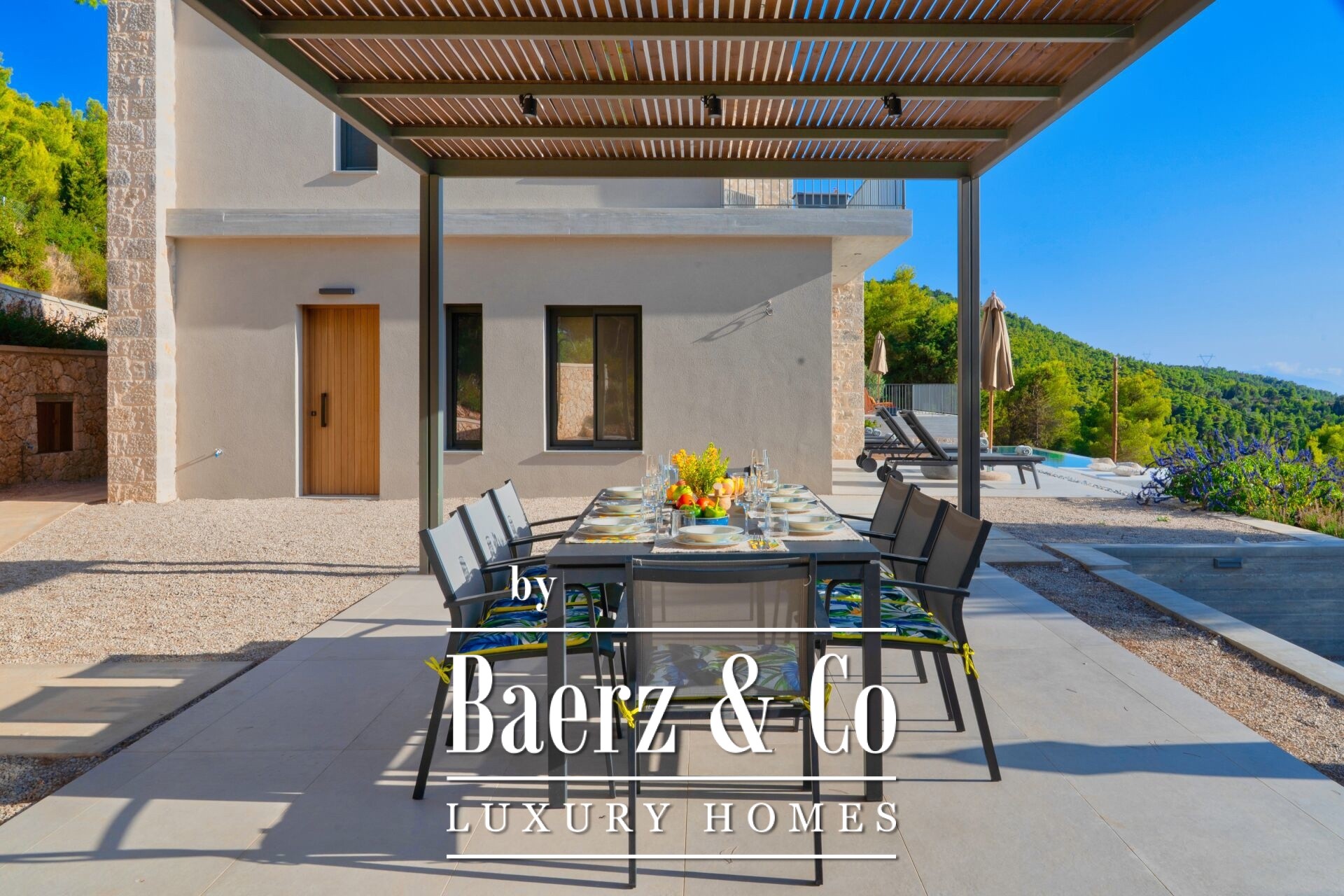 Luxury villa Lefkada is nestled in an expansive pine forest in Apollonio, Greece, just 600 meters from the Ionian Sea. This contemporary 247 m² residence commands panoramic sea, mountain, and nature views from a secluded 4,679 m² private plot, balancing complete privacy with the fresh breeze and subtle pine aromas unique to Lefkada. Crafted in 2024, the villa’s three levels, each at ground level due to the natural terrain, create direct access to the forest and outdoor living. The lower level features a bedroom, bathroom, storage, and an entertainment room designed for quiet retreats or lively gatherings. On the main floor, a generous open-plan living area unfolds, integrating a fireplace, dining space, and a modern kitchen equipped with high-end appliances. The upper floor hosts three master bedrooms, each with an en-suite bathroom, while skylights in two rooms invite natural light to illuminate refined interior finishes.