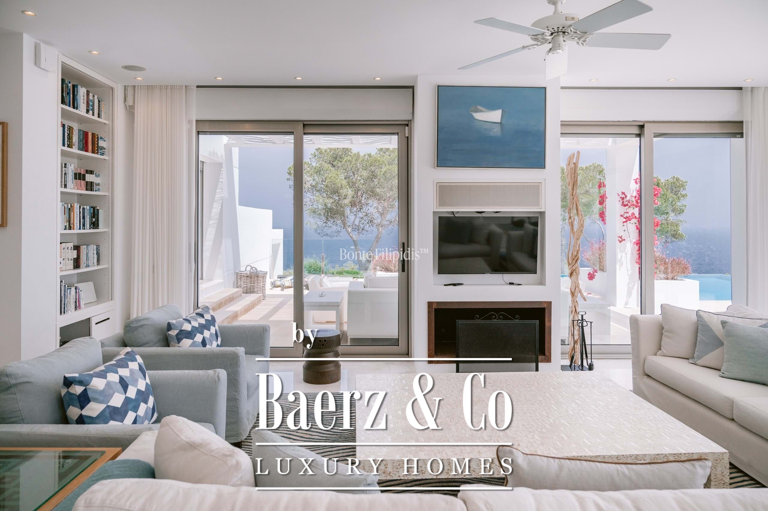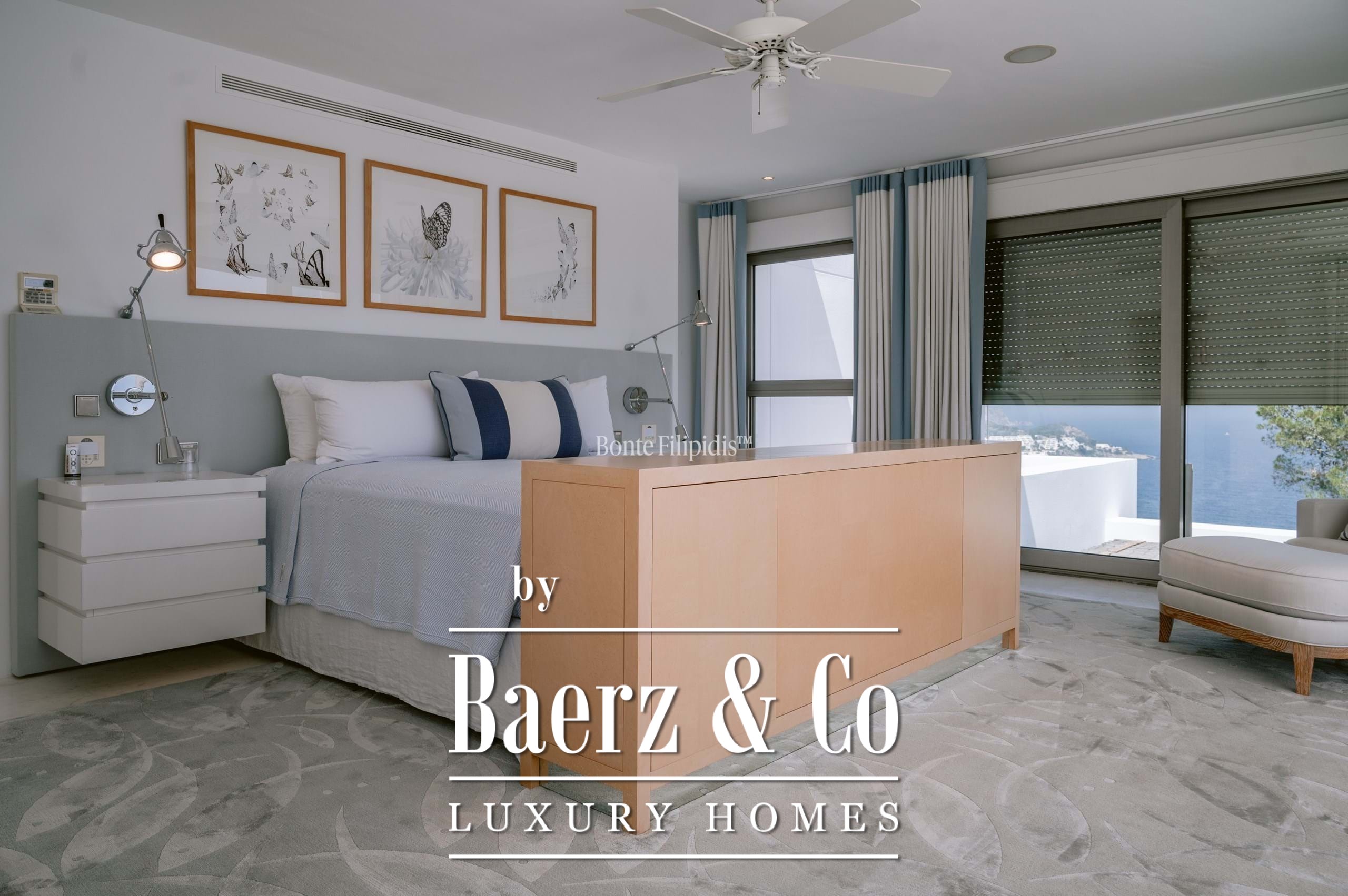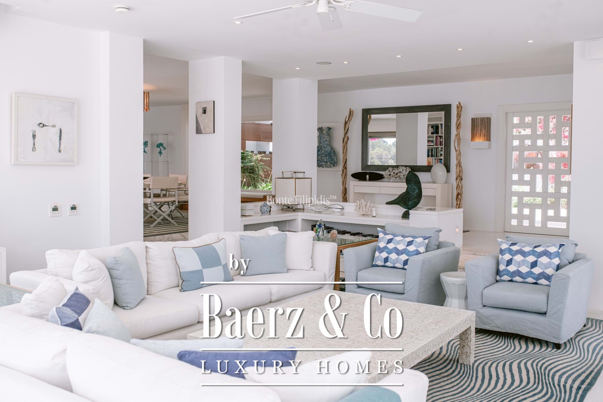 The main house includes a sophisticated primary suite on the upper level with a walk-in wardrobe, a spa-inspired bathroom, and a secluded sea-view terrace. Five guest bedrooms open to the pool deck, providing direct outdoor access and privacy. The independent guest apartment allows for both extended stays and flexible entertaining. Outdoor living is anchored by a saltwater pool, summer kitchen, and broad terraces inviting social and private moments alike.