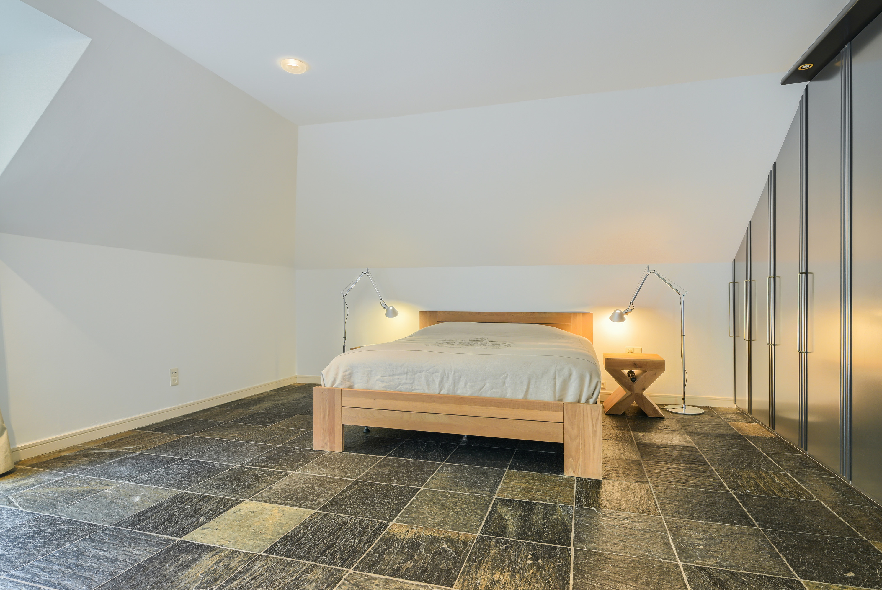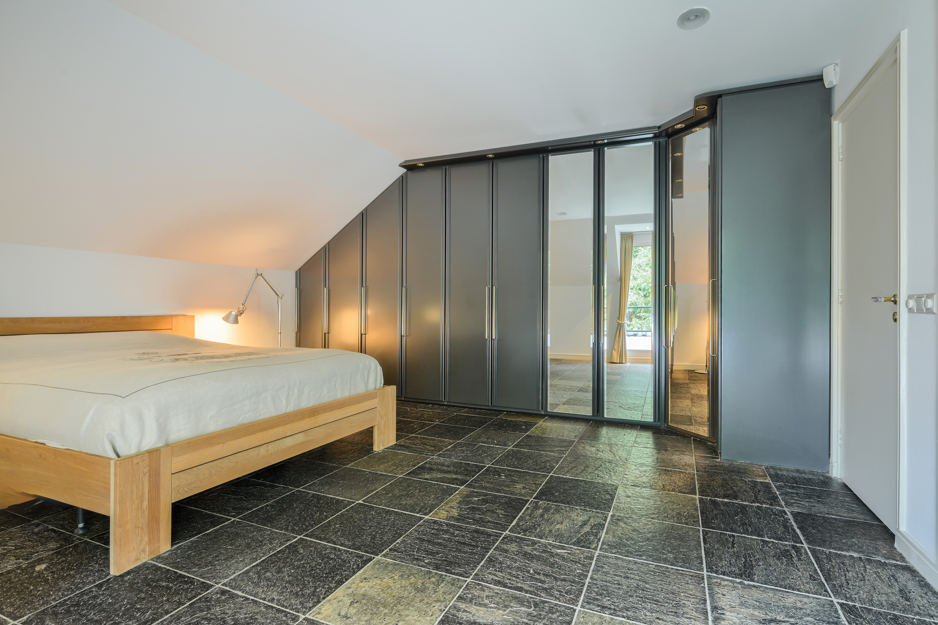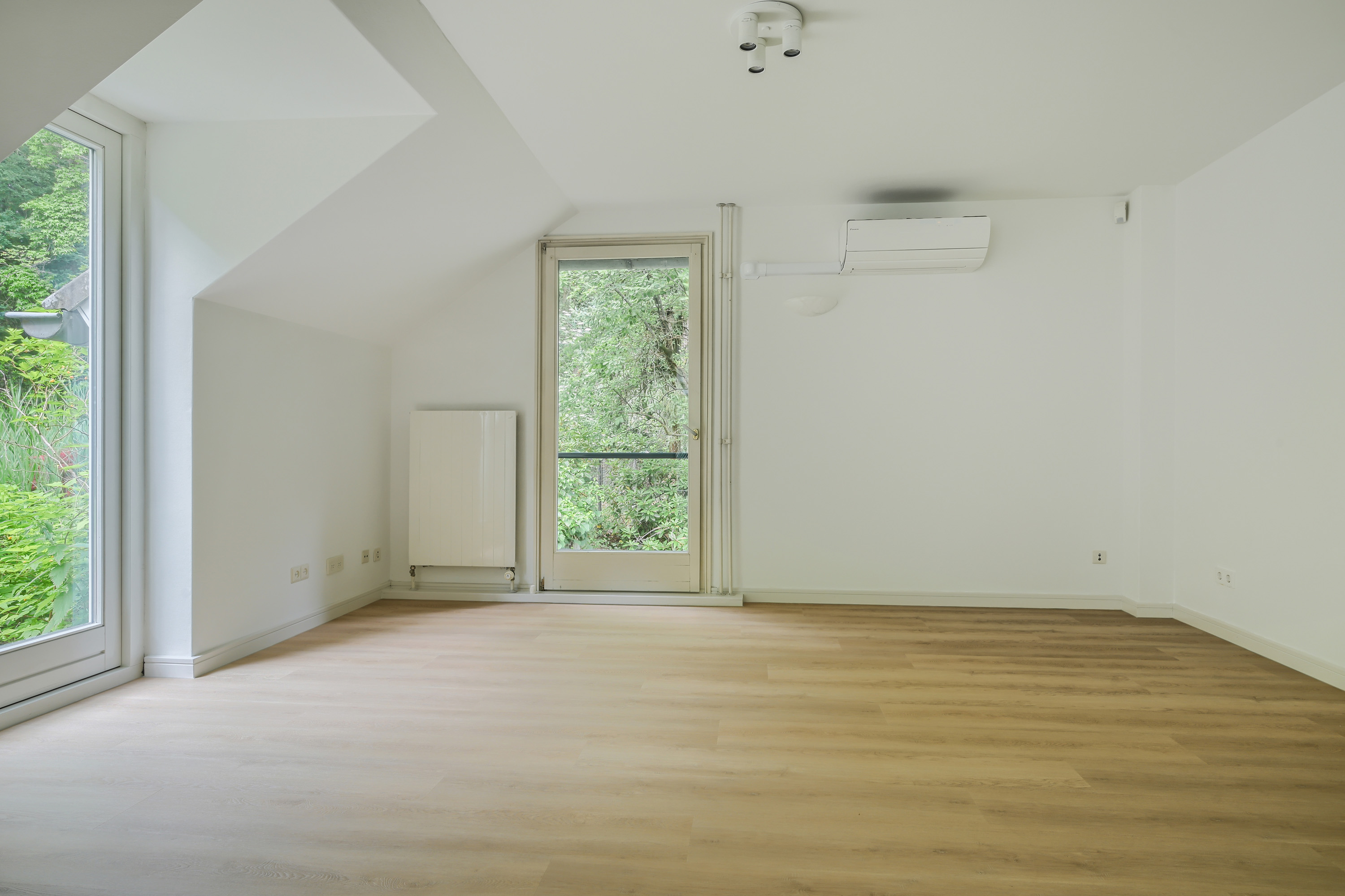 A fantastic, light-filled multifunctional space. This room can be used as a bedroom or divided into two separate rooms. It is also perfect for use as a living area, office, studio, etc. A large dormer window is located at the front, and a sliding door at the rear offers stunning views of the surrounding garden and woods. The sliding door opens onto a spacious flat roof, which could be converted into a large rooftop terrace with fantastic garden views.