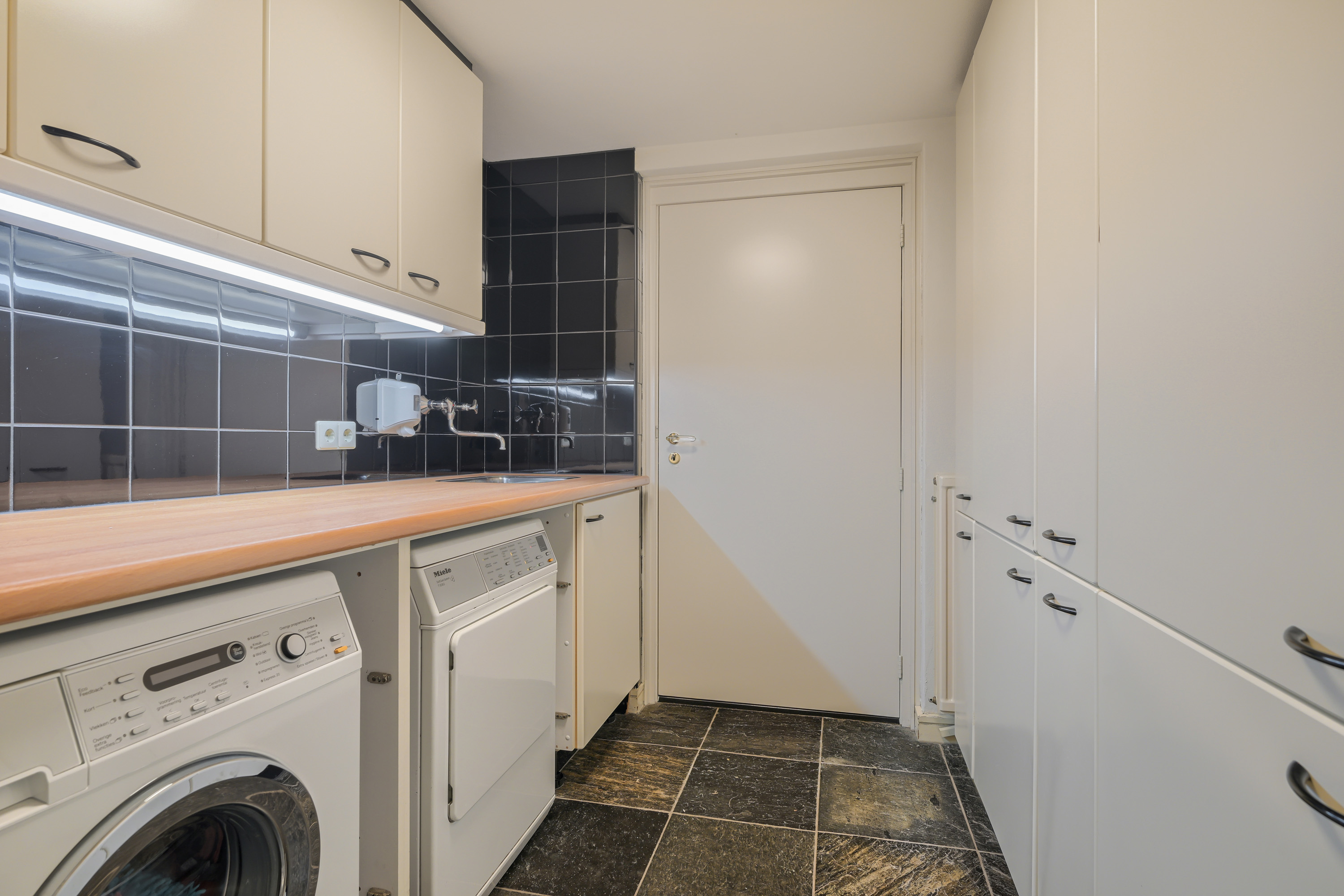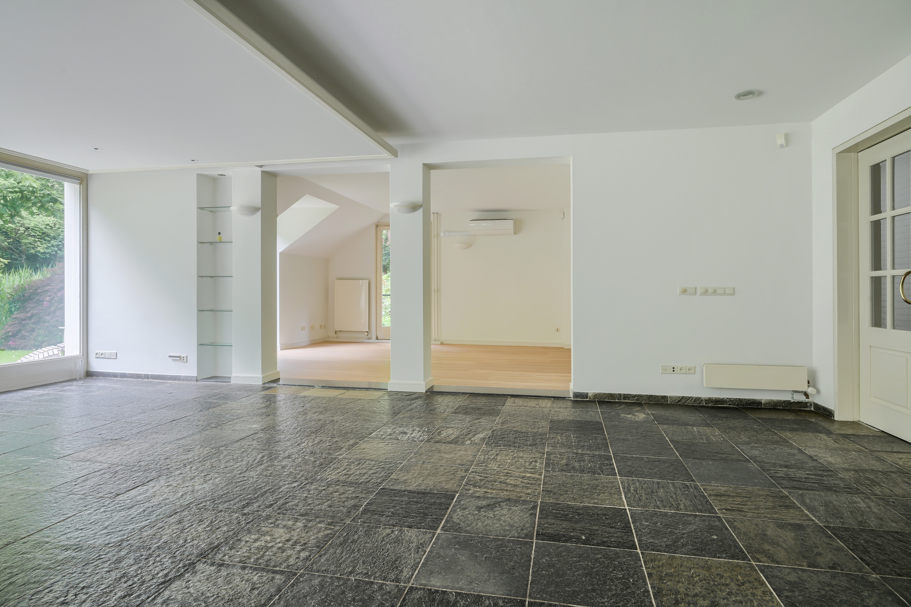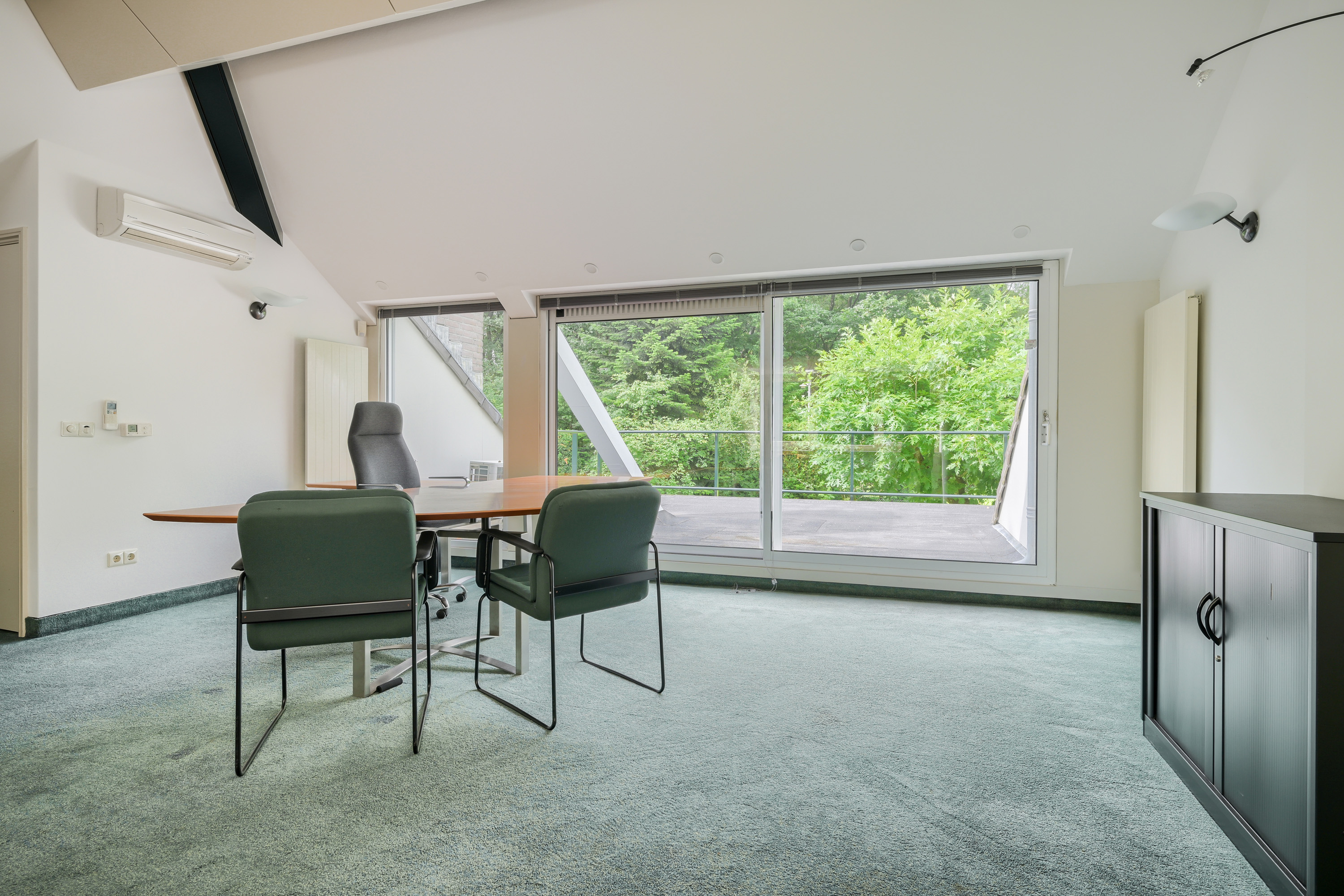 Beautiful living or working space with garden and terrace views. This bright room features large windows and is situated at the front of the house. A built-in cupboard contains the floor heating distribution unit.