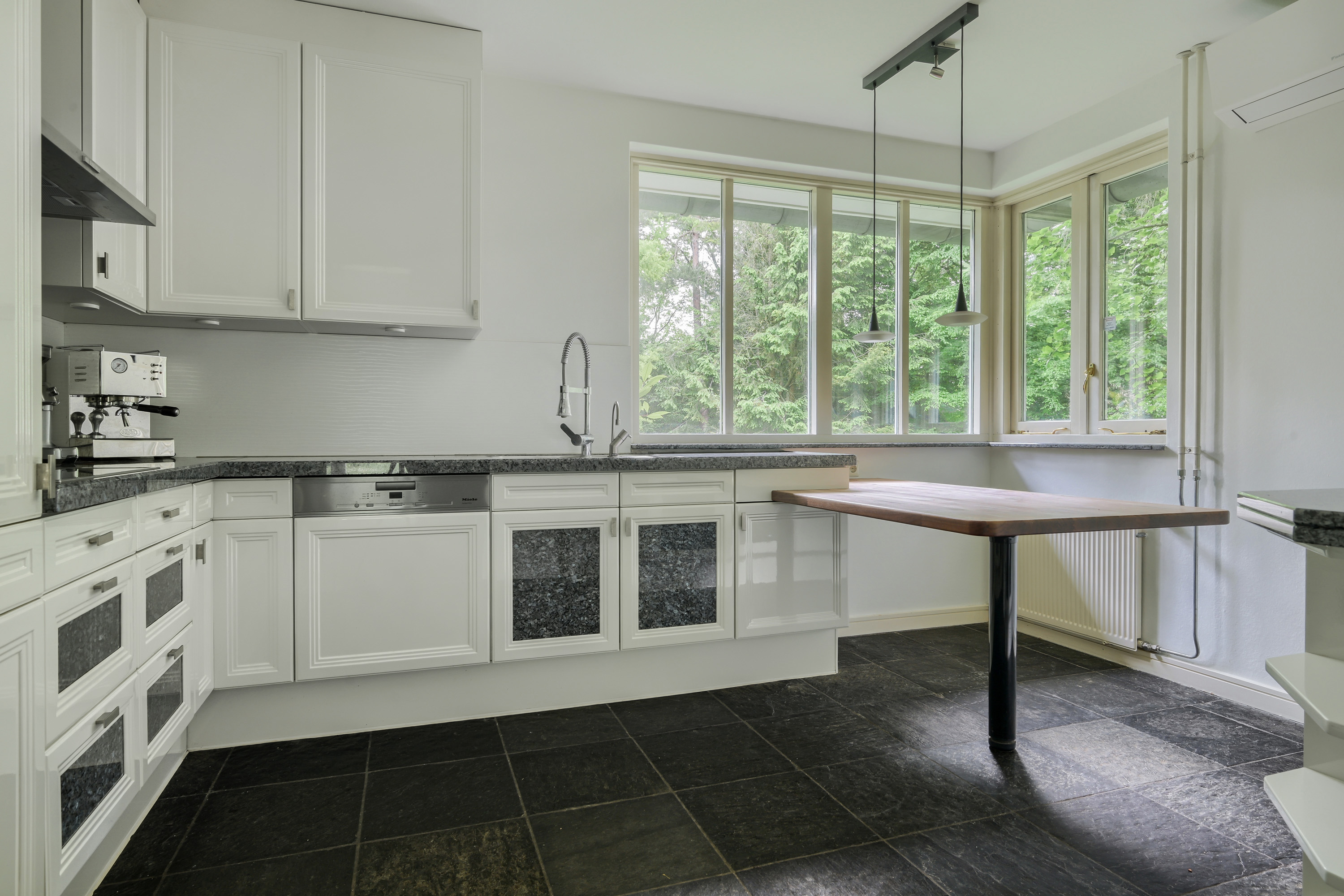 Features include a granite countertop with 1½ stainless steel sink and Quooker tap. Appliances include a dishwasher, induction hob, stainless steel extractor, refrigerator, two ovens, and a built-in espresso machine. The kitchen also features a dining area and a wall unit with countertop and ample cabinet space.