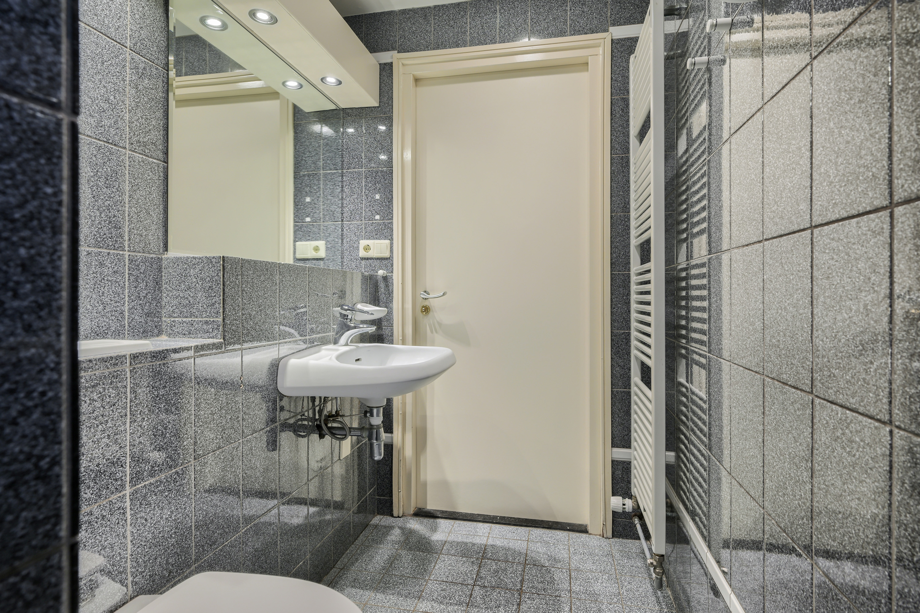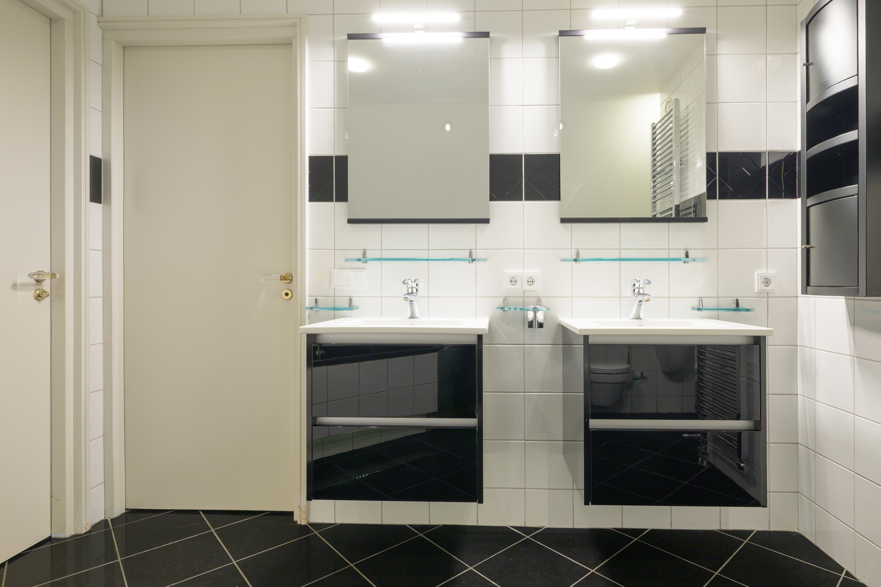 The bathroom is fitted with a bathtub, wall-hung toilet with built-in reservoir, urinal, bidet, walk-in shower, designer radiator, and a double washbasin integrated into a vanity unit. This bathroom can also be accessed directly from the corridor.