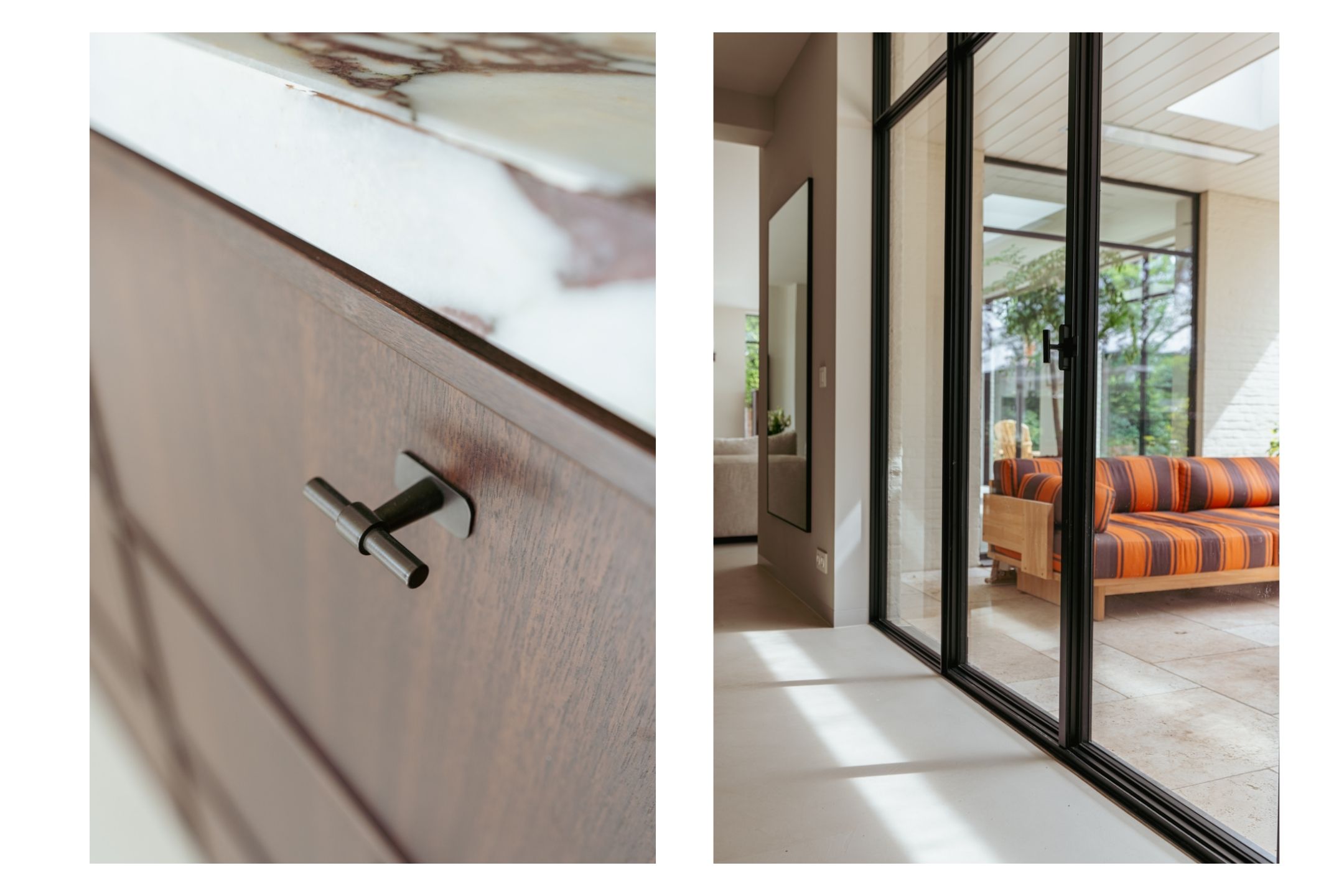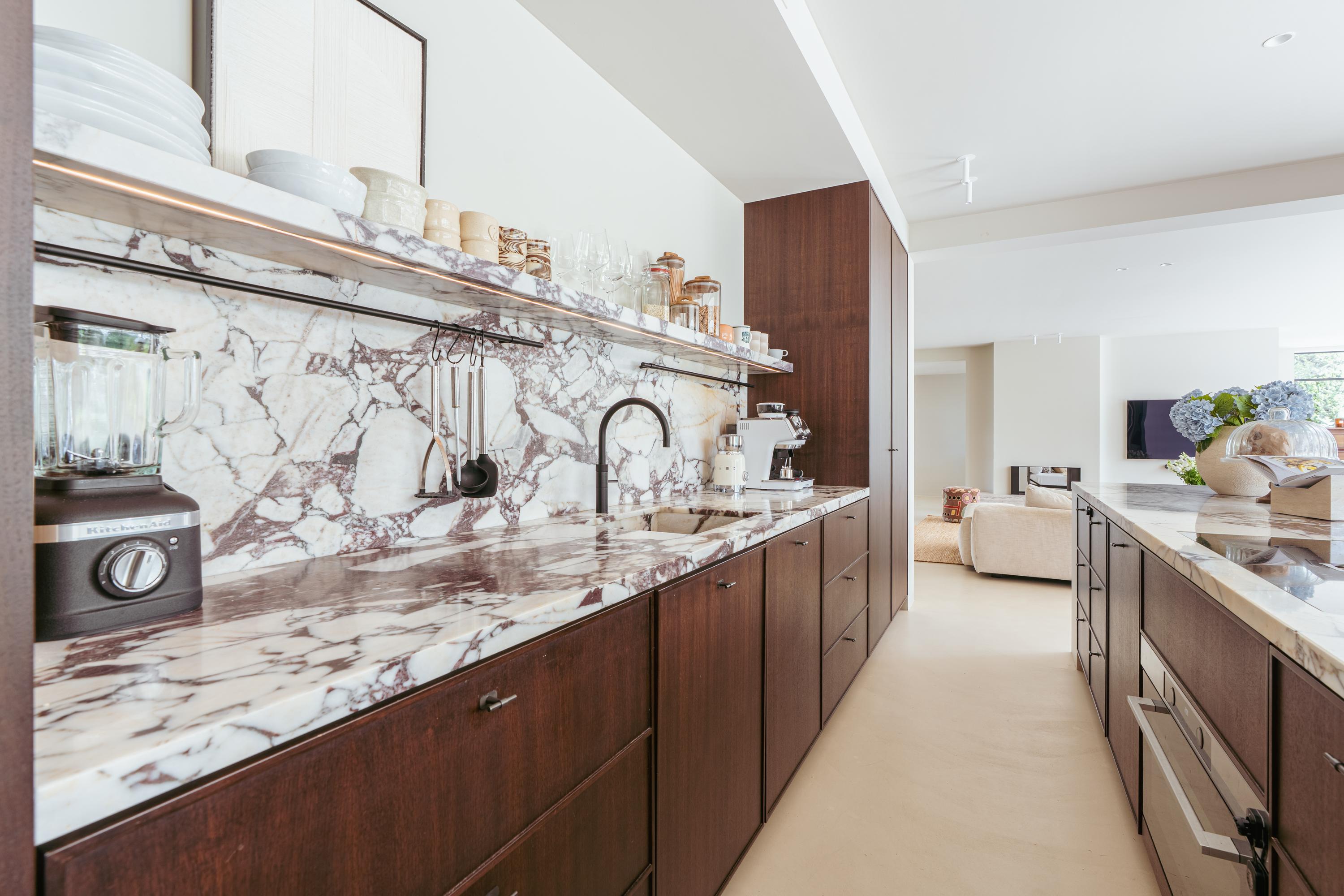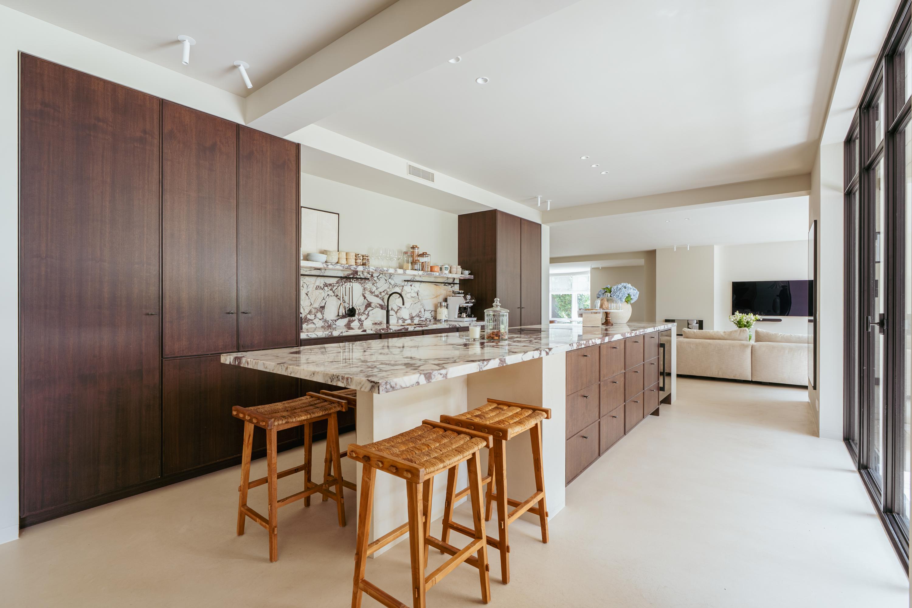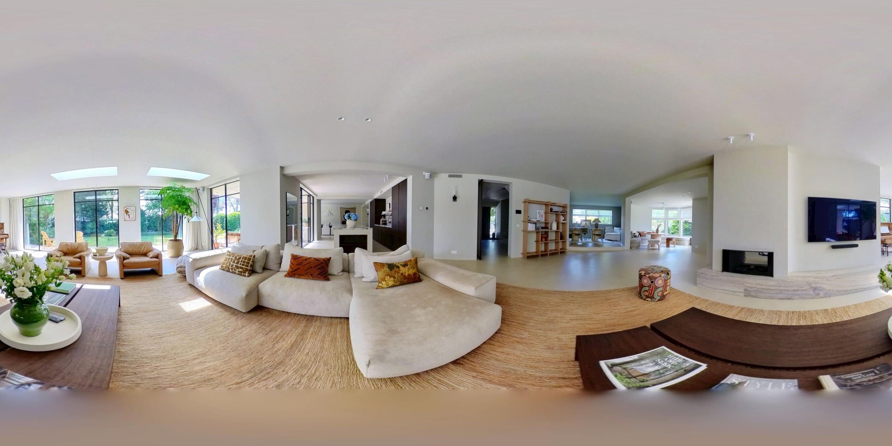 The expansive living room, featuring floor-to-ceiling windows and a stunning round bay window, is bathed in natural light, instantly creating a sense of space and tranquillity. The elegant fireplace forms a central feature of the open-plan living area, which flows seamlessly into the luxurious kitchen. The kitchen is equipped with high-end built-in appliances and modern conveniences, including a generous island of approx. 5 metres, Quooker tap, dishwasher, fridge/freezer combination, and an induction hob with integrated extractor. The exclusive book-matched marble worktop extends into the sink, giving the kitchen a refined and sophisticated finish. French steel doors open onto the delightful covered terrace and beautifully landscaped garden. Adjoining the kitchen is the spacious dining room.