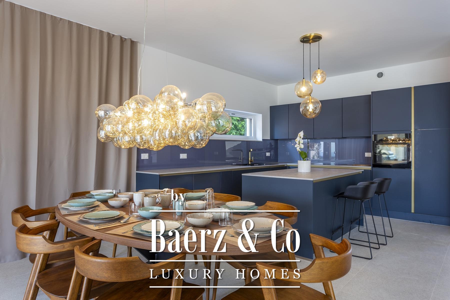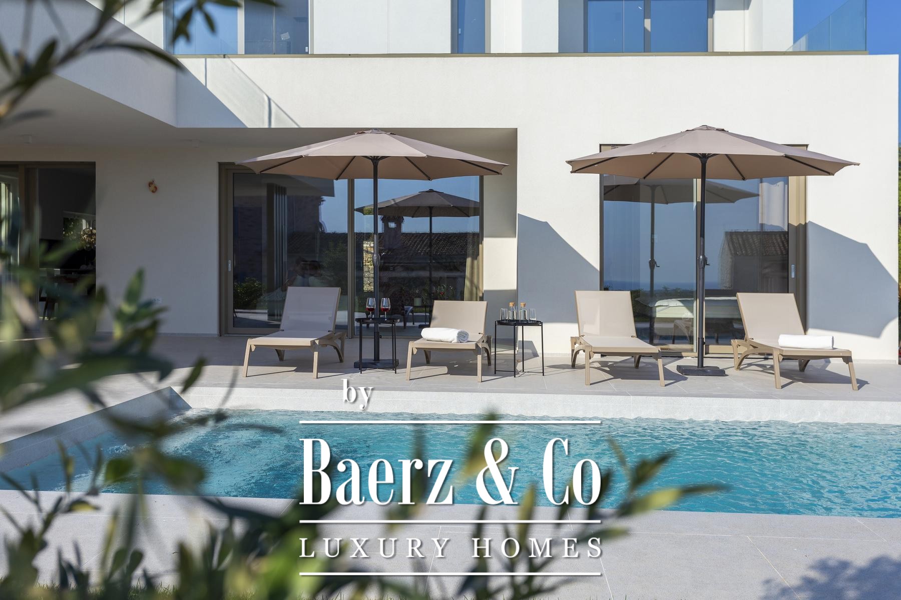 The open-plan living area unites a dining room with a fully equipped kitchen, fitted with premium appliances from respected global manufacturers. Designer furnishings in the lounge are custom-made for the villa, offering both comfort and direct views of the sea. Floor-to-ceiling glazing ushers in natural light, connecting seamlessly to a generous covered terrace—an ideal setting for entertaining, edged by manicured gardens, a 30 m² swimming pool, and further sea vistas. An outdoor barbecue extends the alfresco experience.