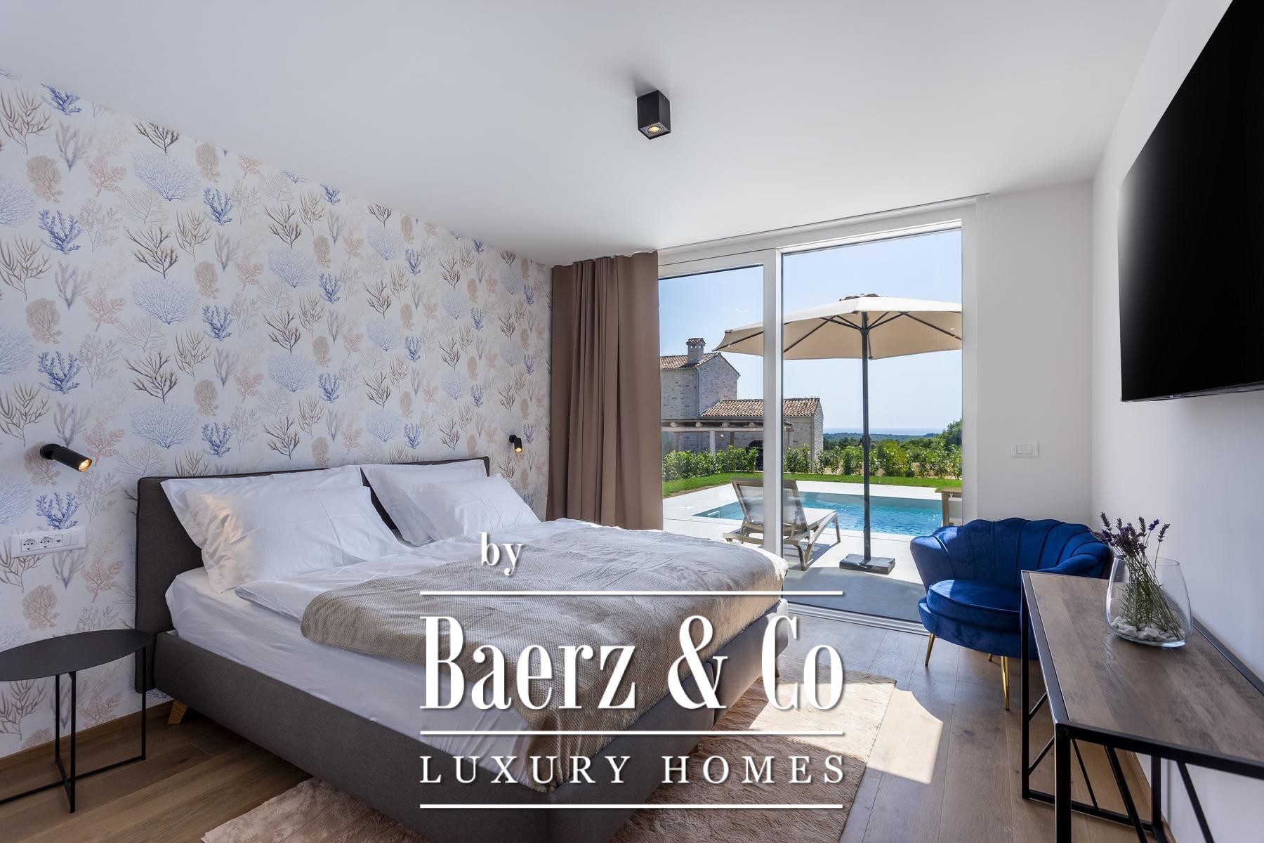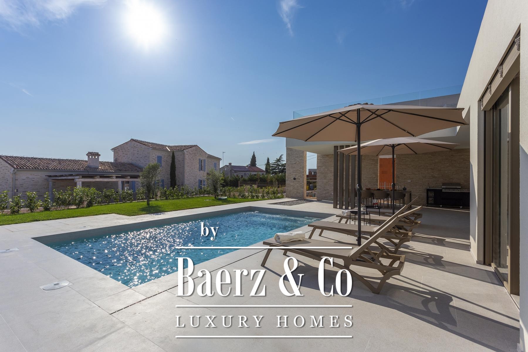 Villa Bale Croatia stands at the meeting point of timeless architecture and contemporary comfort. This designer villa occupies a 228 m² living area across two floors, positioned on a fenced 688 m² plot in the tranquil village of Čubani, between Bale and Rovinj. The entry reveals a considered lobby that divides private quarters from living spaces, lending an inviting sense of flow.
