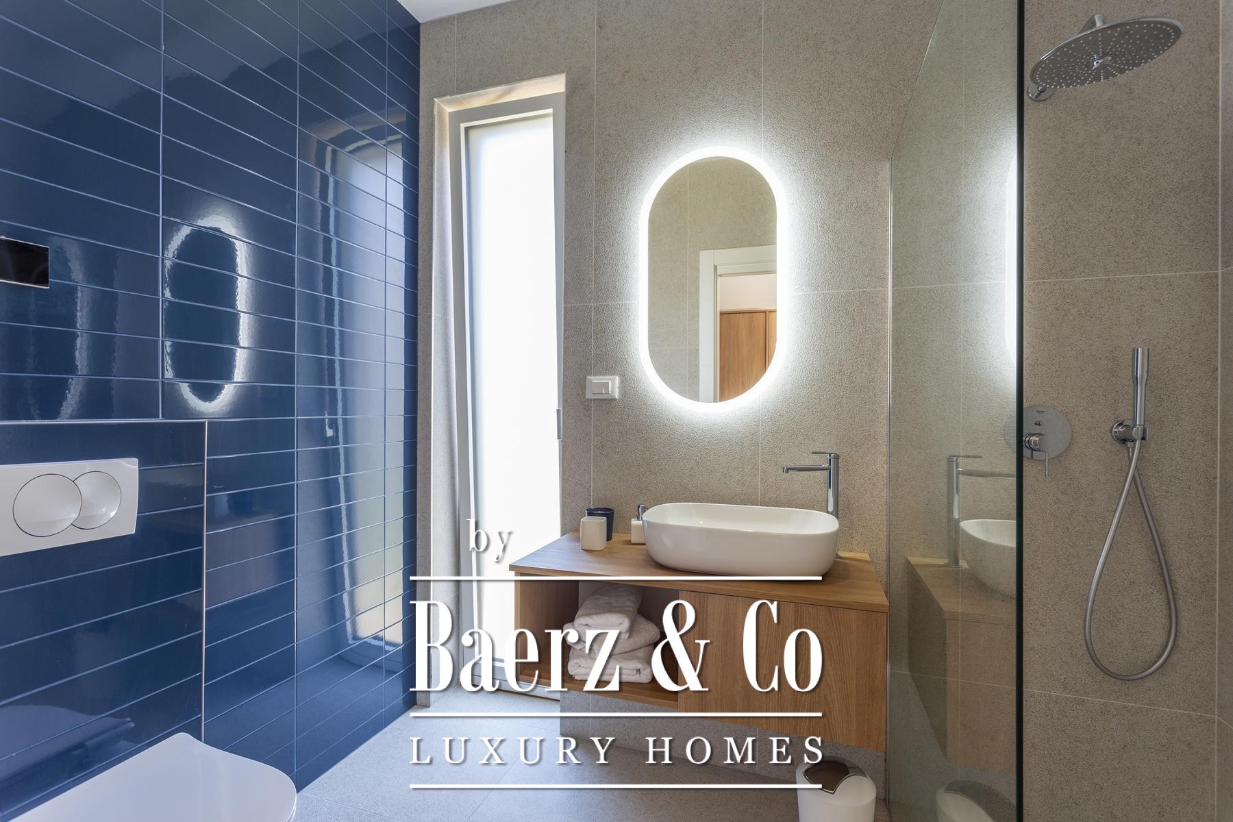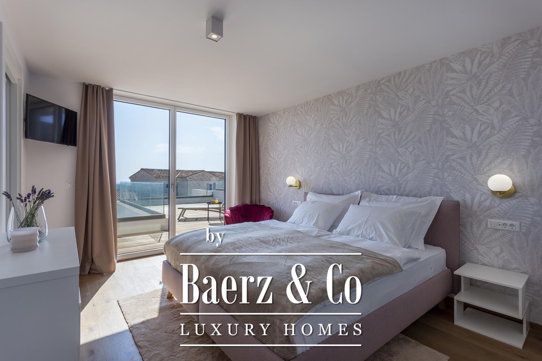 The private ground floor quarters include a bedroom with ensuite bath, a technical room, and storage. Ascending the interior staircase, the first floor presents three additional bedrooms, all ensuite and with access to a spacious terrace overlooking the Adriatic, set up for a future jacuzzi. Underfloor heating, quality parquet, and high-grade ceramics elevate the living environment, complemented by air conditioning in every room.