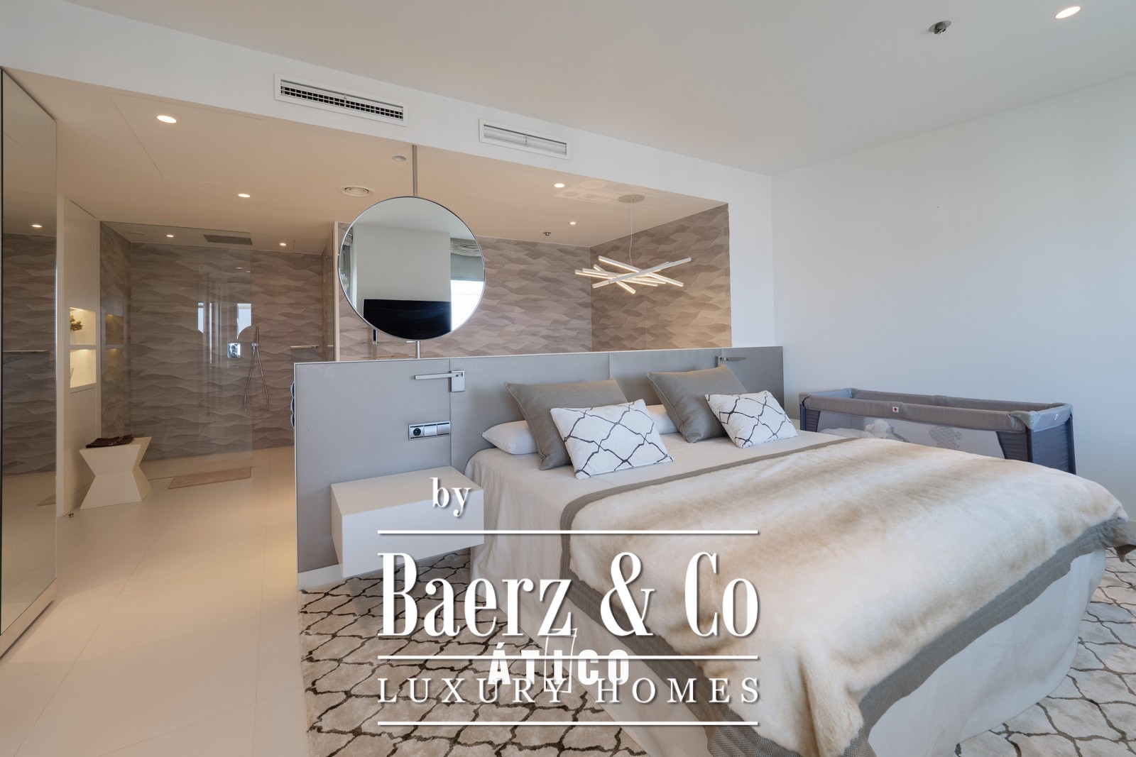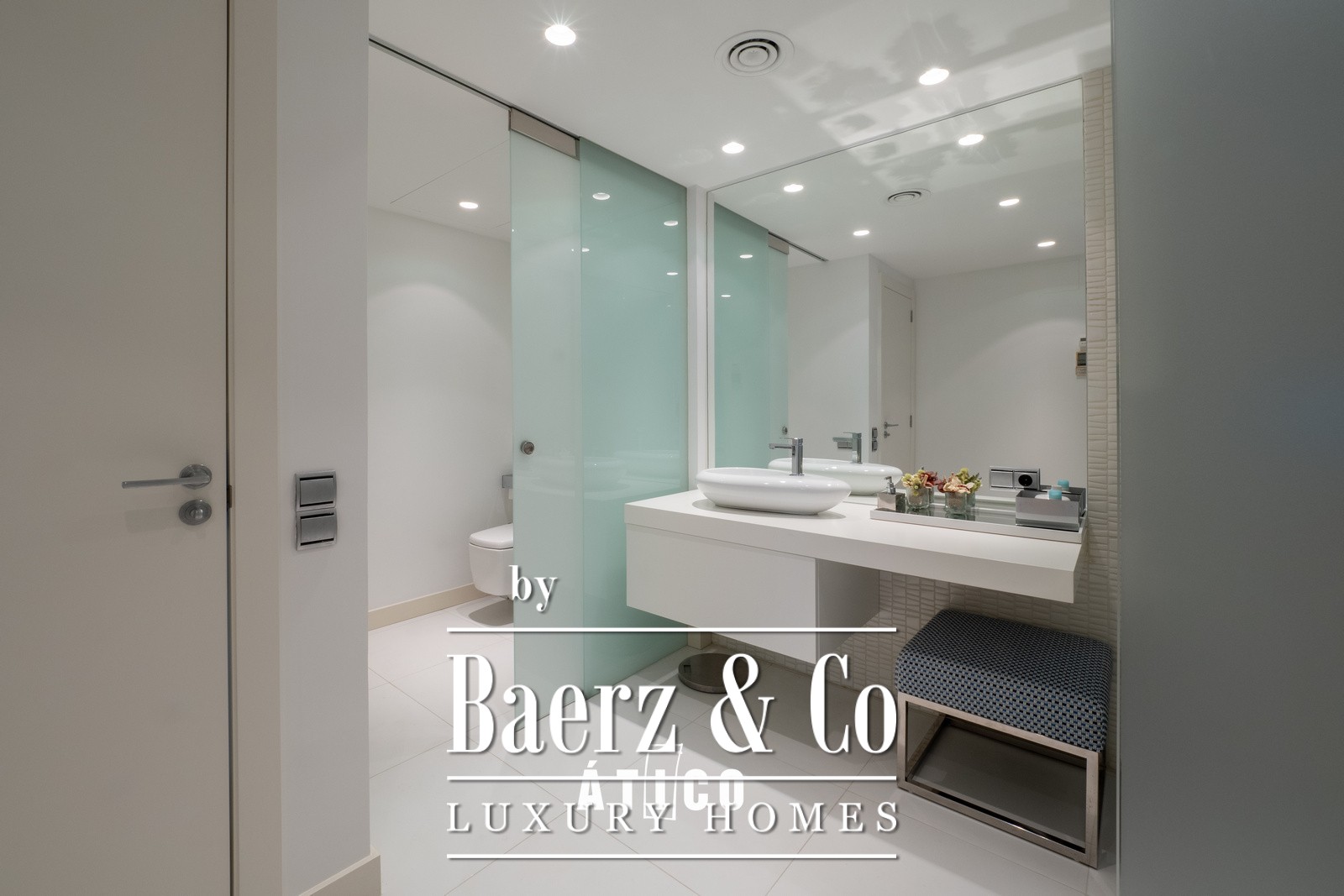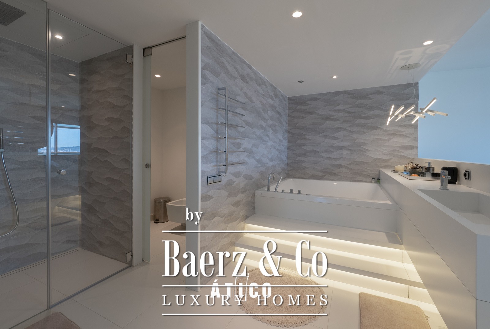 The living room is suffused with natural light, courtesy of large windows, and flows seamlessly out to a terrace that encircles the residence. Here, a private pool invites a quiet pause above the cityscape, while the surrounding sound of waterfalls and views of Barcelona bring a sense of calm vitality. An integrated kitchen features stainless steel and quartz, contemporary in both form and function, supporting relaxed entertaining or quiet dinners at home.