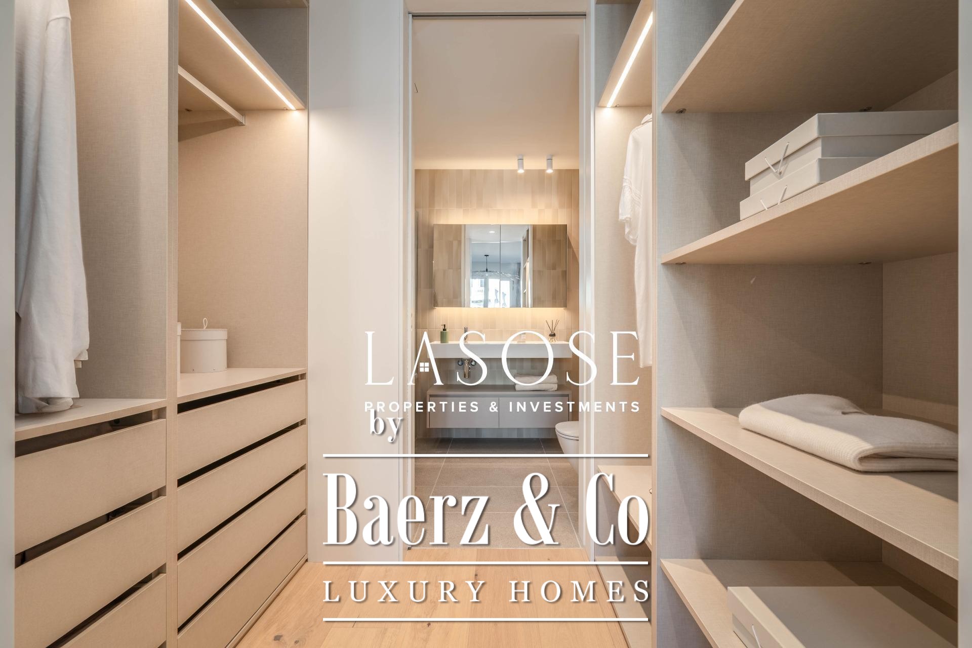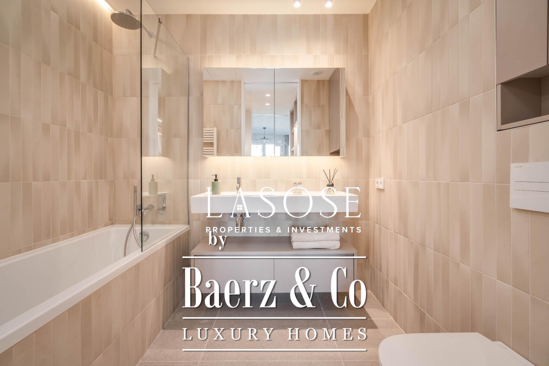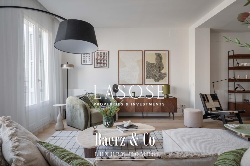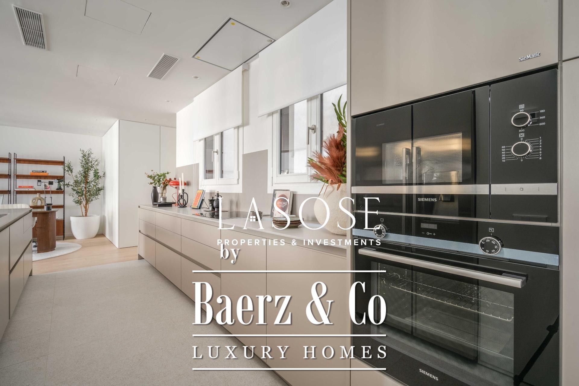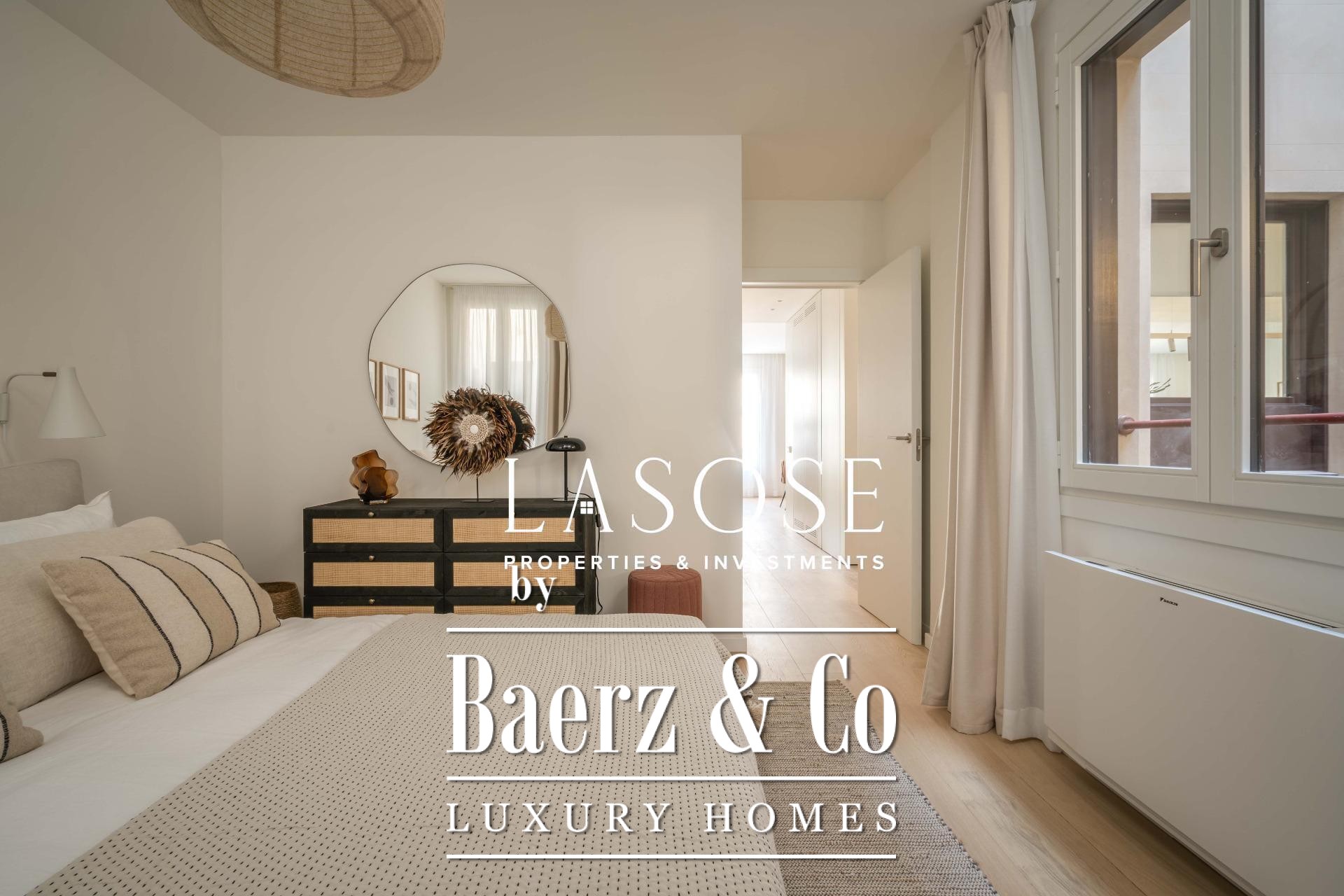 This particular residence offers 137 m² of living space, thoughtfully arranged with two bedrooms and three bathrooms. Balconies and a generous terrace connect interiors to the pulse of the city, while the building’s façade and communal areas reflect the elegance of classic Barcelona. Interior finishes, designed by Estudio Vilablanch, balance modernity with enduring style, featuring premium appliances, expansive wardrobes, heating, and a refined light-filled atmosphere.
