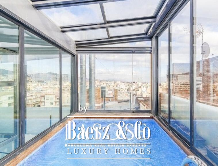 Above, the private rooftop terrace serves as an exclusive urban vantage, featuring a heated, glass-enclosed swimming pool for year-round enjoyment and a dedicated bathroom. 360º city views create a constant dialogue with Barcelona beyond.