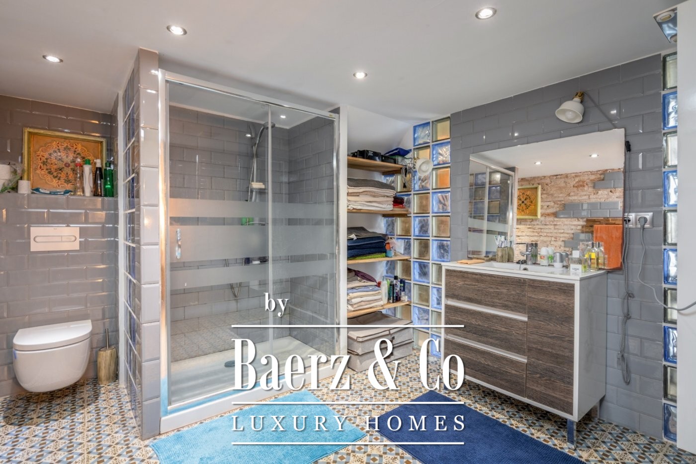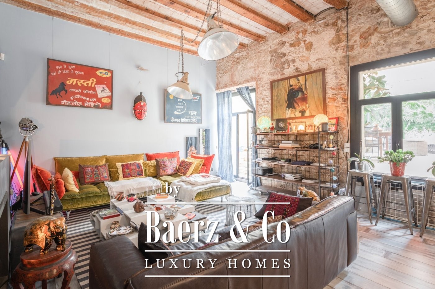 . . This catalan style apartment consists of 218 m2 plus 74 m2 of private terrace with pool. Upon entering, we find a corridor with huge windows that overlooks a large interior patio offering the space plenty of natural light. Ithis area connects the three double bedrooms; each one with its private bathroom, and another room that acts as a large multifunctional space that can perfectly be used as an office space.. . Following the corridor we find the day area, a huge and spacious space with very high ceilings up to 5 meters, composed of a large open kitchen, original brick walls and tiles, a toilet and a beautiful living room with a (wood) fireplace from which you can access the wonderful terrace with a pool shared with the neighbour next door. The terrace is private and is recently restored with new roofing to guarantee privacy. The whole house was completely renovated keeping original elements and decorated with great